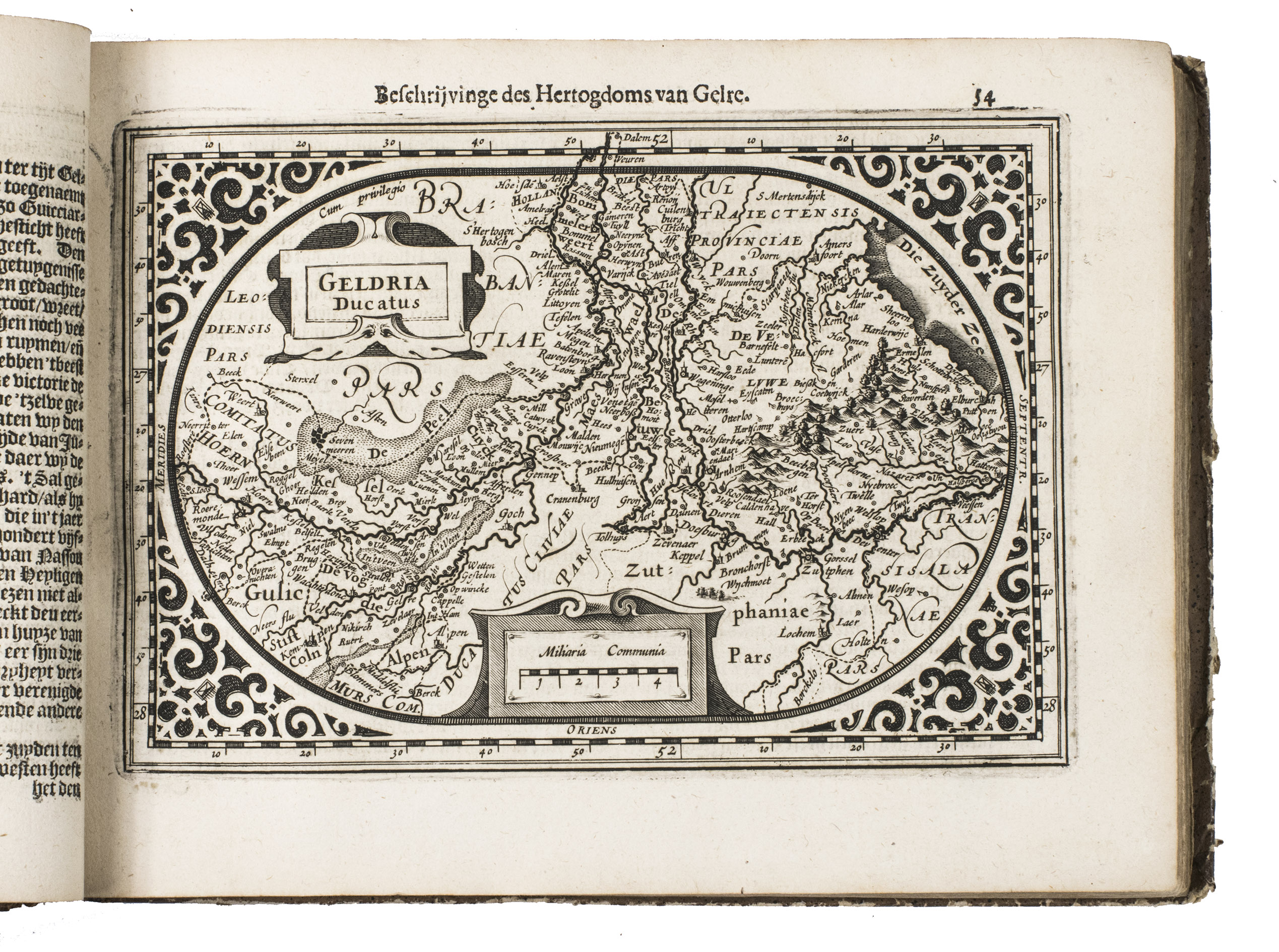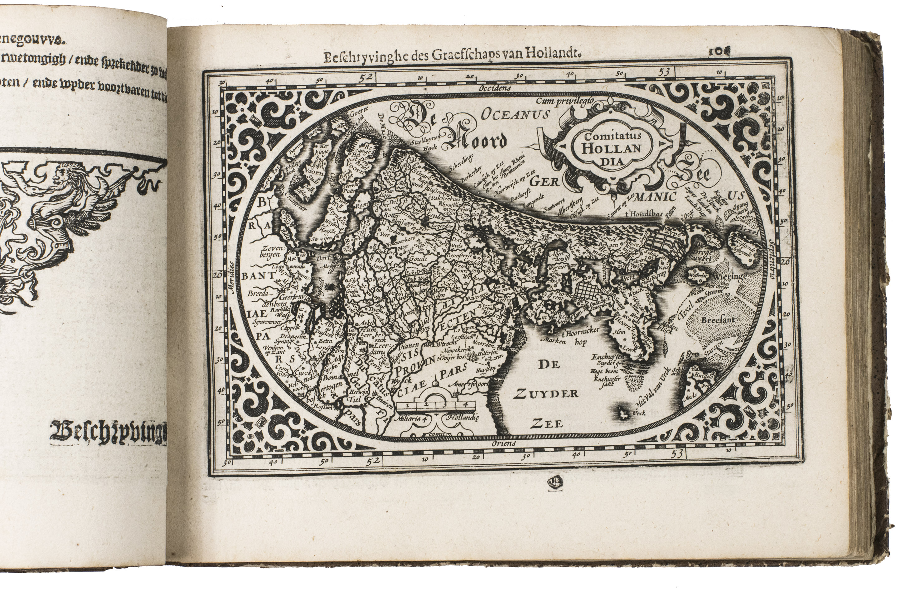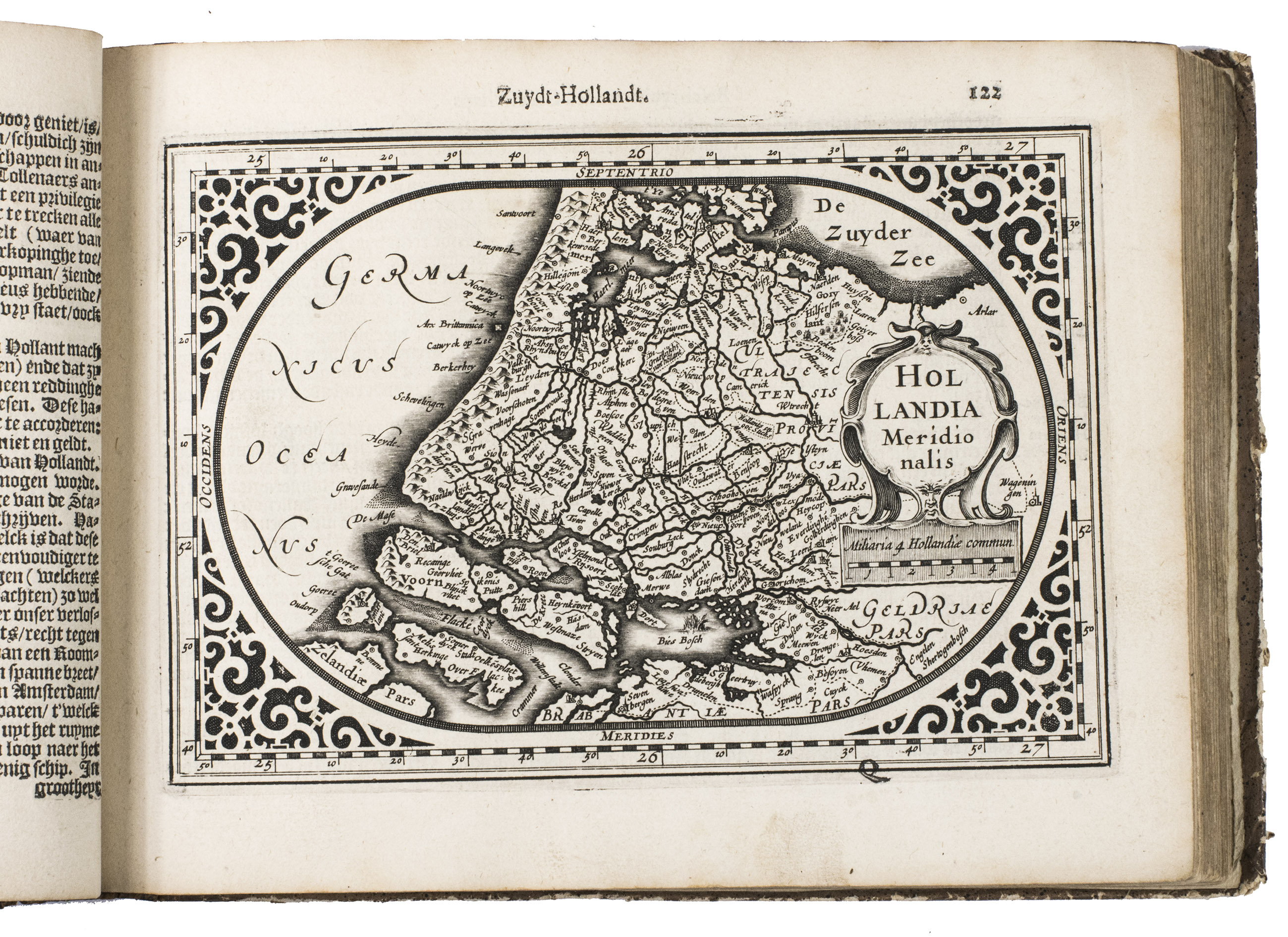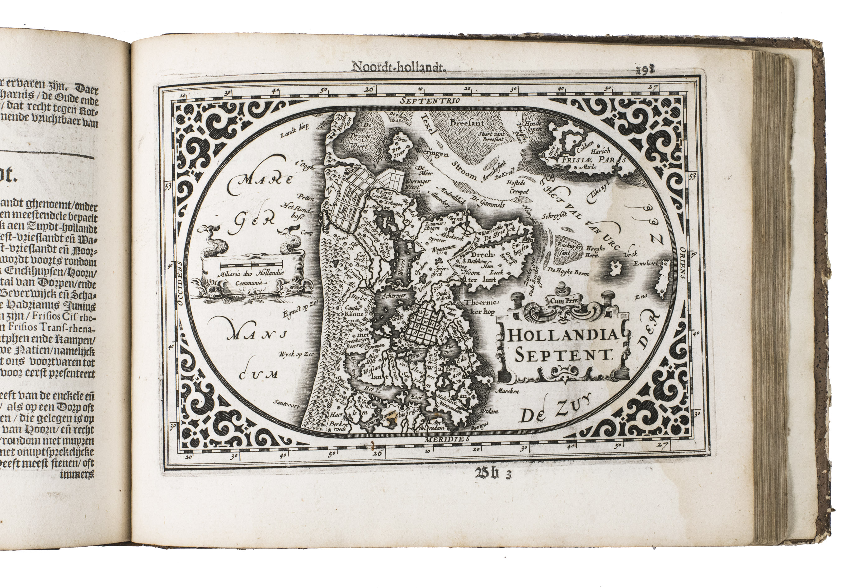 With an erased ownerships entry at the head of the half-title, and 18th-century annotations on pp. 136-138. The edges and corners of the boards are scuffed, the boards have been rubbed, with some loss of material. The first few leaves are somewhat browned, a repaired hole in the lower margin of the title page, false folds in the half title, some marginal small tears, small holes in 2 leaves, with some loss of text, a repaired tear in the last leaf, a water stain in the outer half of the last few leaves. Otherwise in good condition. Krogt, P. van der, Koemans Atlantes Neerlandici, IIIB, § 363, pp. 612-615 (no. 363:01B); Koeman, Atlantes Neerl., II, p. 121 (Goo 1); STCN 853385556; USTC 1032942; cf. for the text: Fontaine Verwey, H. de la, Reinier Telle, hekeldichter, pamfletschrijver, vertaler, in: Uit de wereld van het boek, III, pp. 55-86, esp. 68.