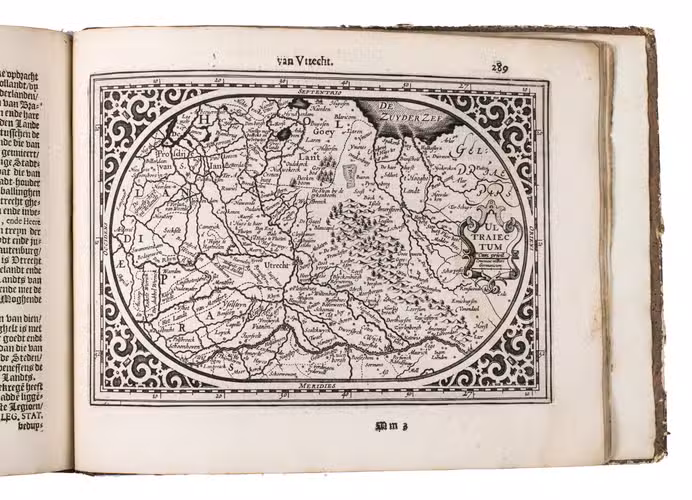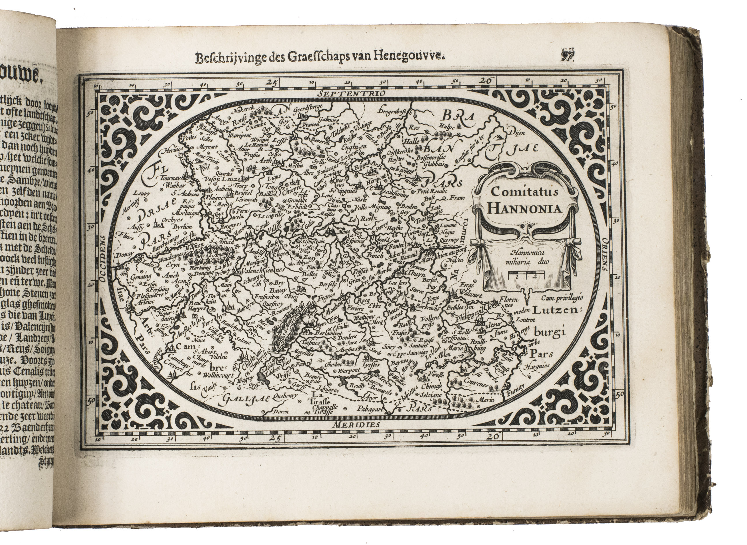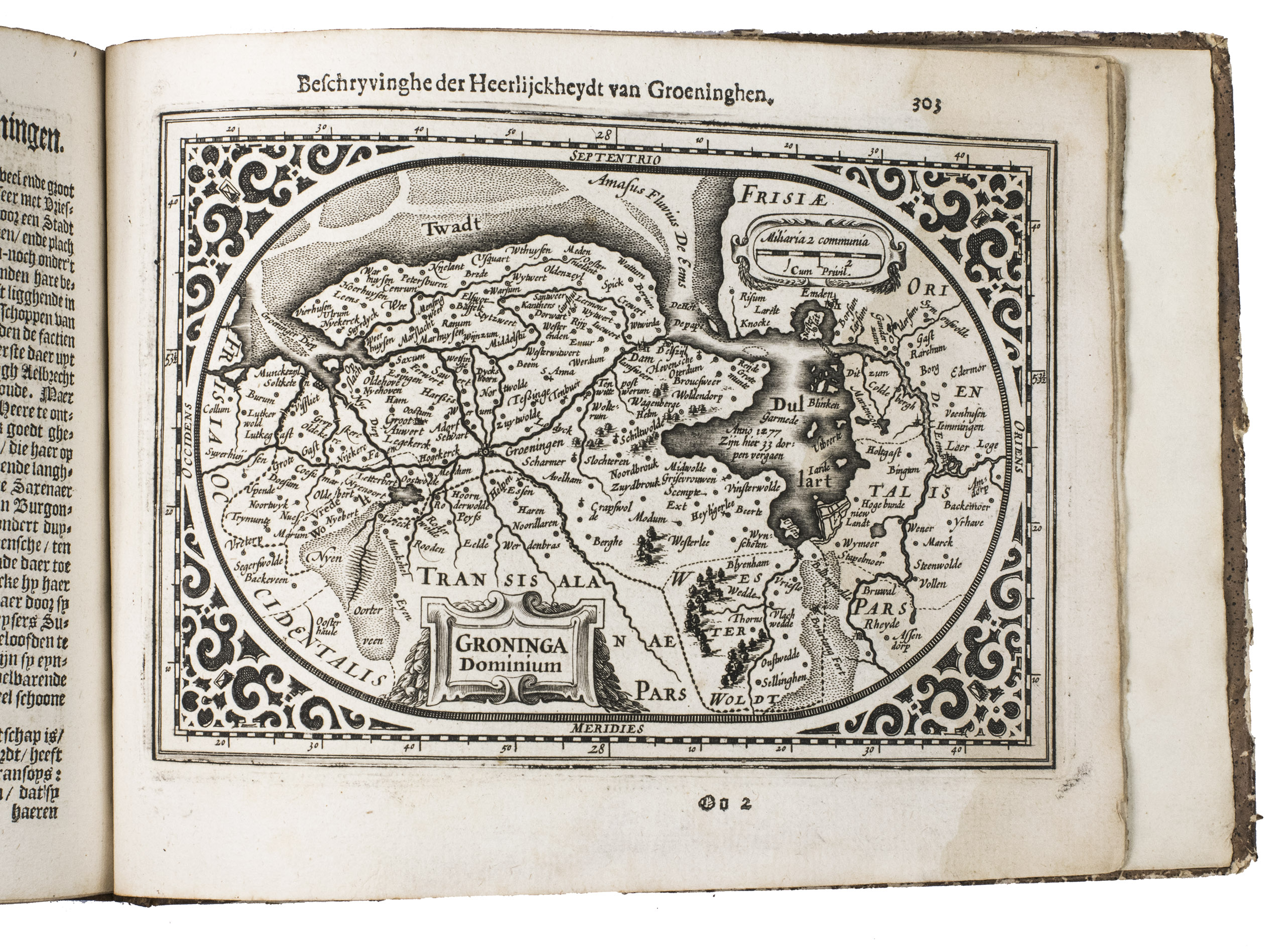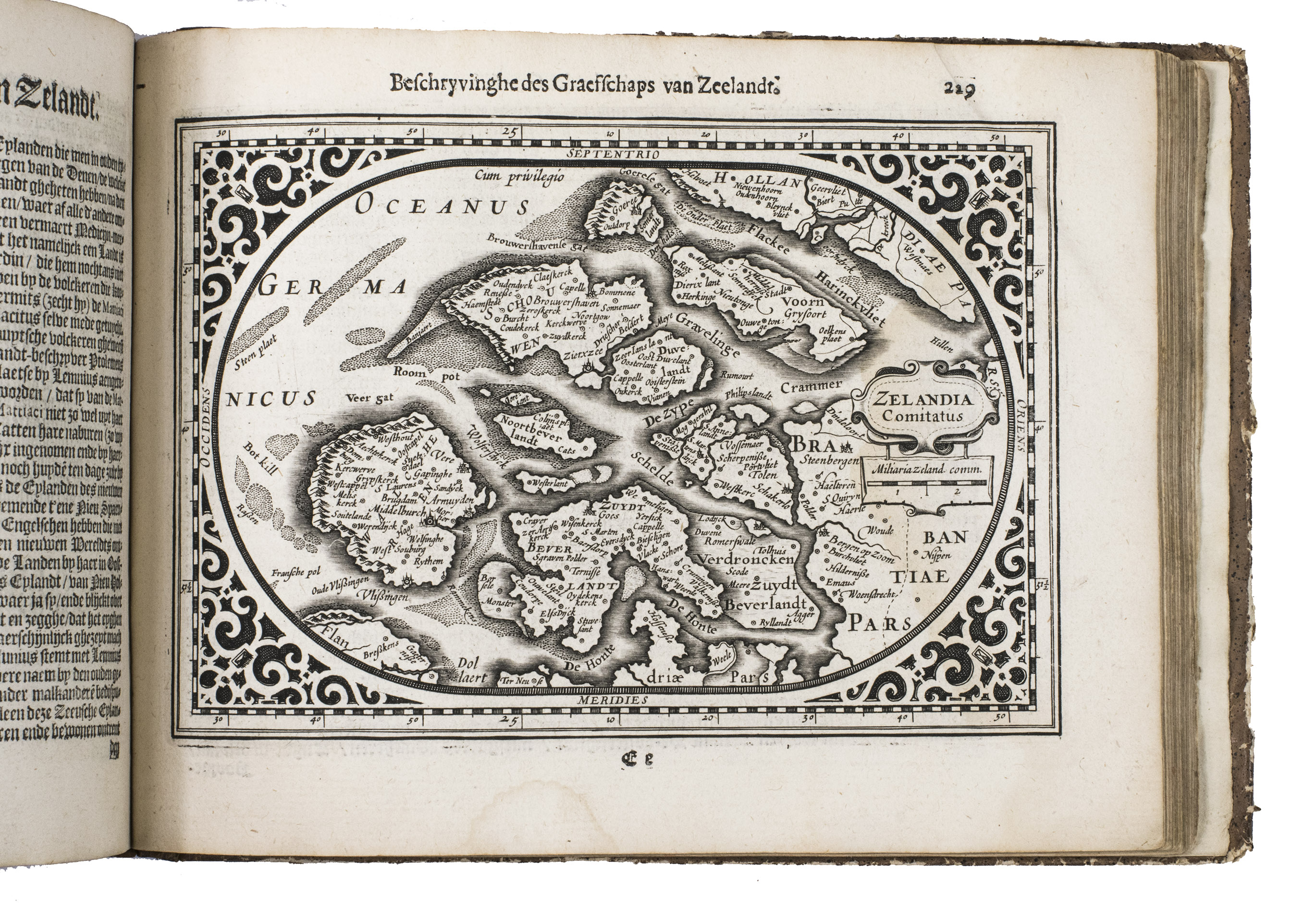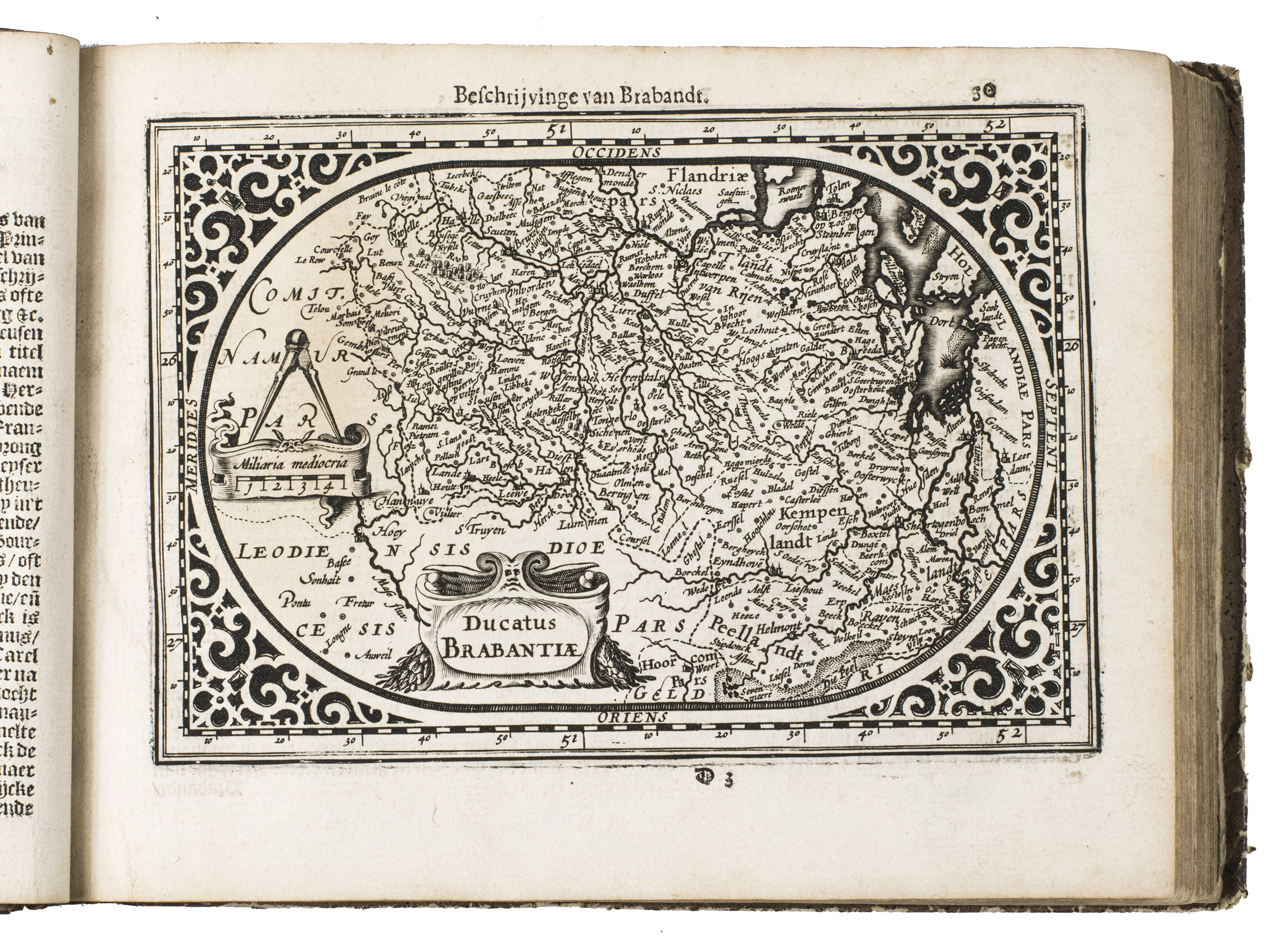 With an erased ownerships entry at the head of the half-title, and 18th-century annotations on pp. 136-138. The edges and corners of the boards are scuffed, the boards have been rubbed, with some loss of material. The first few leaves are somewhat browned, a repaired hole in the lower margin of the title page, false folds in the half title, some marginal small tears, small holes in 2 leaves, with some loss of text, a repaired tear in the last leaf, a water stain in the outer half of the last few leaves. Otherwise in good condition. Krogt, P. van der, Koemans Atlantes Neerlandici, IIIB, § 363, pp. 612-615 (no. 363:01B); Koeman, Atlantes Neerl., II, p. 121 (Goo 1); STCN 853385556; USTC 1032942; cf. for the text: Fontaine Verwey, H. de la, Reinier Telle, hekeldichter, pamfletschrijver, vertaler, in: Uit de wereld van het boek, III, pp. 55-86, esp. 68.