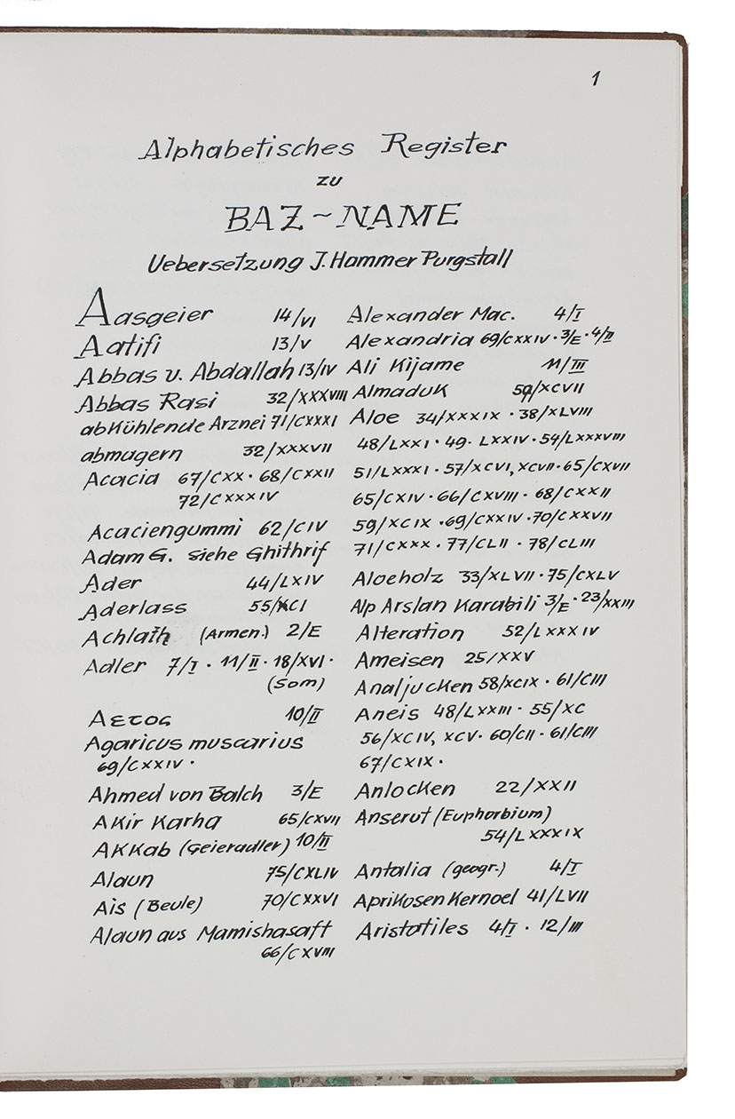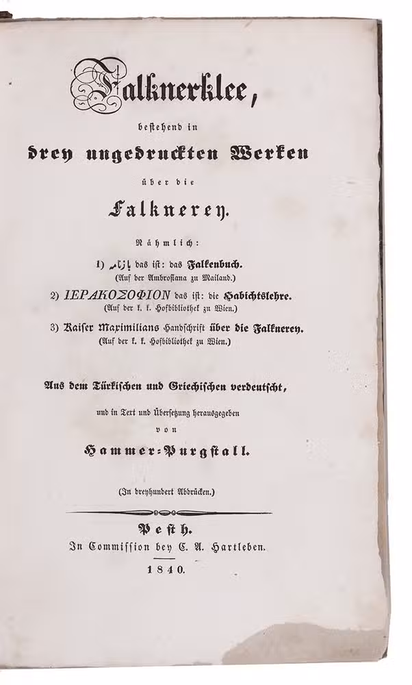 Hammer-Purgstall (1774-1856), a leading Austrian orientalist with an extensive knowledge of languages, took up a diplomatic position at the Austrian embassy in Constantinople in 1799 and remained in Turkey and the Middle East until 1807. He found the Turkish manuscript on falconry at the Biblioteca Ambrosiana in Milan in 1825 and the other two manuscripts at the Hofbibliothek in Vienna. He not only translated and edited the present texts but also contributed a 32-page introduction and a list of 63 works on the subject of falconry, from the 15th century to his own day. The book, printed in only 300 copies, has been largely overlooked in the literature on ornithology and Islamitica, but Schwerdt notes that it is "particularly important to lovers of falconry, its origin and history". It also provides insights into the Turkish language and Islamic culture.