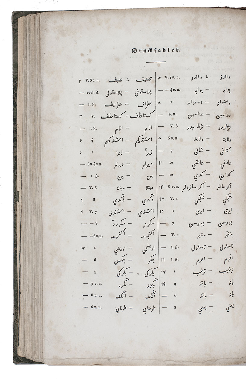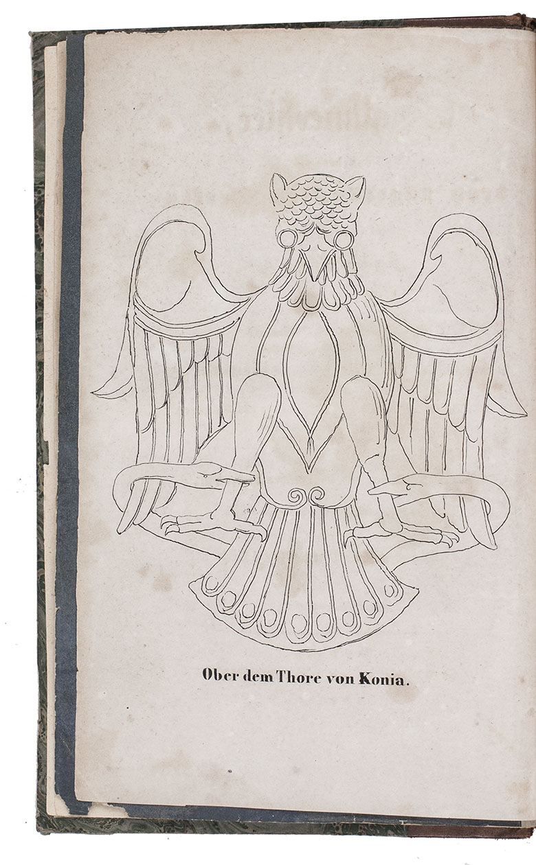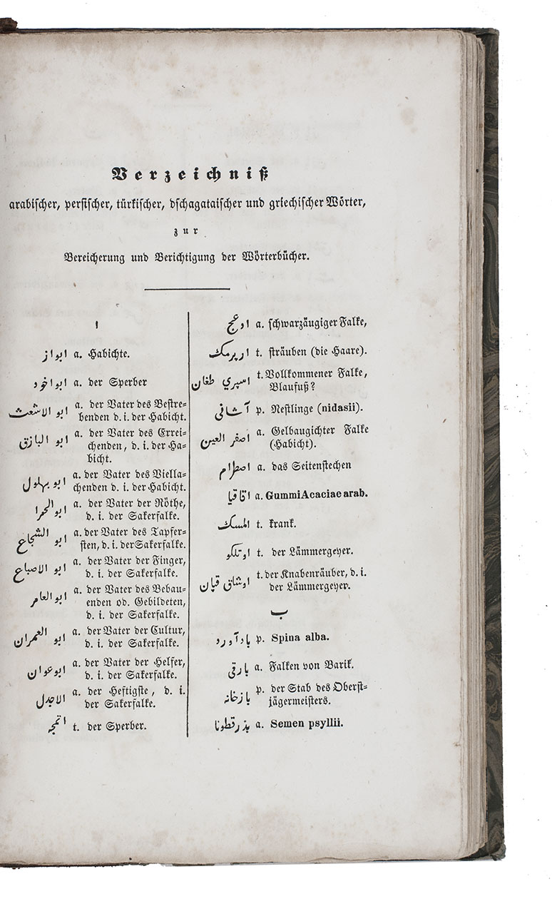 Pest (now part of Budapest), Conrad Adolf Hartleben (verso of title-page: [Vienna], printed by the widow of Anton Strauß), 1840. 8vo. With lithographed frontispiece, elaborately decorated Turkish title-page and opening page. Set in fraktur, Arabic and Greek types with incidental roman. With a modern index of ornithological, zoological and botanical names. Later 19th-century half tanned sheepskin, with the publisher's original tinted lithographed wrappers bound in; the modern index is separately bound in modern goatskin, designed to match the main volume. Frontispiece plus [8], XXXII, [2], 115, [2], [1 blank] pp.; 48 ll.