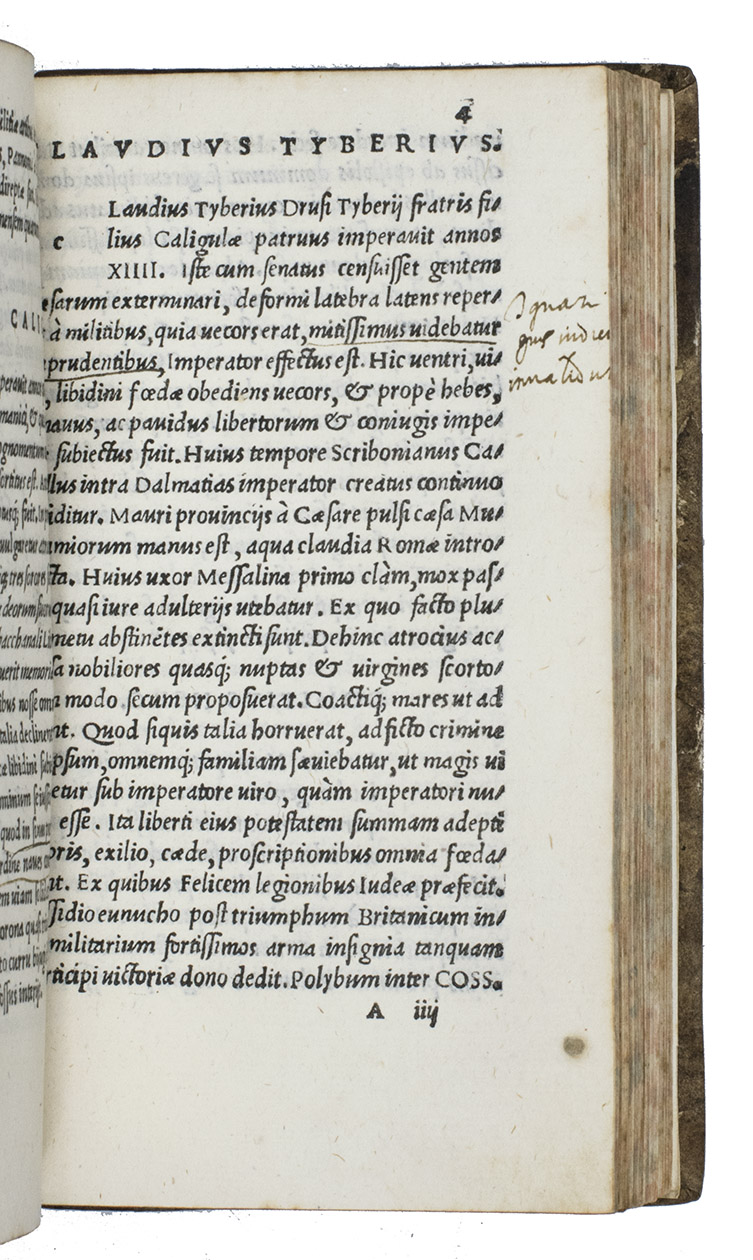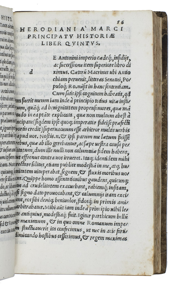 Collection of four works on Roman history, published at Florence by Filippo Giunta in his last year: Herodian's Historiae, in eight books, from Marcus Aurelius to Gordian III (180-238 CE). This edition is dedicated to Pope Innocentius VIII and gives Herodians text in Angelo Polizianos elegant Latin translation of the original Greek, first published in a folio volume in 1493. Although a bit moralizing, it is especially valuable for Herodian's contemporary knowledge. The second work, De vita et moribus Imperatorum Romanorum, excerpta ex libris Sexti Aurelii Victoris, à Caesare Augusto usque ad Theodosium Imperatorum is an epitome of Aurelius' Caesares, giving biographies of the Roman emperors from Augustus to Theodosius. The last two works are Eutropius, De gesta Romanorum in ten books, and the additional books 11 to 18 by Paulus Diaconus.