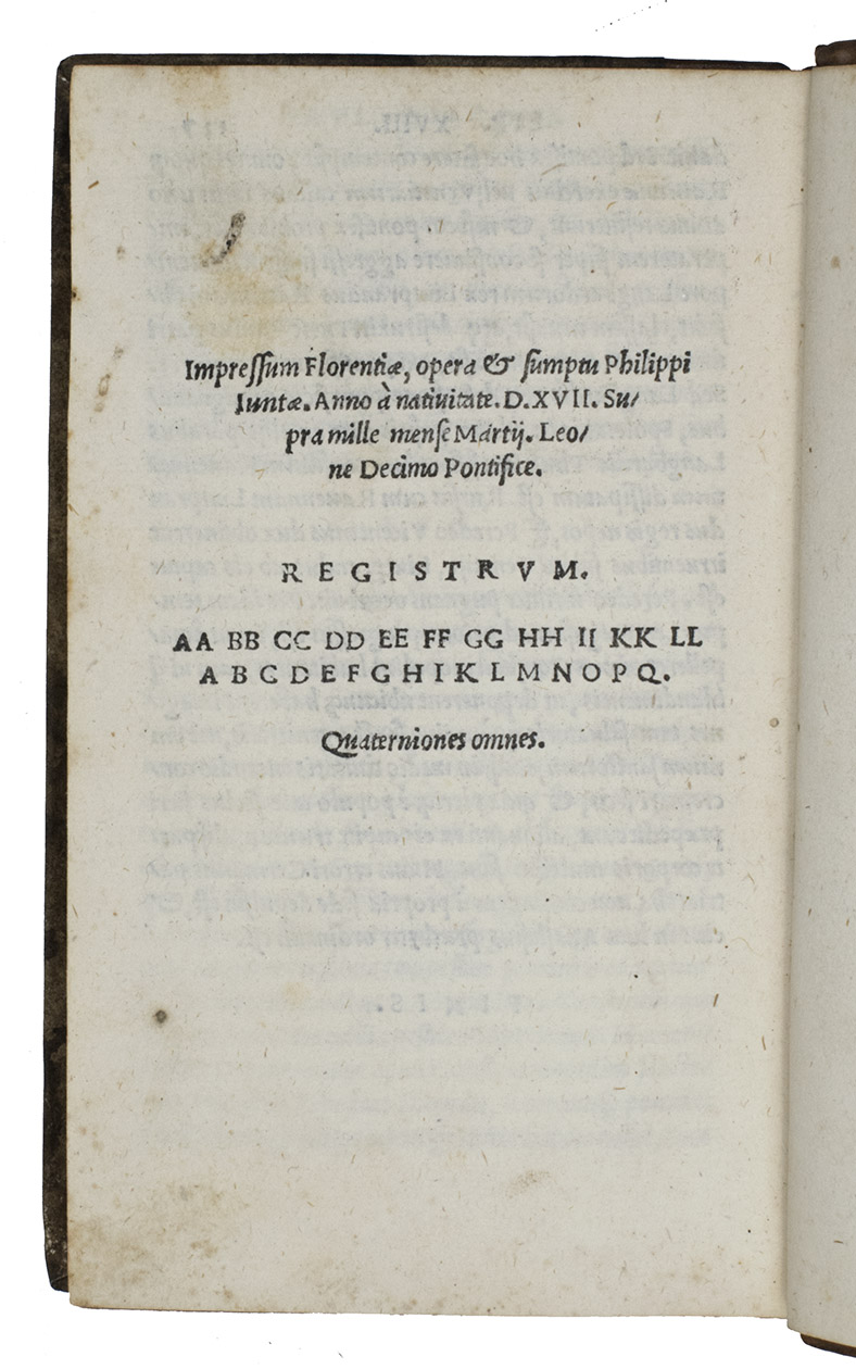 (Colophon:) Florence, Filippo Giunta, 1517. 4 works in 1 volume. Small 8vo. With Giuntas woodcut device on the verso of the otherwise blank final leaf.