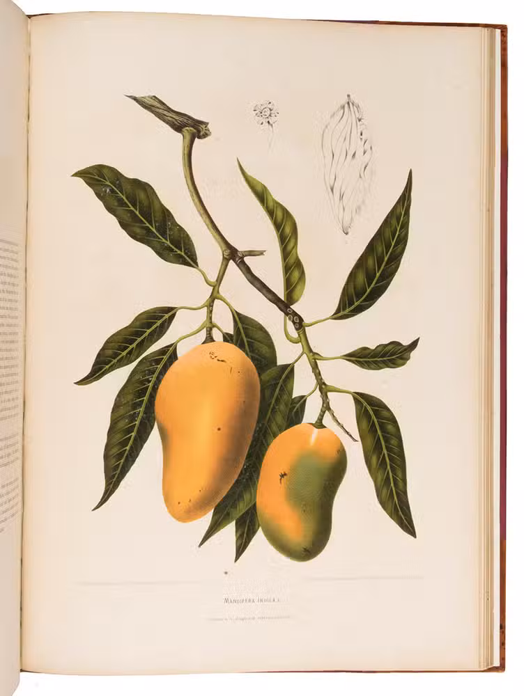 Third edition of a magnificent display of Javanese fruits and flowers, their bright colours ideally suited to the new technique of chromolithography. Hoola van Nooten (1840-1885), a twenty-two-year-old widow in "exile" on the island of Java, "was clearly a more than competent artist, for the splendid tropical plants, with their lush foliage, vividly coloured flowers and exotic fruit, have been depicted with great skill. She managed to accentuate the splendour of each species by adopting a style that combined great precision and clarity with a touch of neo-Baroque exuberance, revelling in the rich forms and colours of the tropics. The reader's eye is immediately captured by the dark leaves, shown furled or crumpled or partly nibbled away by insects, the delicately rendered details of the follicles and seeds, and the heavy clusters of flowers that cascade down the page. The excellent reproduction of the artist's drawings in the form of chromolithographs lends an added tactility to these striking images" (Tomasi).