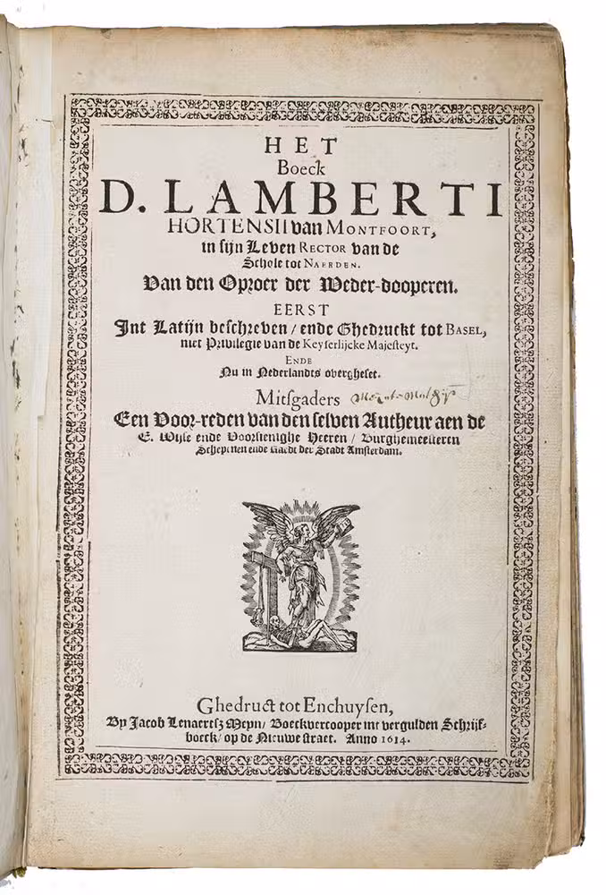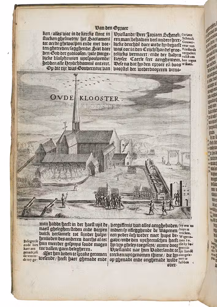 With the bookplate and owner's inscription. Slightly frayed at outer margins; some plates shaved; a few stains, also affecting some plates. Small pieces of vellum from front cover gone. A fair copy of a rare work on the Münster Rebellion. Mennonite Encyclopedia II, p. 816; Simoni H-186; STCN (5 copies); cf. Knuttel, Kerkgeschiedenis, pp. 150-151 (later editions).