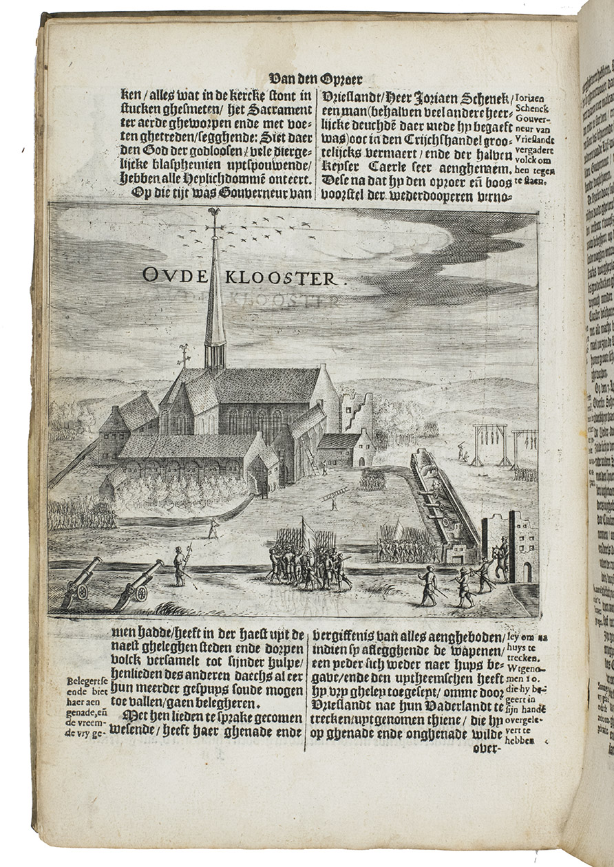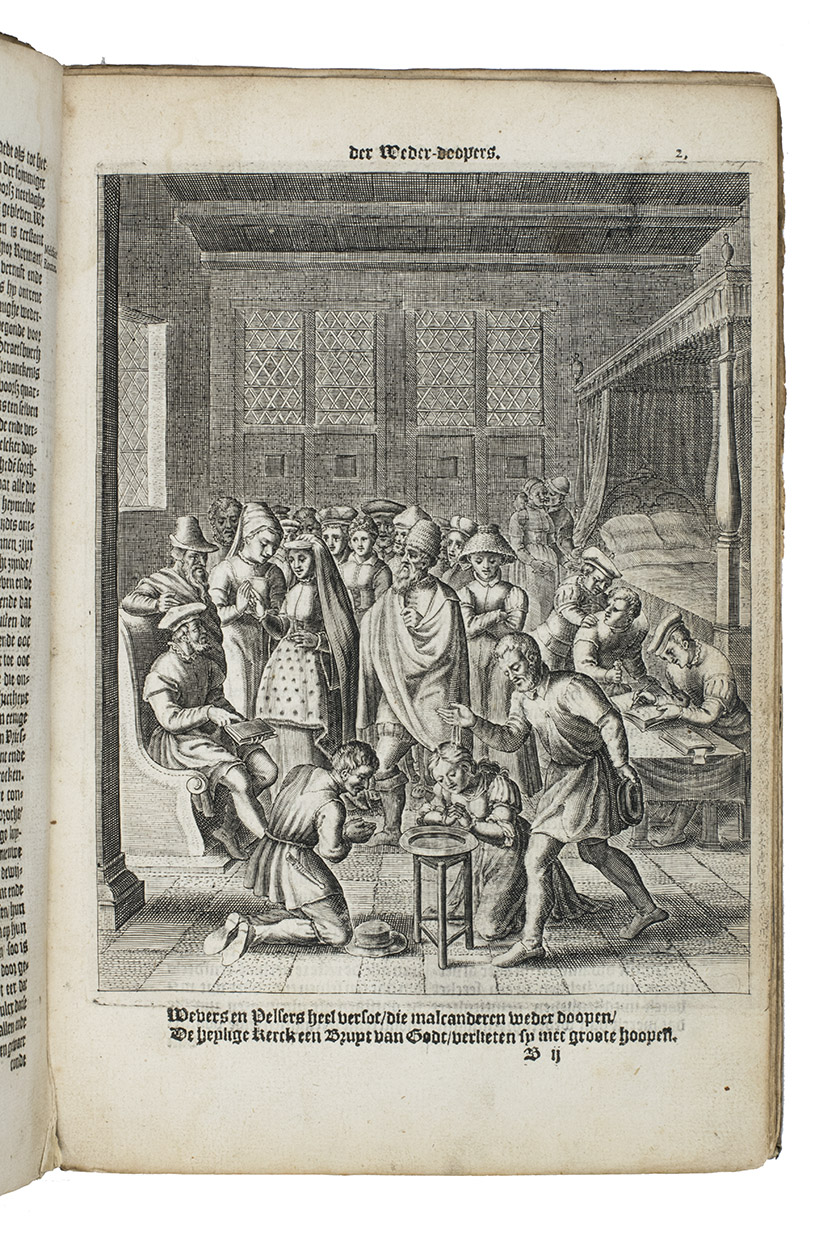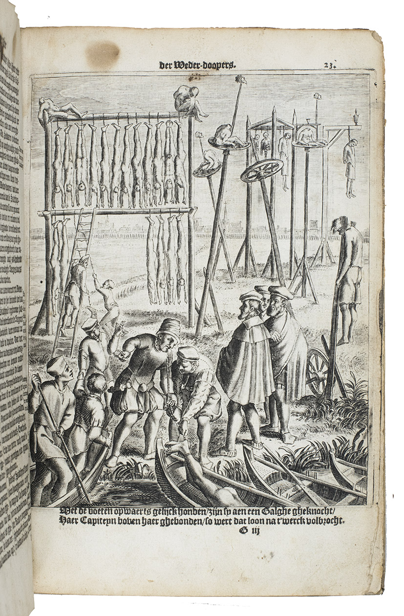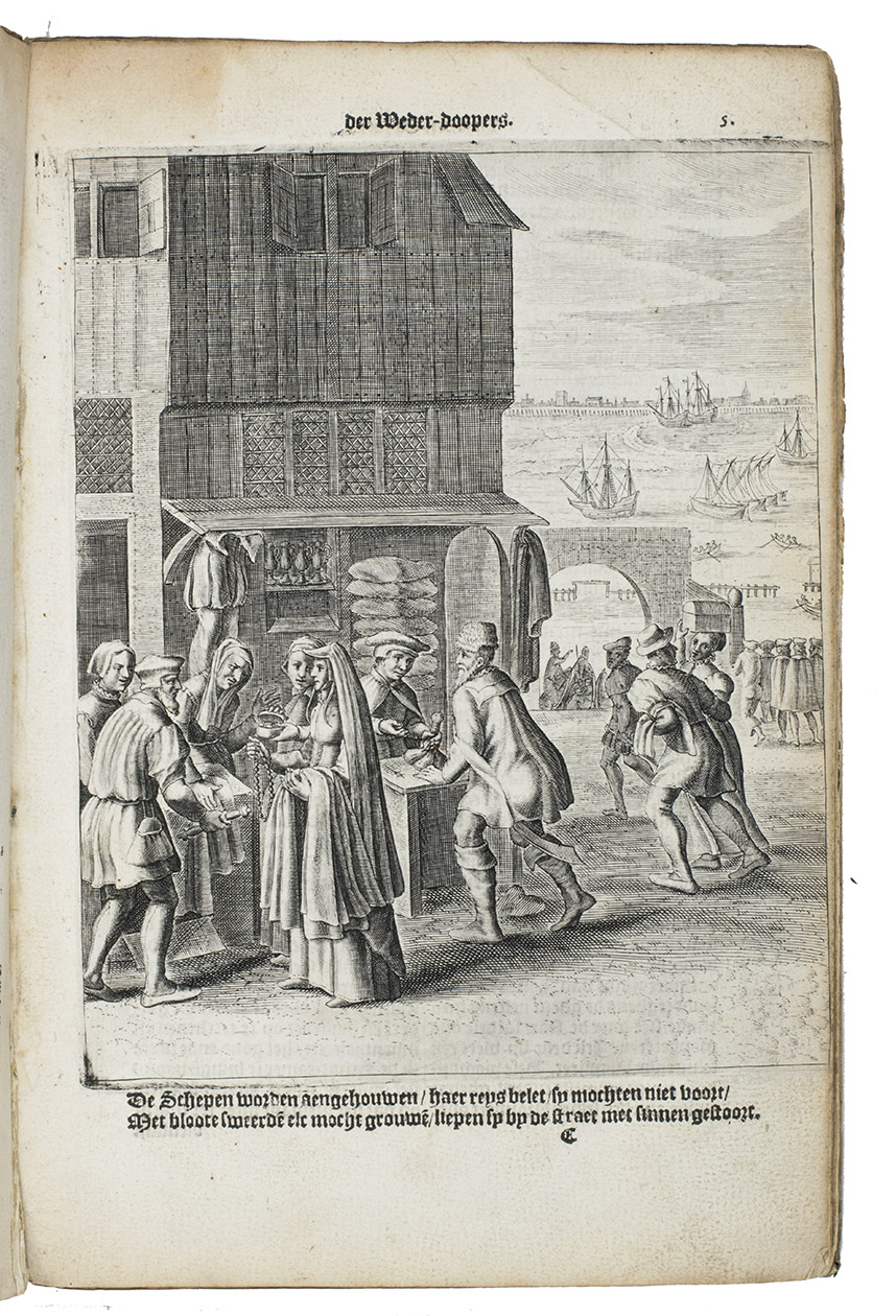 The first Dutch edition (in the first state) of a detailed and graphic description of the Anabaptist attempt to establish a sectarian government in Münster, known as the Münster Rebellion, 1534-1535. The work includes a description of the Amsterdam Riots and is dedicated by the printer to the city council of Enkhuizen and by the author to the council of Amsterdam. The fine, anonymous plates vividly illustrate the persecution and subsequent execution of the Annabaptists. The plate on leaf 3 is erroneously repeated on leaf 5; in later states this error has been corrected.