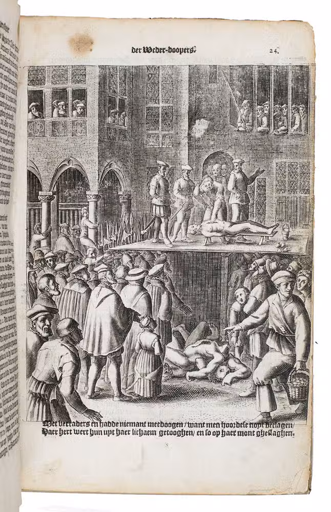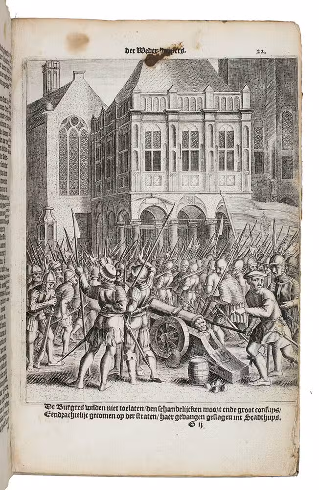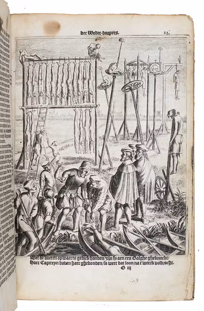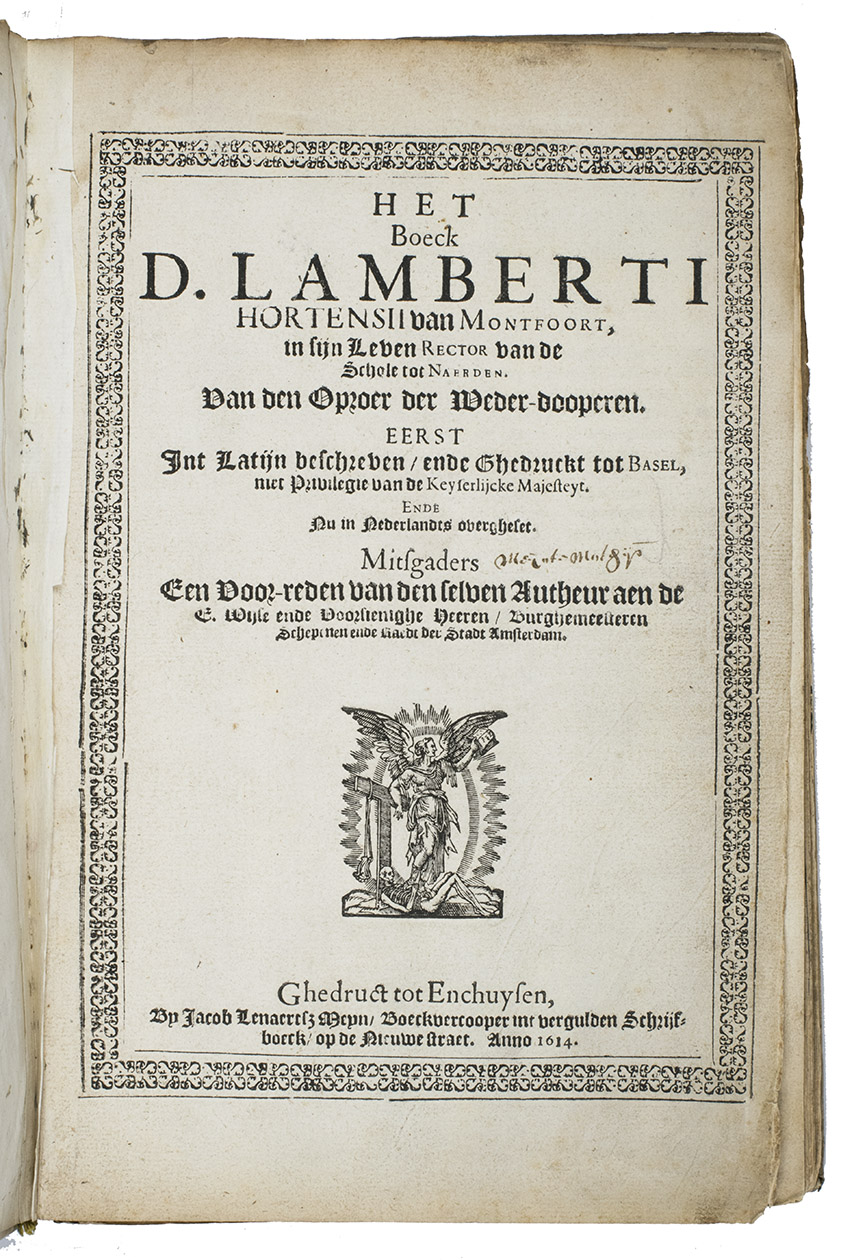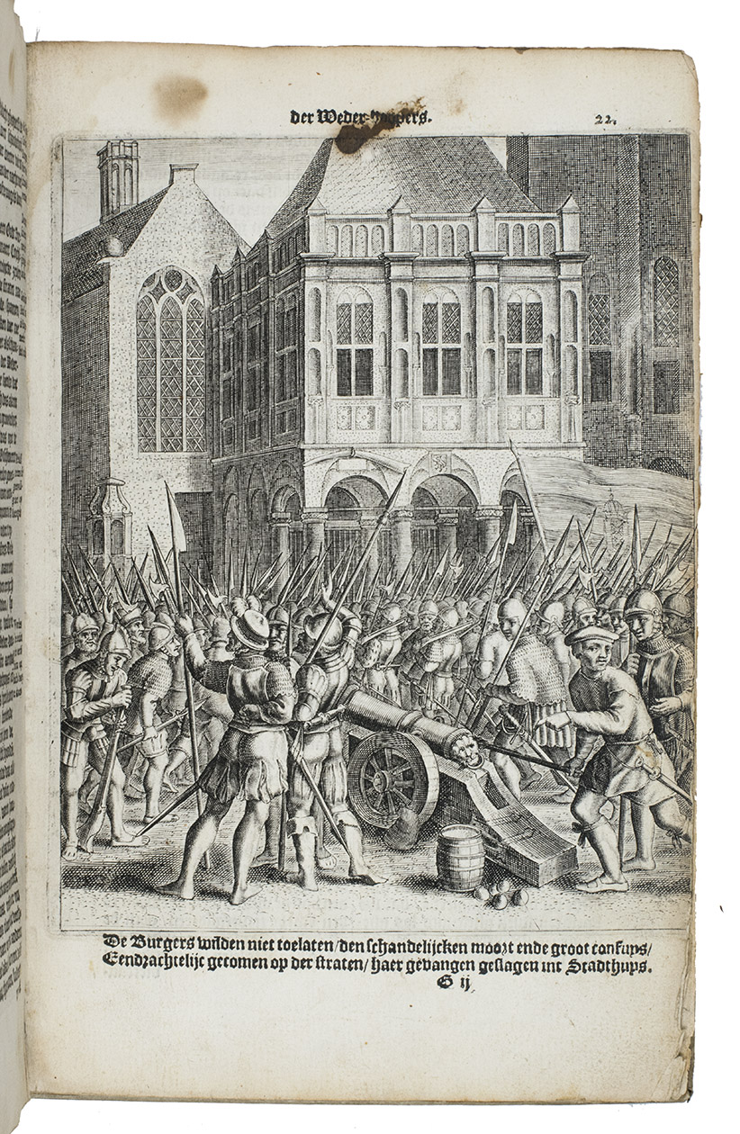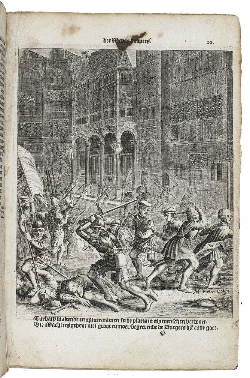 The first Dutch edition (in the first state) of a detailed and graphic description of the Anabaptist attempt to establish a sectarian government in Münster, known as the Münster Rebellion, 1534-1535. The work includes a description of the Amsterdam Riots and is dedicated by the printer to the city council of Enkhuizen and by the author to the council of Amsterdam. The fine, anonymous plates vividly illustrate the persecution and subsequent execution of the Annabaptists. The plate on leaf 3 is erroneously repeated on leaf 5; in later states this error has been corrected.