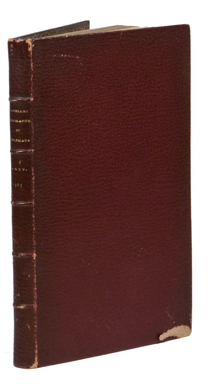 Antwerp, Christoffel Plantin, 1565 (colophon: 15 May 1565). 2 works in 1 volume. Small 8vo (17 x 11.5 cm). With 57 woodcut emblems, mainly by Gerard Janssen van Kampen with a few by Arnold Nicolai, all after Geoffroy Ballain and Pierre Huys. Red goatskin morocco (ca. 1850/60?) by Charles-François Capé in Paris, signed "CAPÉ" in the foot of the front turn-in. [15], [1 blank]; 149, [3] pp.