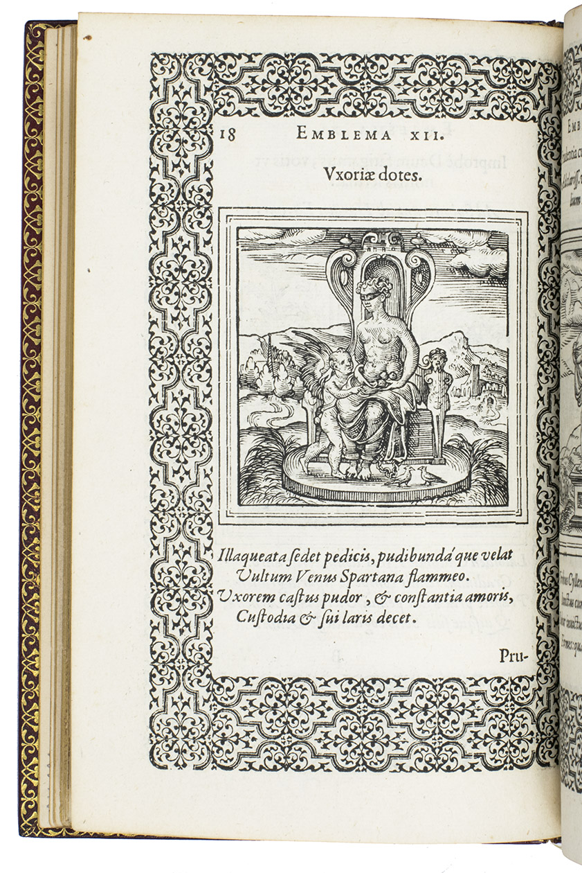 Though rebound ca. 1850/60, only about 4 mm has been trimmed from the fore-edge and perhaps a bit more at the head. With the paper very slightly browned and one or two minor marginal spots, but otherwise internally in very good condition. The lower outside corner of the binding is slightly damaged (with a 1 x 2 cm scuff on the front and a smaller one on the back) and the edge of the turn-in has lifted in one place (4 cm along the foot of the front marbled pastedown), but otherwise in good condition, with only some tiny scuff marks around the extremities. Belg. Typ. 1662; Karl Enenkel, The invention of the emblem book ... (2019), pp. 264-309; Landwehr, Emblem books Low Countries (1988), 399; Laurent Potier, Cat. ... bibliotheque de feu M. Capé ancien relieur, 27 January 1868, lot 639 (this copy); Praz, pp. 37-38, 384-385; Max Rooses, intr. to the reprint from the original woodblocks in the series "Editions du Musée Plantin-Moretus" (1901); STCV 12919775 (5 copies); USTC 401197 (8 copies); Vinet 847; Voet, Plantin press 1476-1477; J. de Winter, Brussels, auction, 27 March & 3 April 1924, lot 83 (this copy), reported in De Gulden Passer, 2 (1924), p. 77, with the price; for the binder: Fléty, p. 38; Ramsden, French bookbinders, pp. 46-47; histoire-bibliophilie.blogspot.com/2013/04/charles-cape-le-bozerian-du-second.html; for Auguste Génard: Petite revue des bibliophiles dauphinois, vol. 1, (no. 5, July 1907), p. 159, note 2; www.bibliotheque-dauphinoise.com/catalogue_genard.html.