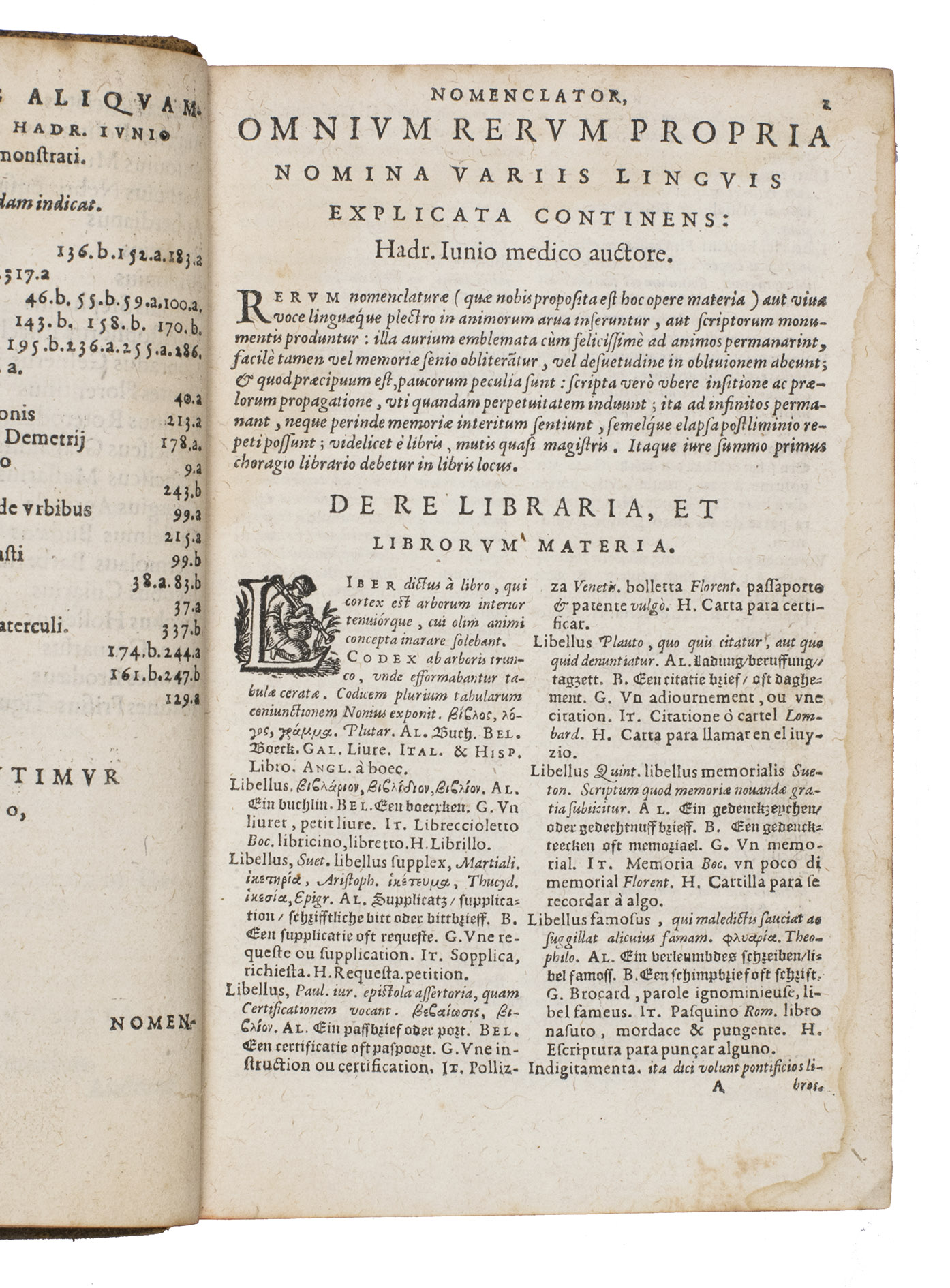 Junius Nomenclator is a thematically arranged dictionary, with Latin catchwords explained in Latin and translated into Greek and six languages: French, German, English, Dutch, Spanish, and Italian. The thematic organisation covers an extraordinary variety of subjects, including: De re libraria et librorum materia (a substantial chapter on the book trade), De cibis (food) and De potu (drink), De chirurgia (surgery), De re nummaria (money and finance), and Musica.