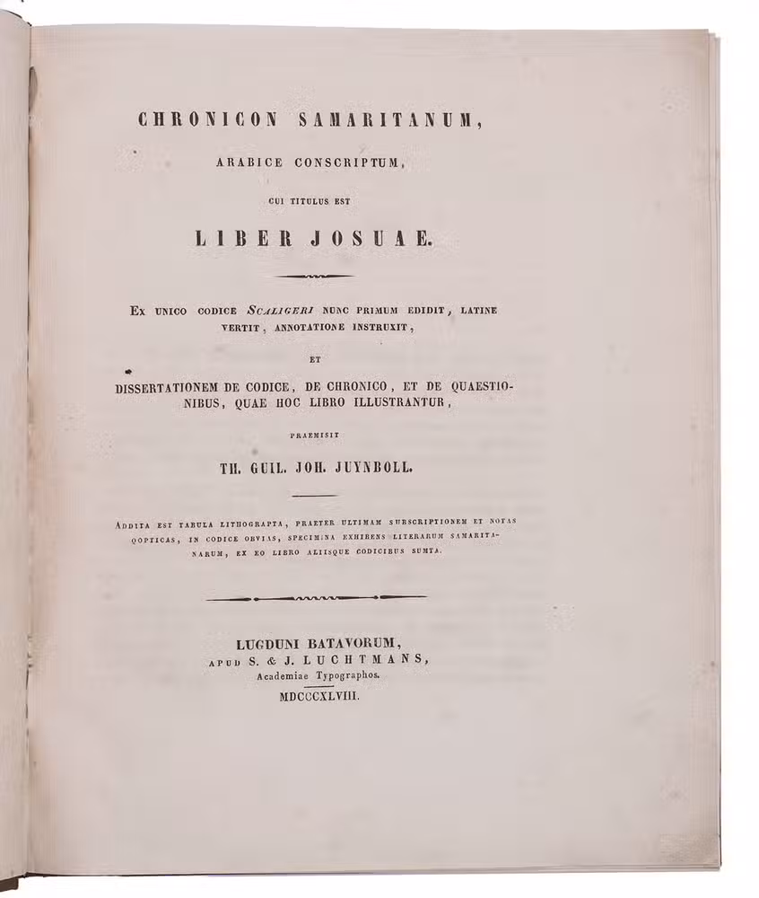 First Arabic edition of the so-called Samaritan book of Joshua, edited by the Dutch linguist and orientalist Theodorus Willem Johannes Juynboll (1802-1861). It is a chronicle mainly devoted to the life and history of the Hebrew prophet Joshua, though written down centuries later and often differing from the canonical Book of Joshua. The present work includes a complete transcription of the Arabic text, together with a Latin translation, Juynboll's commentary and background information. Juynboll based his transcription on a 13th-century manuscript at the Leiden University Library, which had been in the possession of the French-born humanist and Leiden professor Joseph Scaliger. Manuscript versions of the chronicle are extant in both Hebrew and Arabic. It is not known whether the Arabic was originally based on a Hebrew source, but the Hebrew text that has survived up to this day is generally believed to be based on the Arabic text.