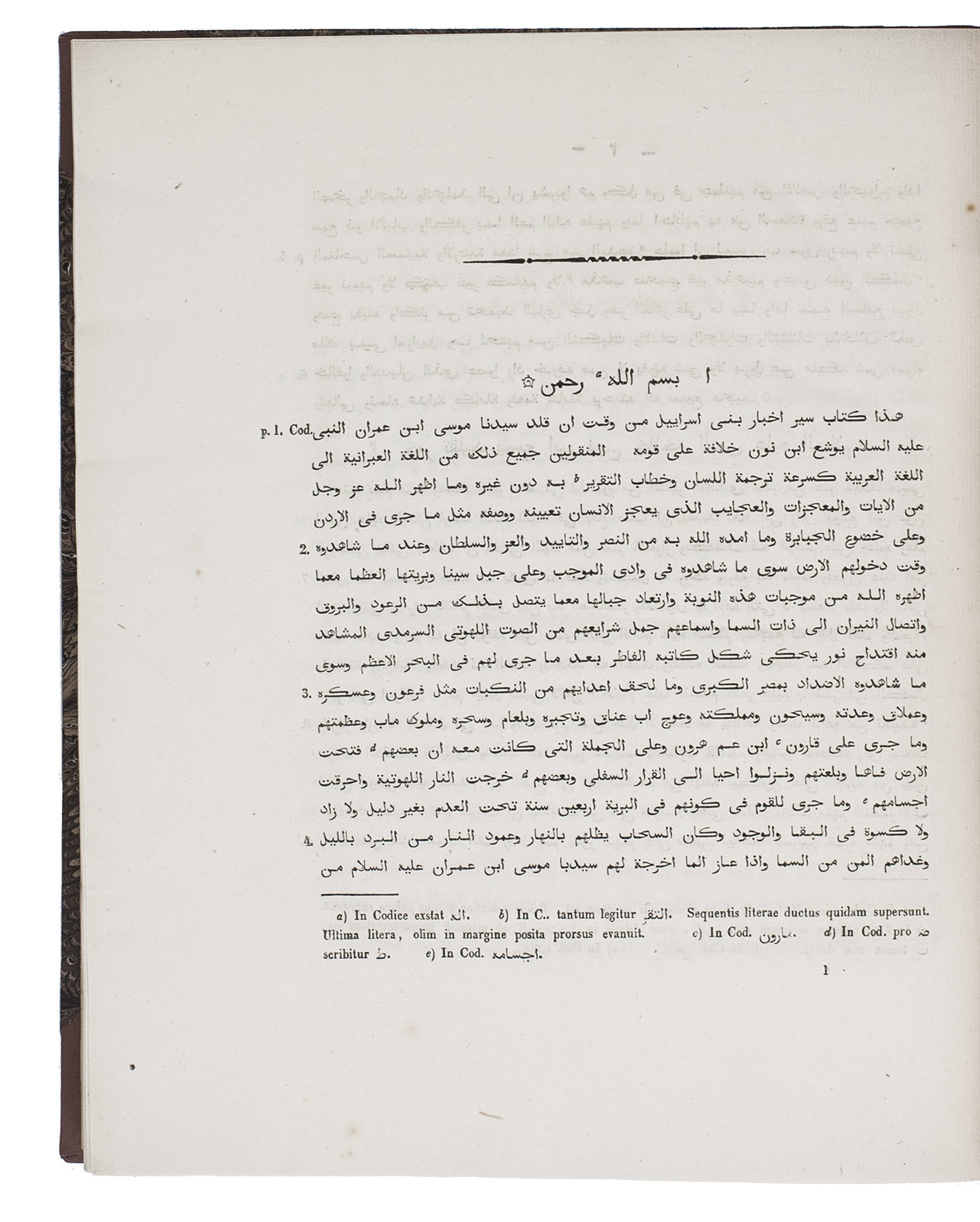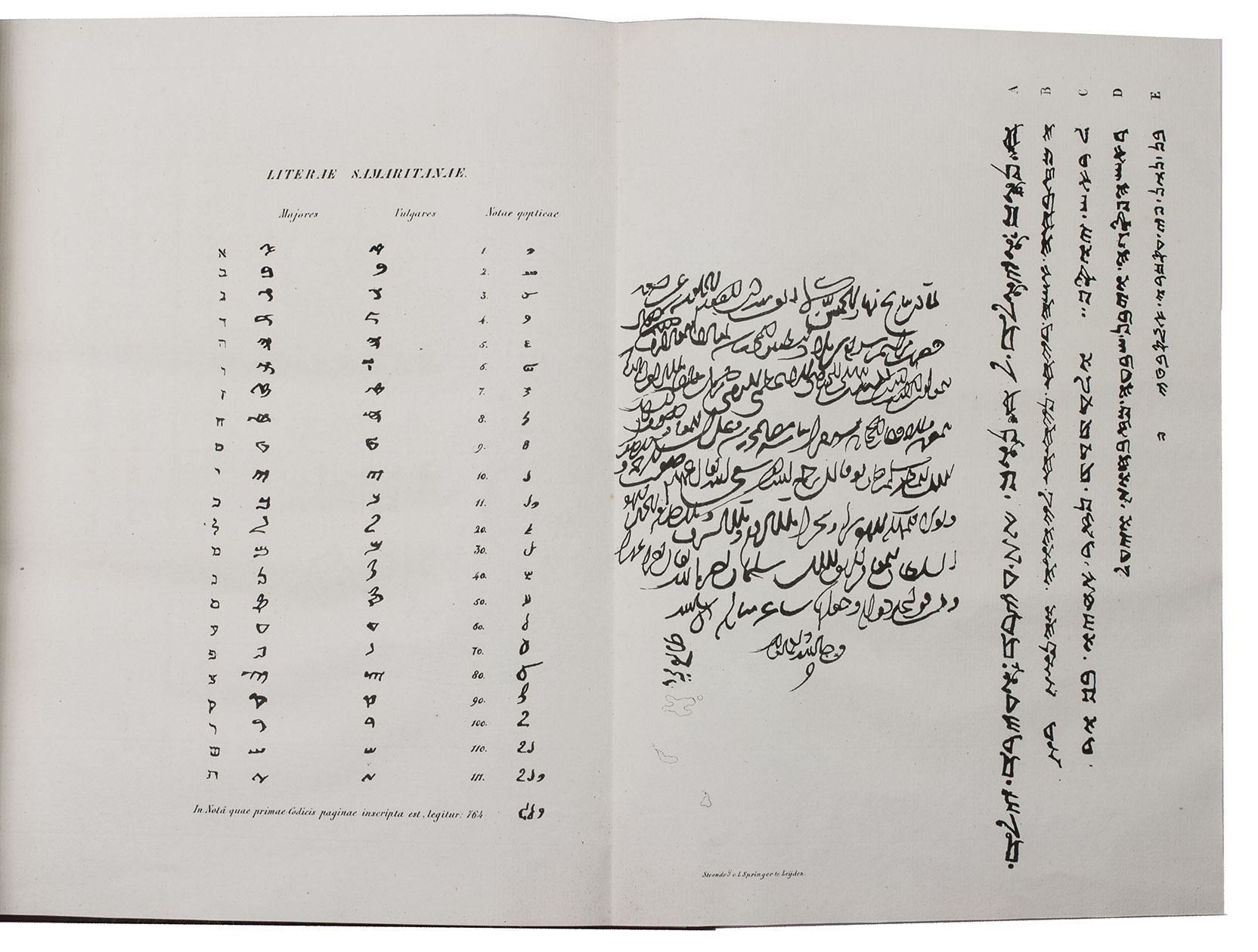 Leiden, Samuel and Johannes Luchtmans, 1848. 4to. With a folding lithographed plate. Set in roman and italic types with the 55-page transcription in Arabic type and shorter passages in Hebrew, Samaritan and Syriac type. Modern half cloth, gold-tooled spine, marbled sides and decorated endpapers. XII, 369; [1], [1 blank], 55 pp.
