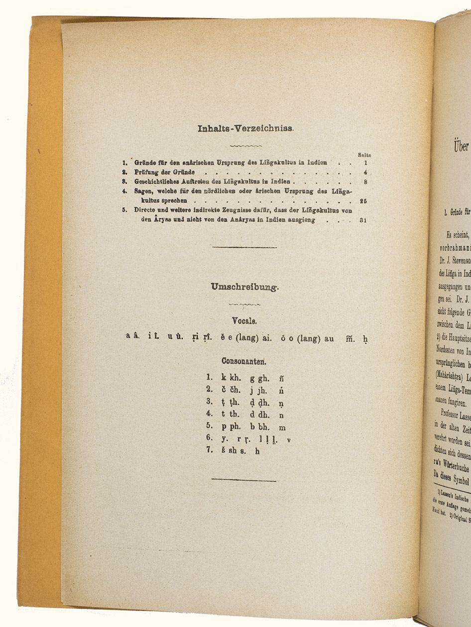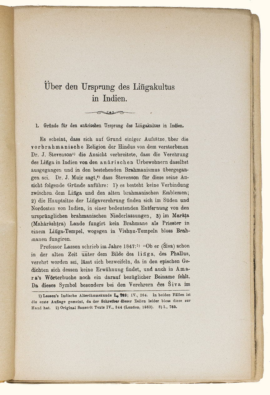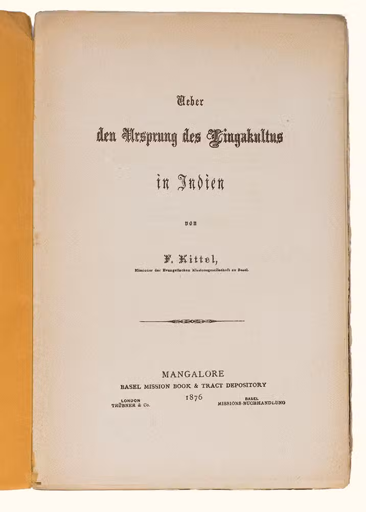 The German missionary to India Ferdinand Kittel (1832-1903), presented in 1876 with his Ueber den Ursprung des Lingakultus in Indien a study on the origins of the cult around the lingam in India. The lingam is a sacred object in Hinduism that represents the god Shiva and is considered a symbol of generative power. It is commonly found in Shaivite temples and private shrines across India and is often placed in the centre, surrounded by other deities.