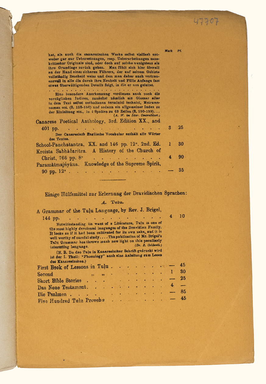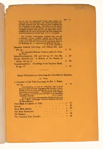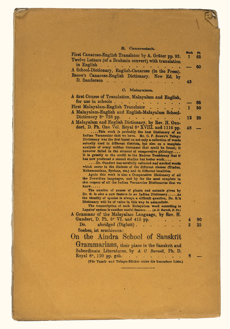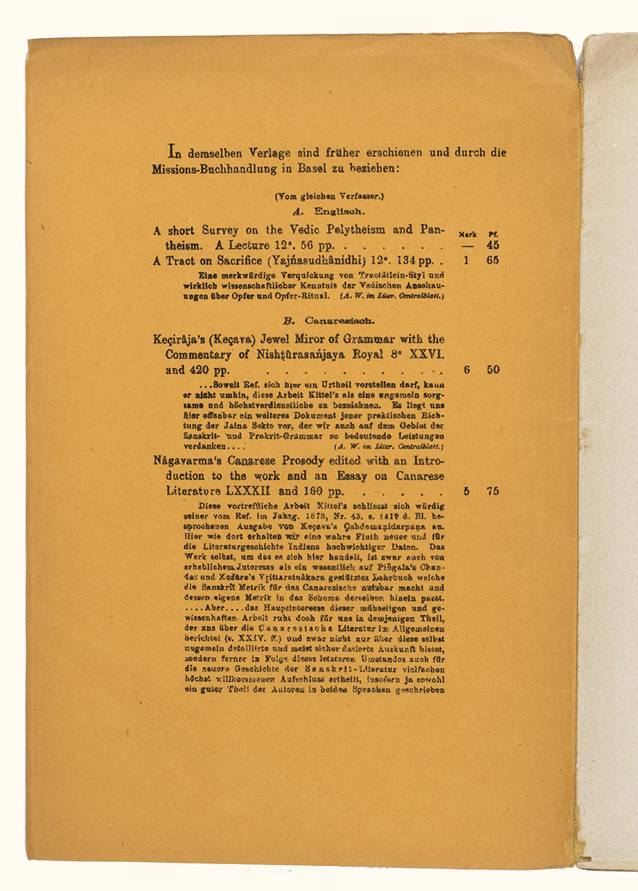 Mangalore, [printed by Stolz & Hirner, Basel Mission Press, Mangalore, for:] Basel mission book & tract depository, 1876. 8vo. With the title on the front wrapper in a printed decorative frame. Orange printed paper wrappers. [2], 48 pp.