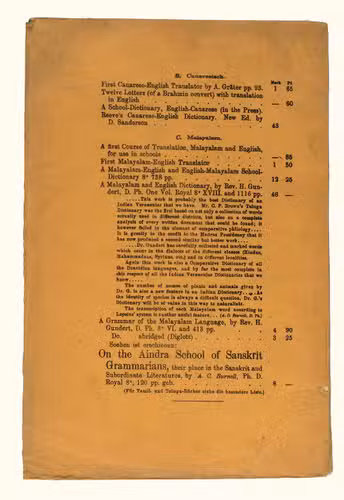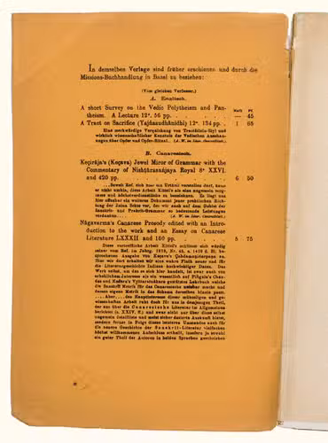 Mangalore, [printed by Stolz & Hirner, Basel Mission Press, Mangalore, for:] Basel mission book & tract depository, 1876. 8vo. With the title on the front wrapper in a printed decorative frame. Orange printed paper wrappers. [2], 48 pp.