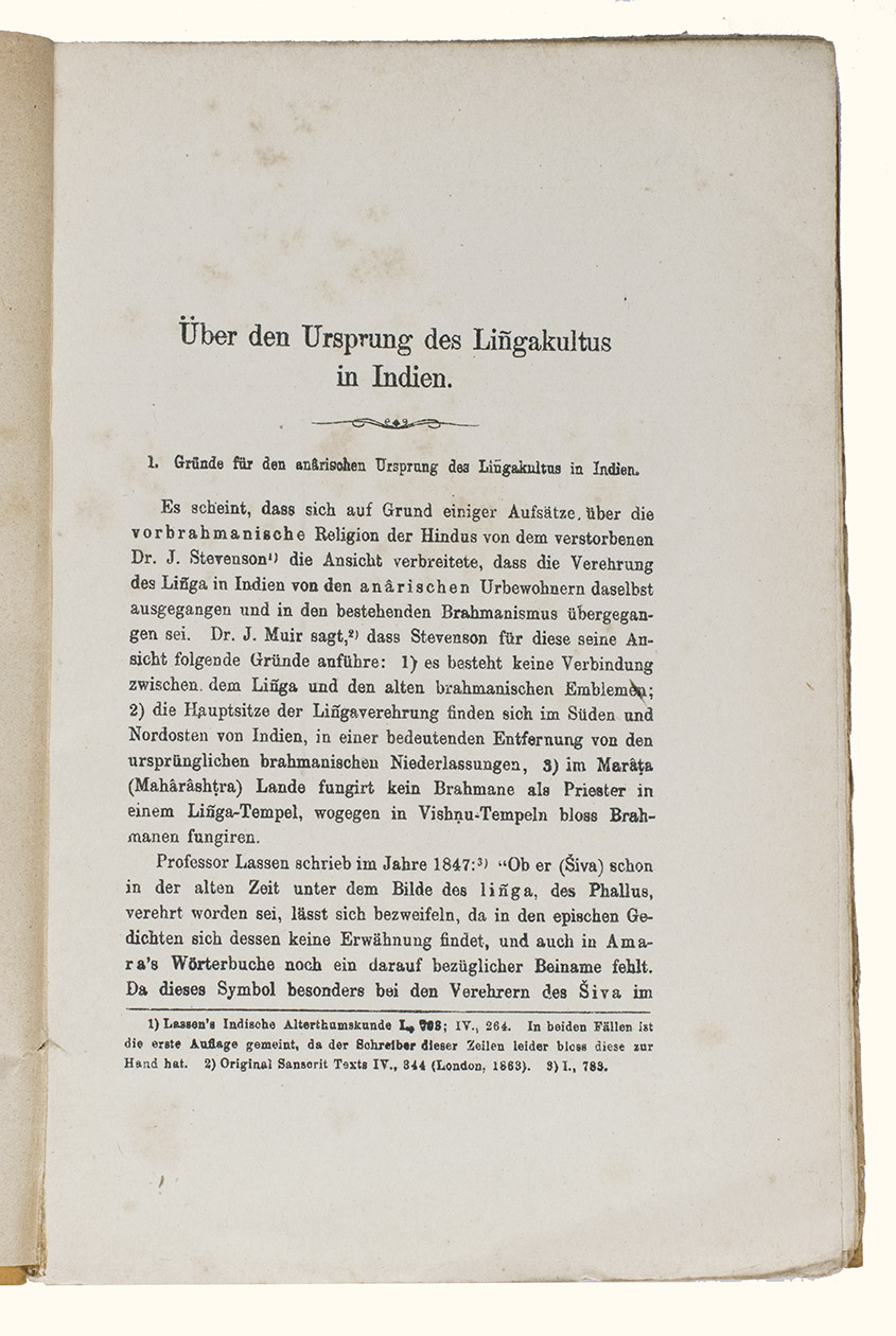 The German missionary to India Ferdinand Kittel (1832-1903), presented in 1876 with his Ueber den Ursprung des Lingakultus in Indien a study on the origins of the cult around the lingam in India. The lingam is a sacred object in Hinduism that represents the god Shiva and is considered a symbol of generative power. It is commonly found in Shaivite temples and private shrines across India and is often placed in the centre, surrounded by other deities. Unlike the sacred images of deities (murtis), the lingam is aniconic, being simply a cylindrical shape. It is typically paired with the yoni, a disk-shaped emblem of the goddess Shakti, to symbolize the union of the male and female principles and all of existence. T