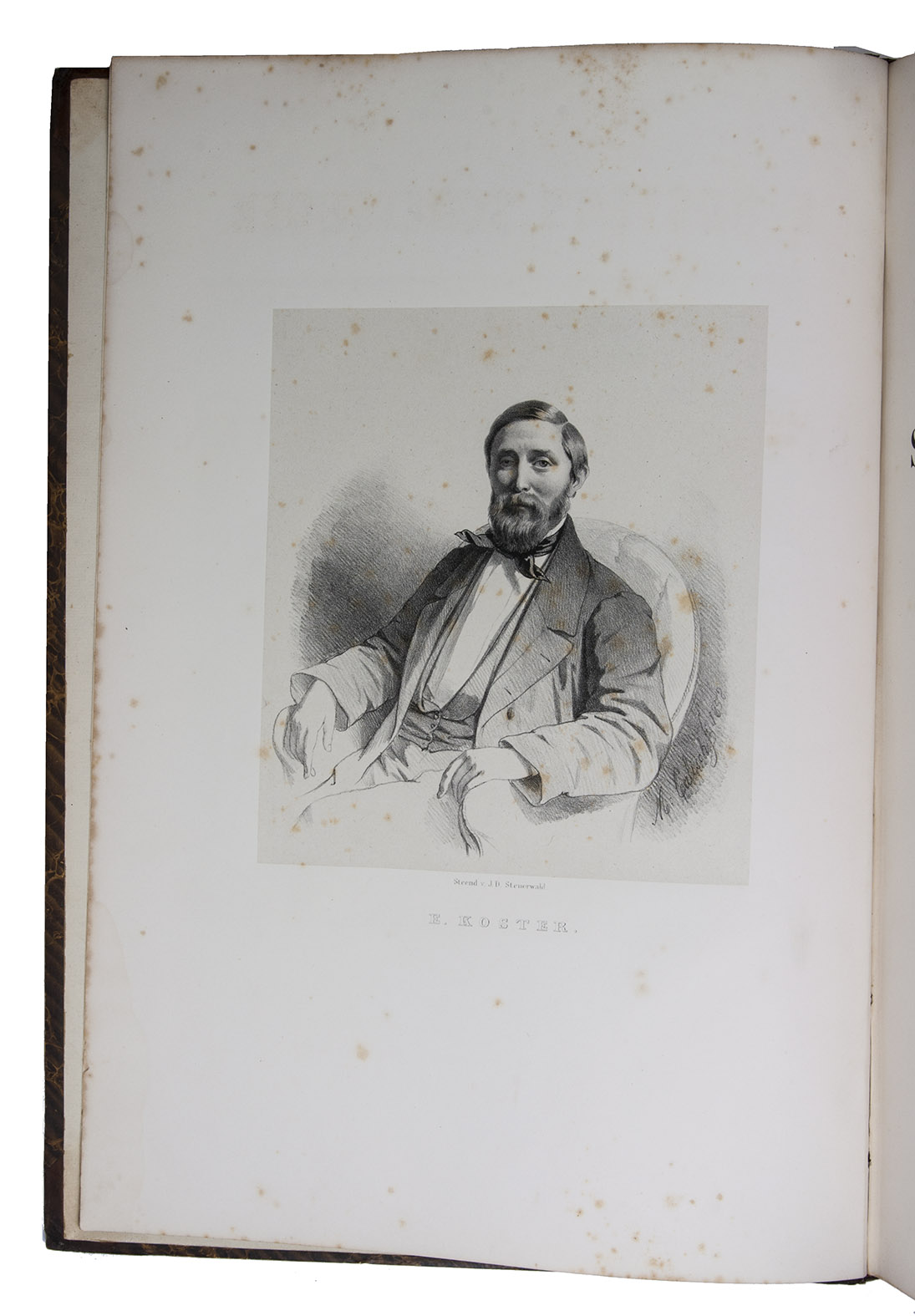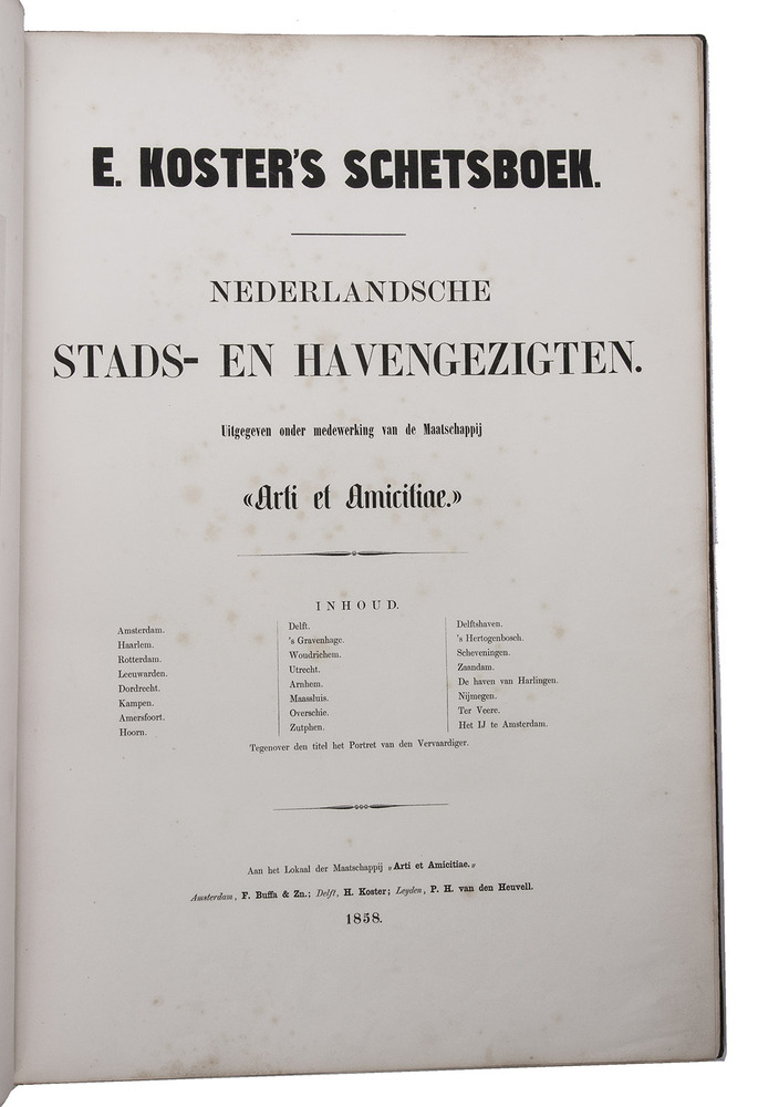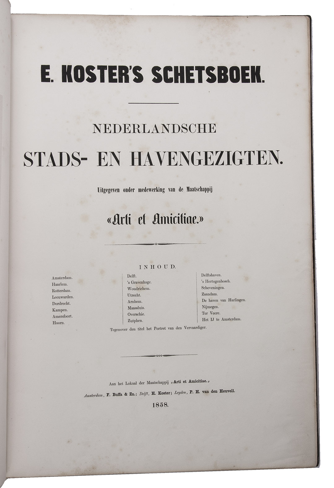 Amsterdam, F. Buffa & son; Delft, H. Koster; Leiden, P.H. van den Heuvel, 1858. Folio. With letterpress title-page, lithographed portrait of Koster and 24 tinted lithographed views of Dutch cities and harbours by Johannes Hilverdink after Everhardus Koster, printed by Steuerwald. Contemporary half calf. [26] ll.