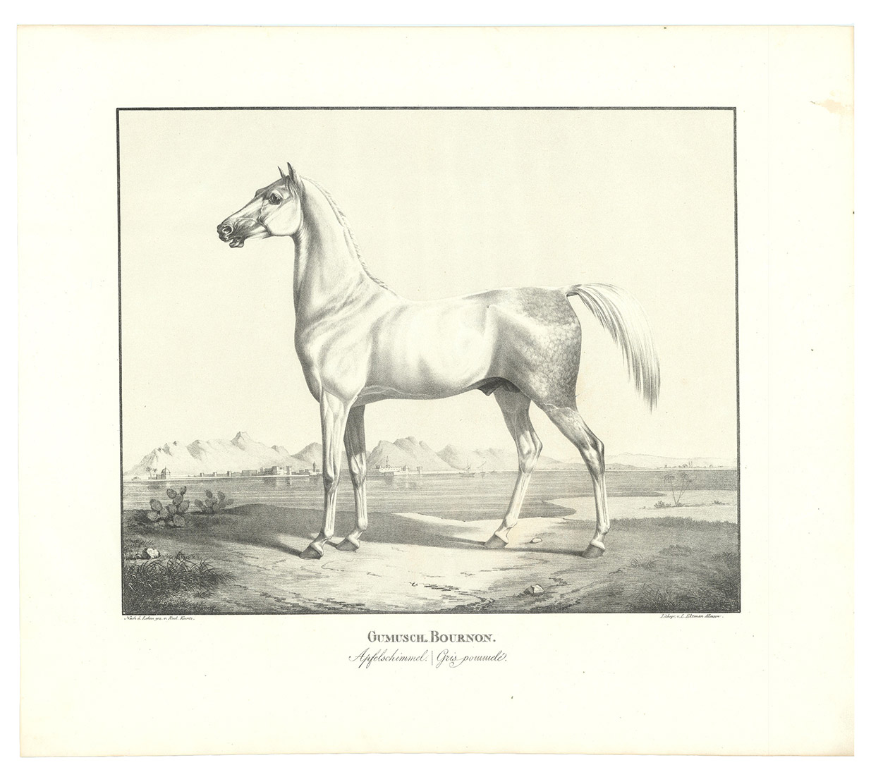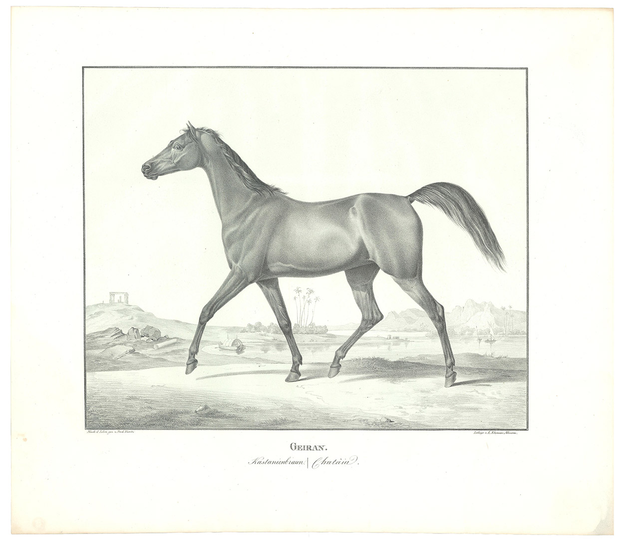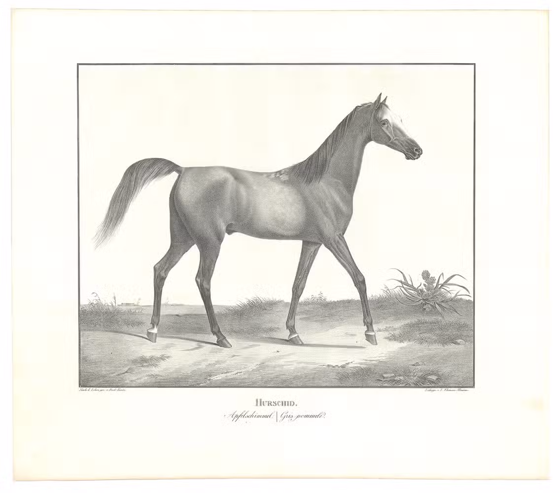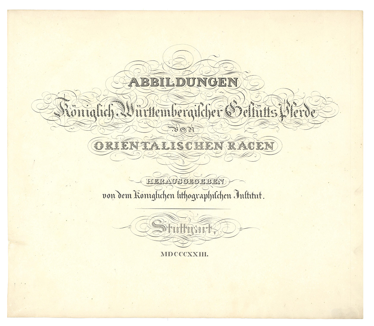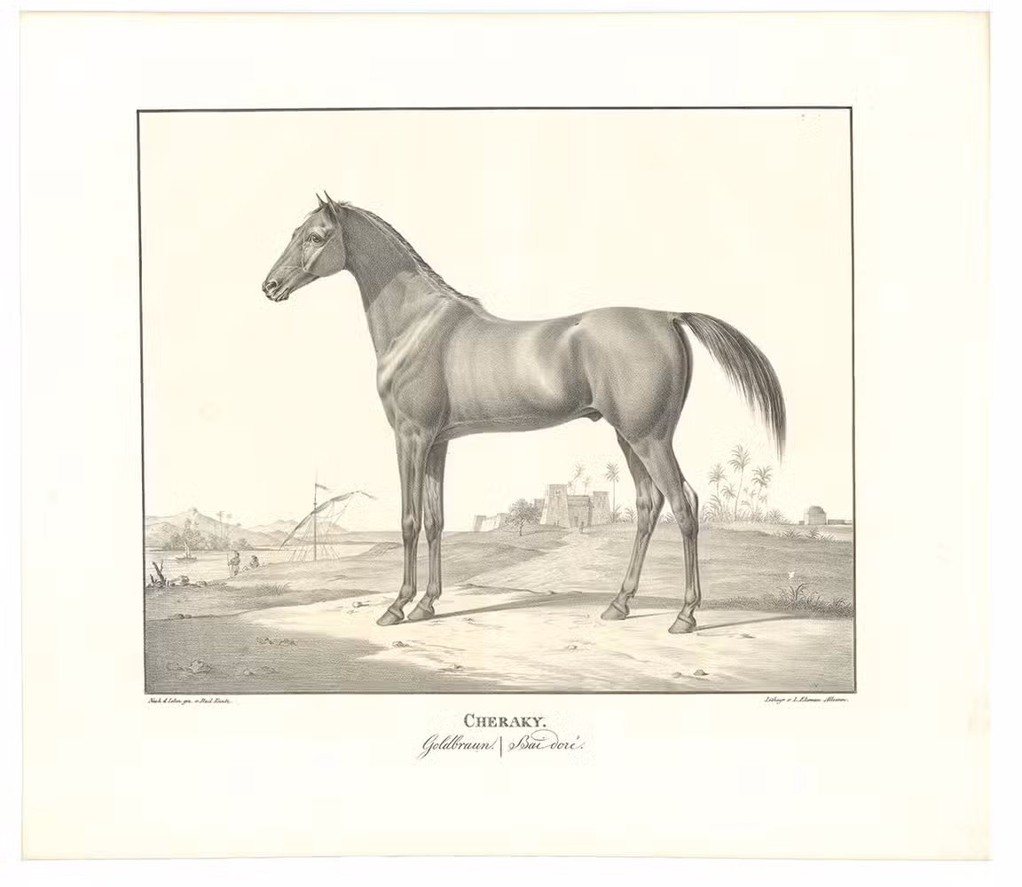 First and only edition, commissioned by the board of the Württemberg stud, the first Arabian stud farm in Europe. This almost unobtainable series of large format plates shows the studs full-blooded Arabian horses with decorative oriental backgrounds. The plates constitute extremely early examples of chalk lithographs (listed individually by Winkler, Frühzeit der dt. Lithographie, 180, 57). Kuntz (1797-1848) was known for his "excellent depictions of horses" (Thieme-Becker); throughout his brief career he studied thoroughbreds in England, Hungary and Paris as well as in Germany. In 1832 he became Painter to the Court of Karlsruhe, Baden; he suffered a stroke in 1846 and died in the newly-founded Illenau mental hospital. The present series was issued in three parts, from 1823 to 1824, each with 6 chalk lithographs. Wenceslaus Rzewusky wrote the descriptions of the horses. Of the utmost rarity, no copy of the complete series with all three parts as present here traceable in auction records. Nissen 2327; Thieme-Becker X, 444 & XXII, 116; Winkler, Die Frühzeit der dt. Lithographie 180.57; WorldCat (1 copy, at UB Utrecht, lacking 1 plate).