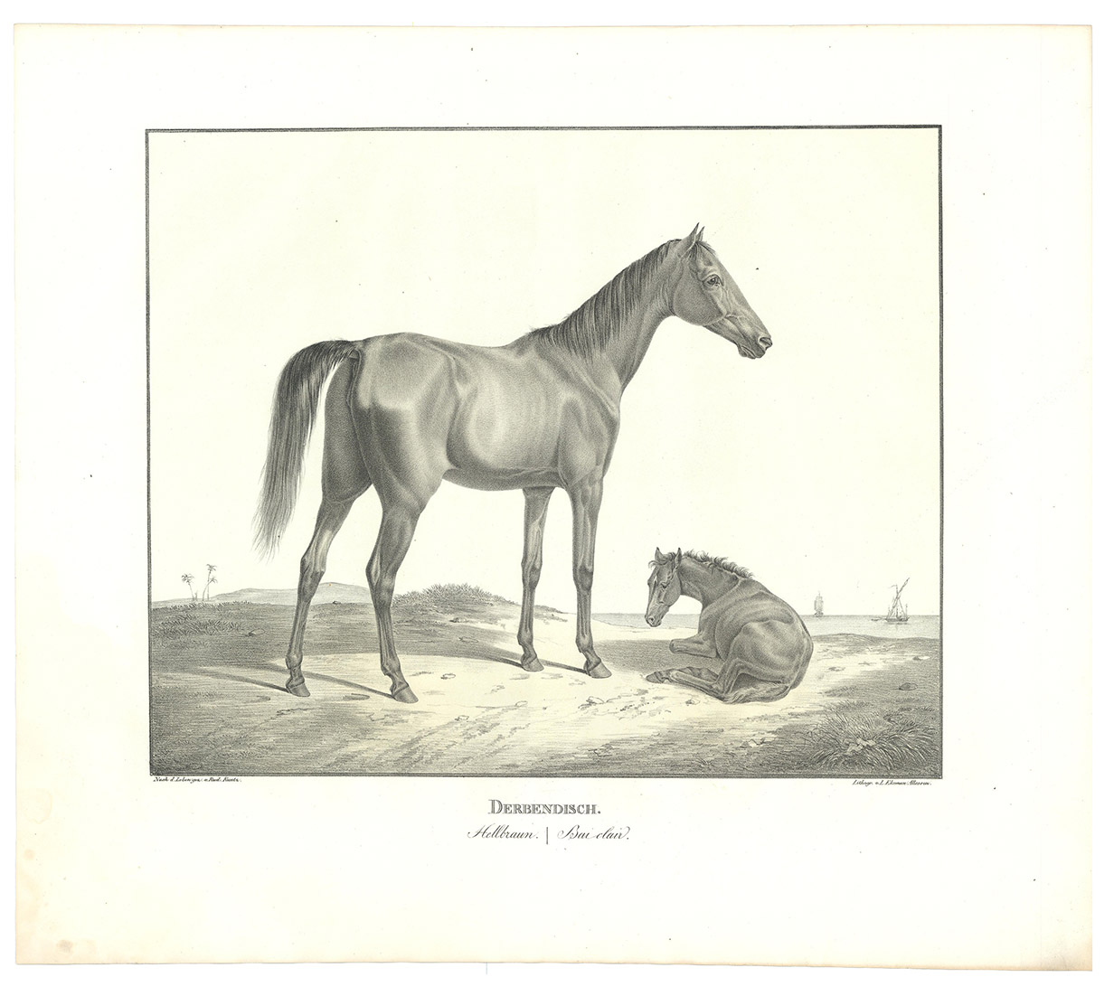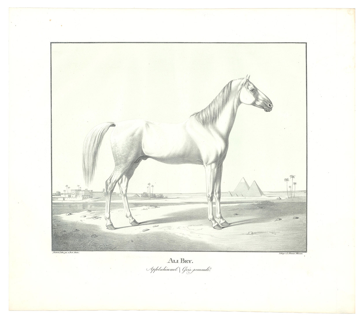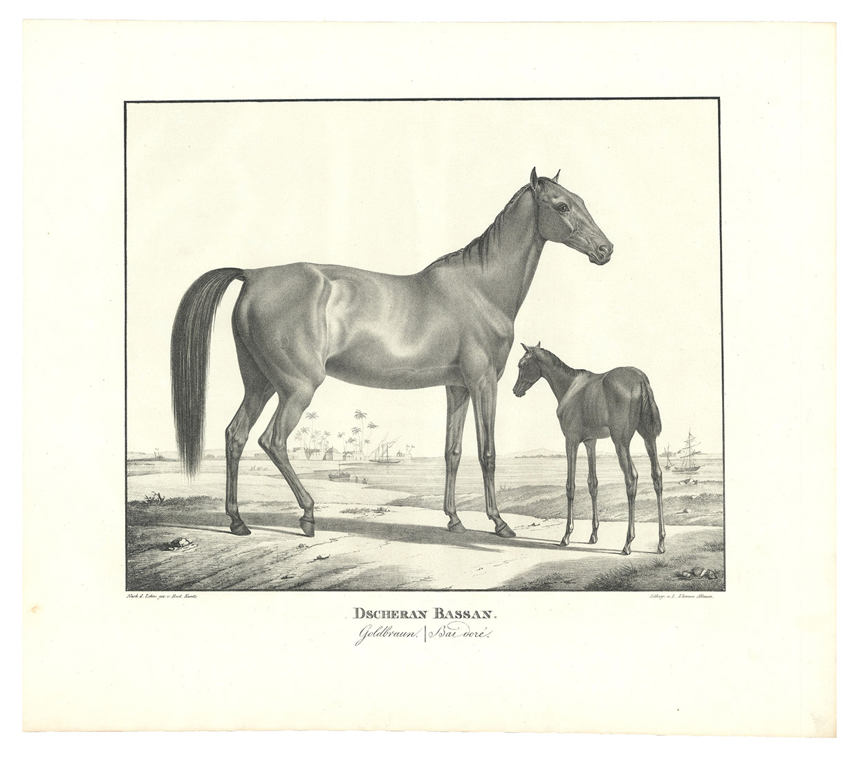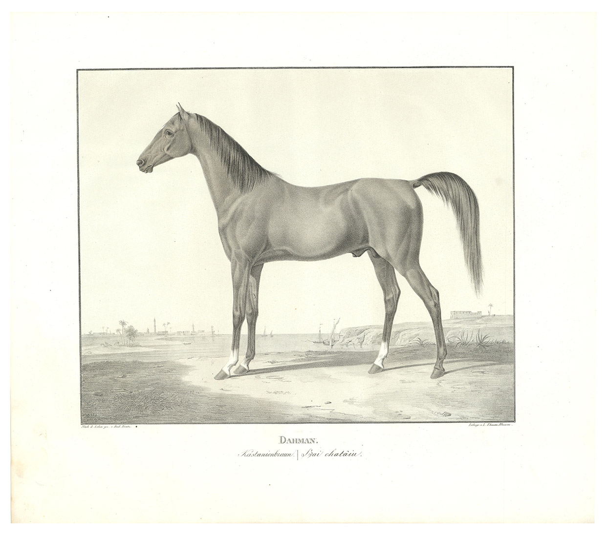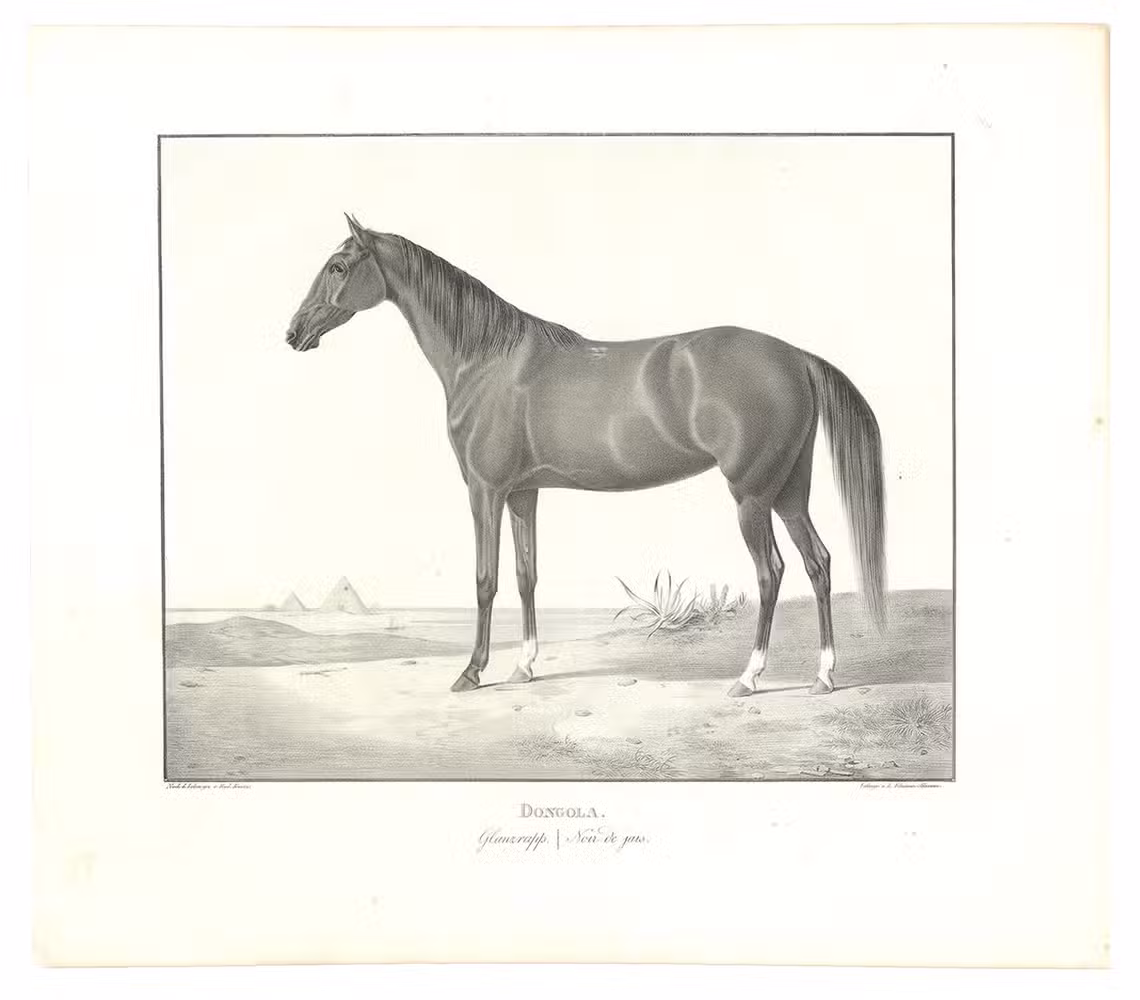 First and only edition, commissioned by the board of the Württemberg stud, the first Arabian stud farm in Europe. This almost unobtainable series of large format plates shows the studs full-blooded Arabian horses with decorative oriental backgrounds. The plates constitute extremely early examples of chalk lithographs (listed individually by Winkler, Frühzeit der dt. Lithographie, 180, 57). Kuntz (1797-1848) was known for his "excellent depictions of horses" (Thieme-Becker); throughout his brief career he studied thoroughbreds in England, Hungary and Paris as well as in Germany. In 1832 he became Painter to the Court of Karlsruhe, Baden; he suffered a stroke in 1846 and died in the newly-founded Illenau mental hospital. The present series was issued in three parts, from 1823 to 1824, each with 6 chalk lithographs. Wenceslaus Rzewusky wrote the descriptions of the horses. Of the utmost rarity, no copy of the complete series with all three parts as present here traceable in auction records. Nissen 2327; Thieme-Becker X, 444 & XXII, 116; Winkler, Die Frühzeit der dt. Lithographie 180.57; WorldCat (1 copy, at UB Utrecht, lacking 1 plate).