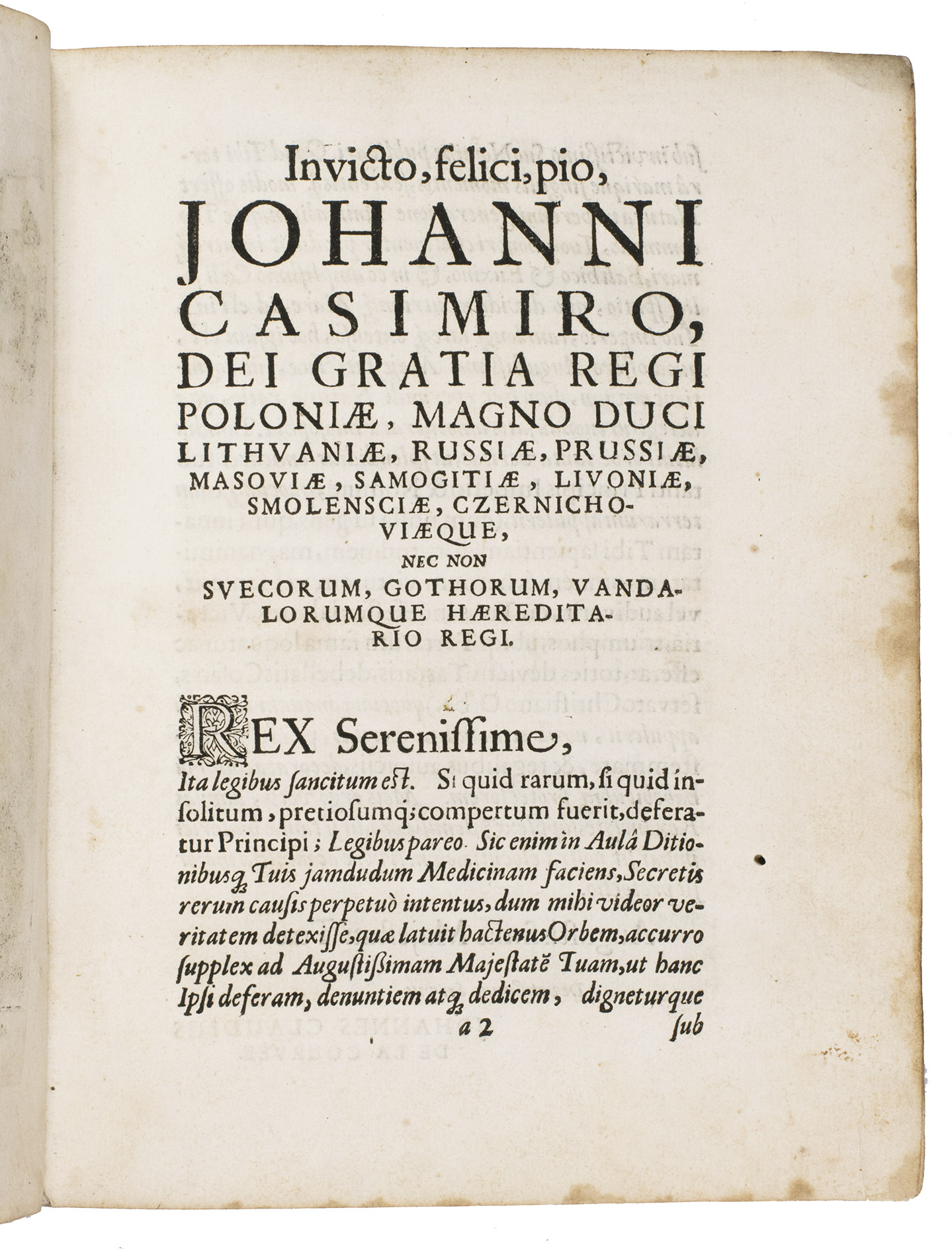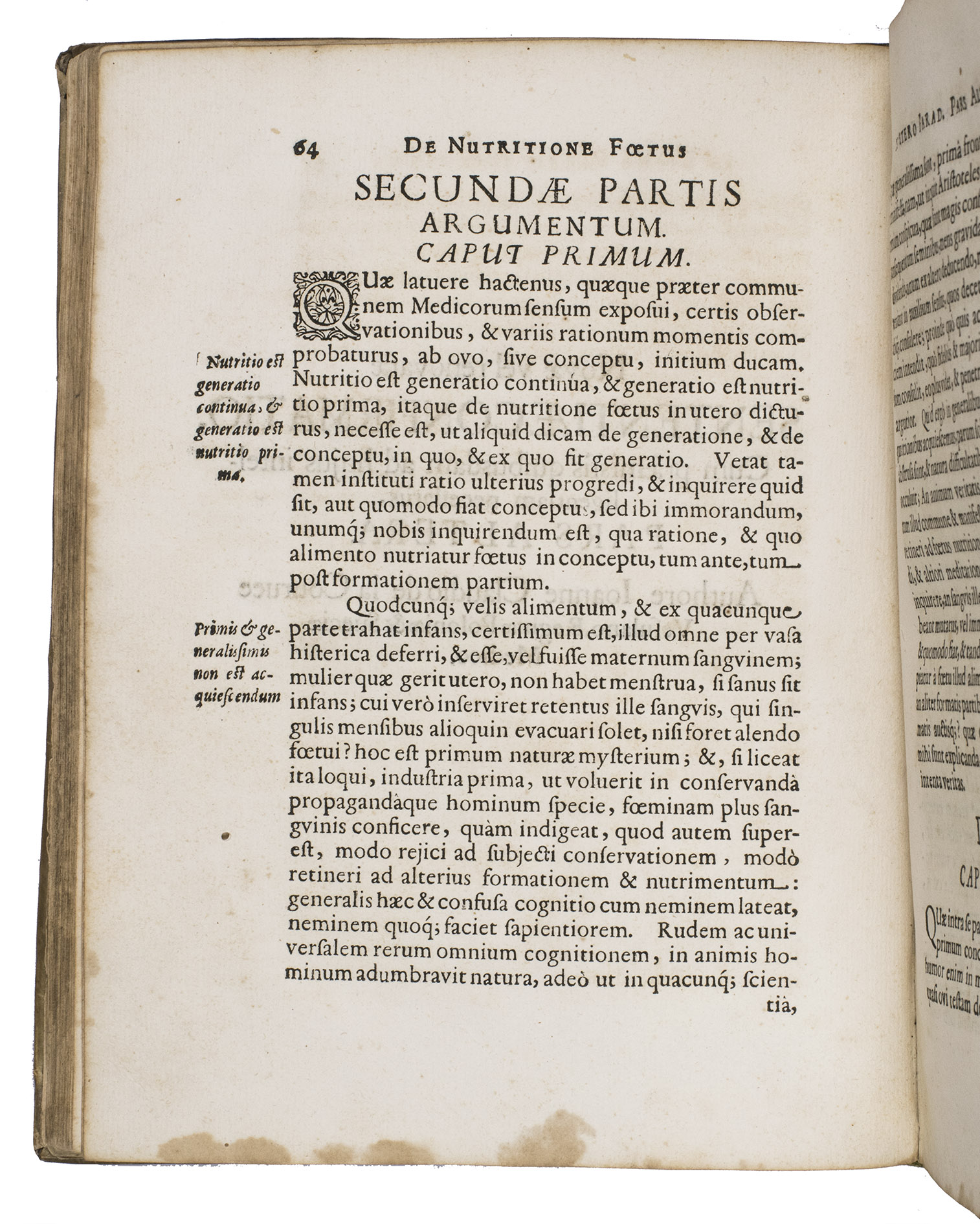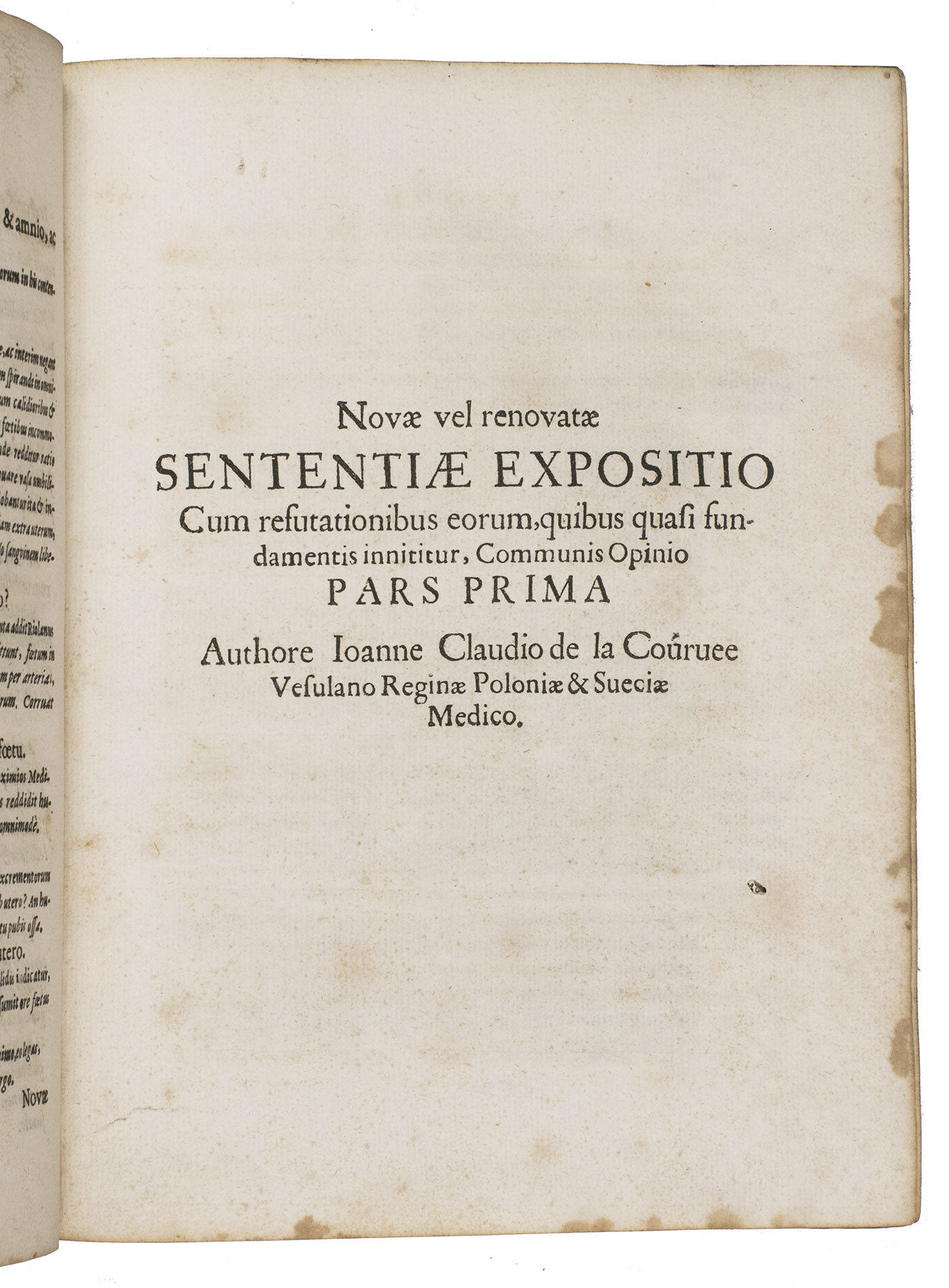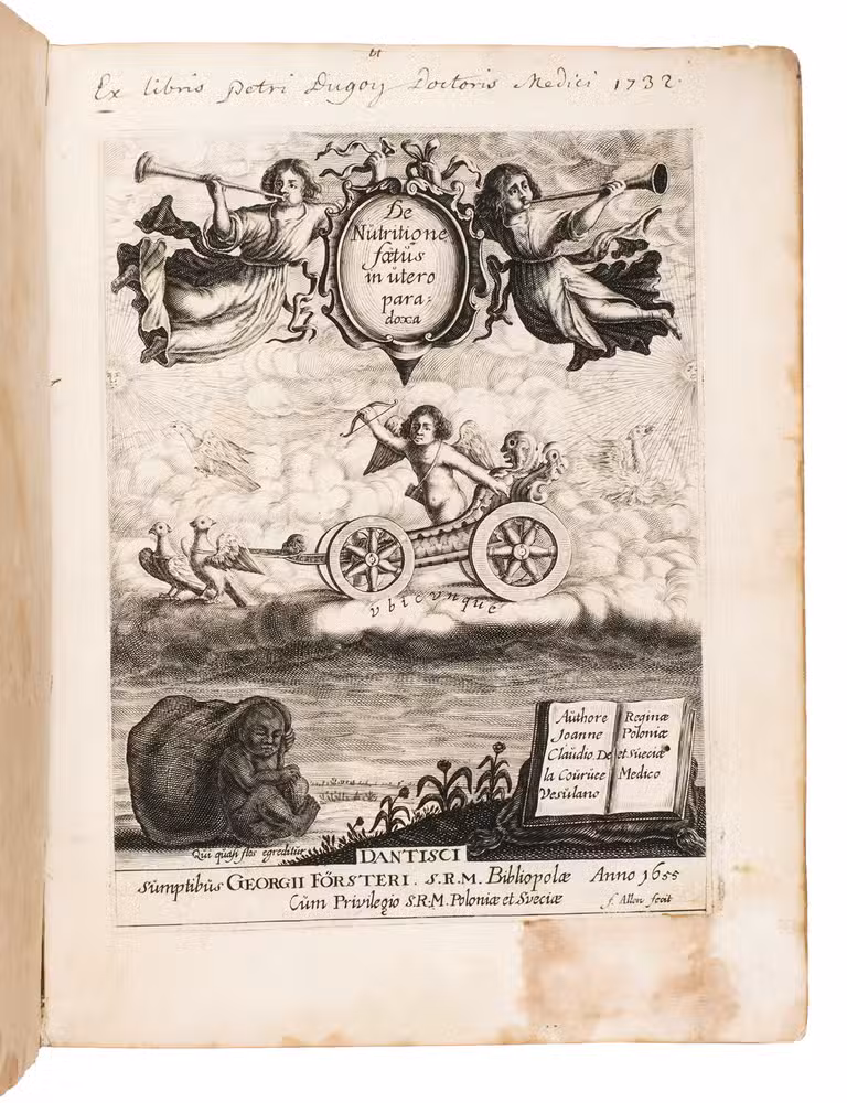 First edition of a Harveianum of great importance and rarity. Jean-Claude de La Courvee (ca. 1615-1664) studied medicine in Paris, and became physician to the Queen of Poland. In a publication on the use and abuse of bloodletting (Paris, 1647), he declared himself an opponent to this wide-spread practice. In the present work, the author supports William Harvey's (1578-1657) work on generation, not without being critical of several subjects. He maintains that the foetus breathes in the uterus, and feeds on the amniotic fluid. He also claims that the child contributes to his birth with his own efforts, thus advancing the delivery. La Courvee was the first to perform a successful symphysiotomy, which is described on p. 245 of the present work.