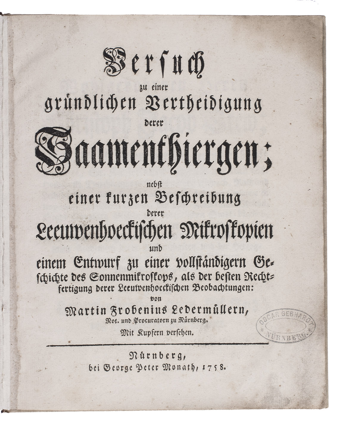 Versuch zu einer grundlichen Vertheidigung derer Saamenthiergen; nebst einer kurzen Beschreibung derer Leeuwenhoeckischen Mikroskopien und einem Entwurf zu einer vollständigern Geschichte des Sonnenmikroskops, als der besten Rechtfertigung derer Leeuwenhoeckischen Beobachtungen.