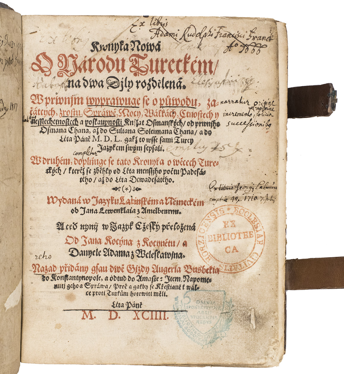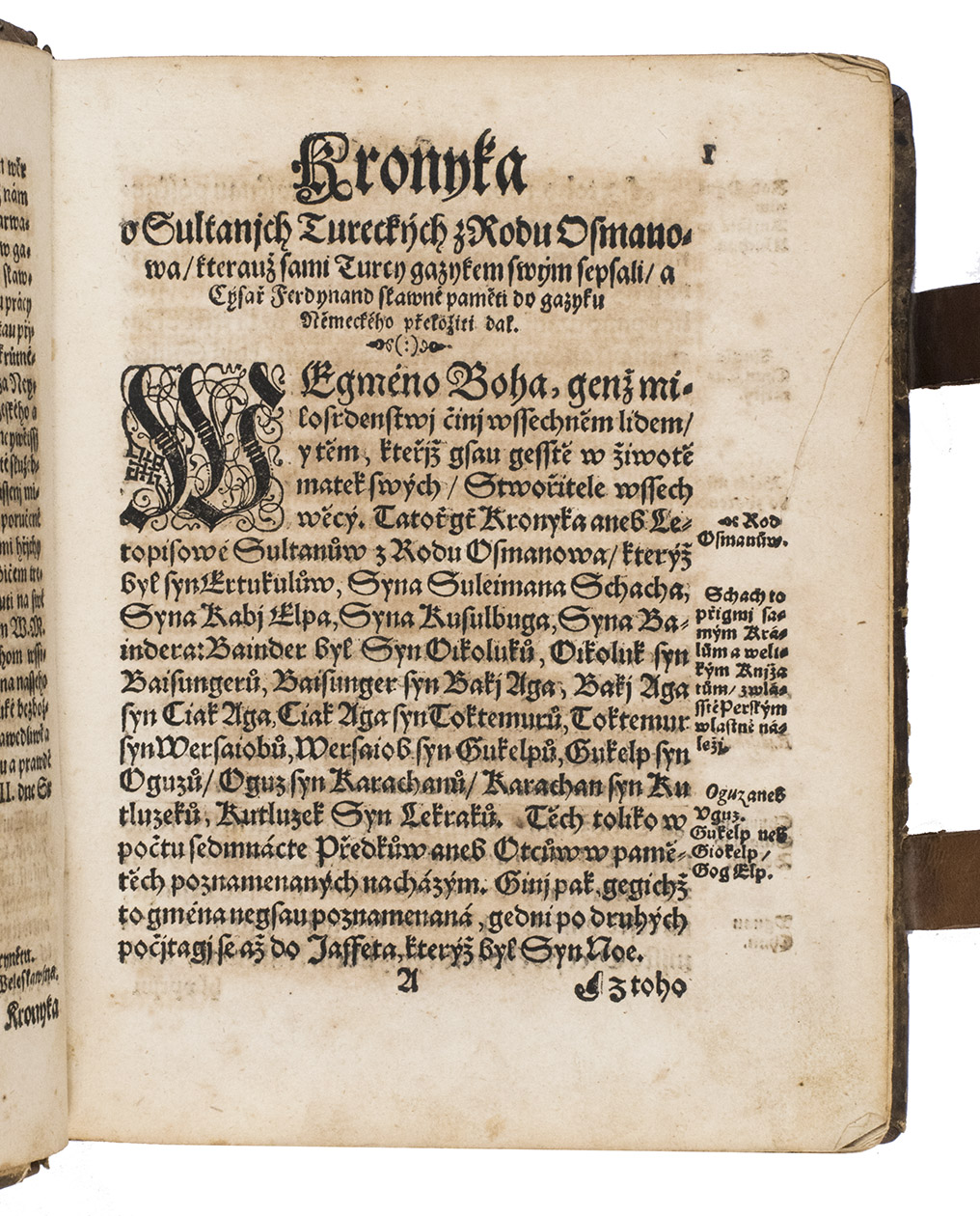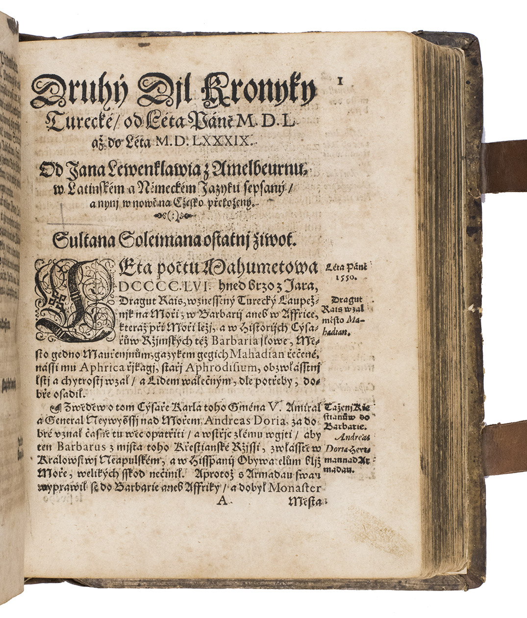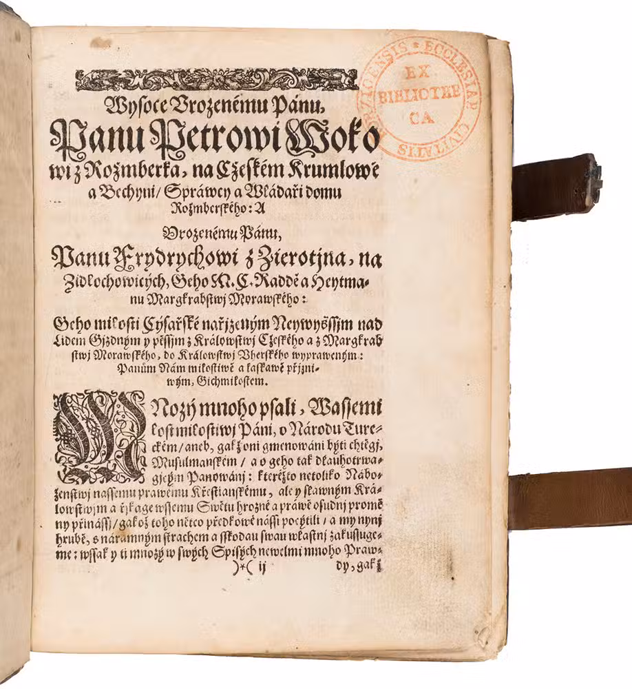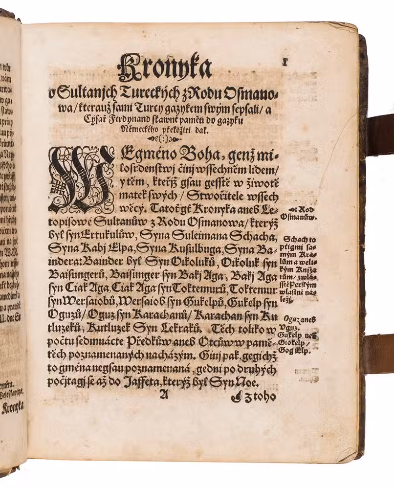Extremely rare first Czech edition of a famous Turkish chronicle, translated after the German by Jan Kocin. The text was based on a 16th-century Turkish manuscript by Muhammed ibn Hasanjan, called Saadeddin, which described the Turkish history up to the year 1550. This manuscript was brought from Istanbul by the Austrian scholar Hieronymus Beck in 1551, and subsequently translated into German by Joannes Gautier, or Spiegel, the interpreter of the Holy Roman Emperor Ferdinand I. Gautier augmented the manuscript with a continuation of the history to the year 1588, and this version was rendered into Latin by Joannes Leunclavius, or Hans Lewenklau.