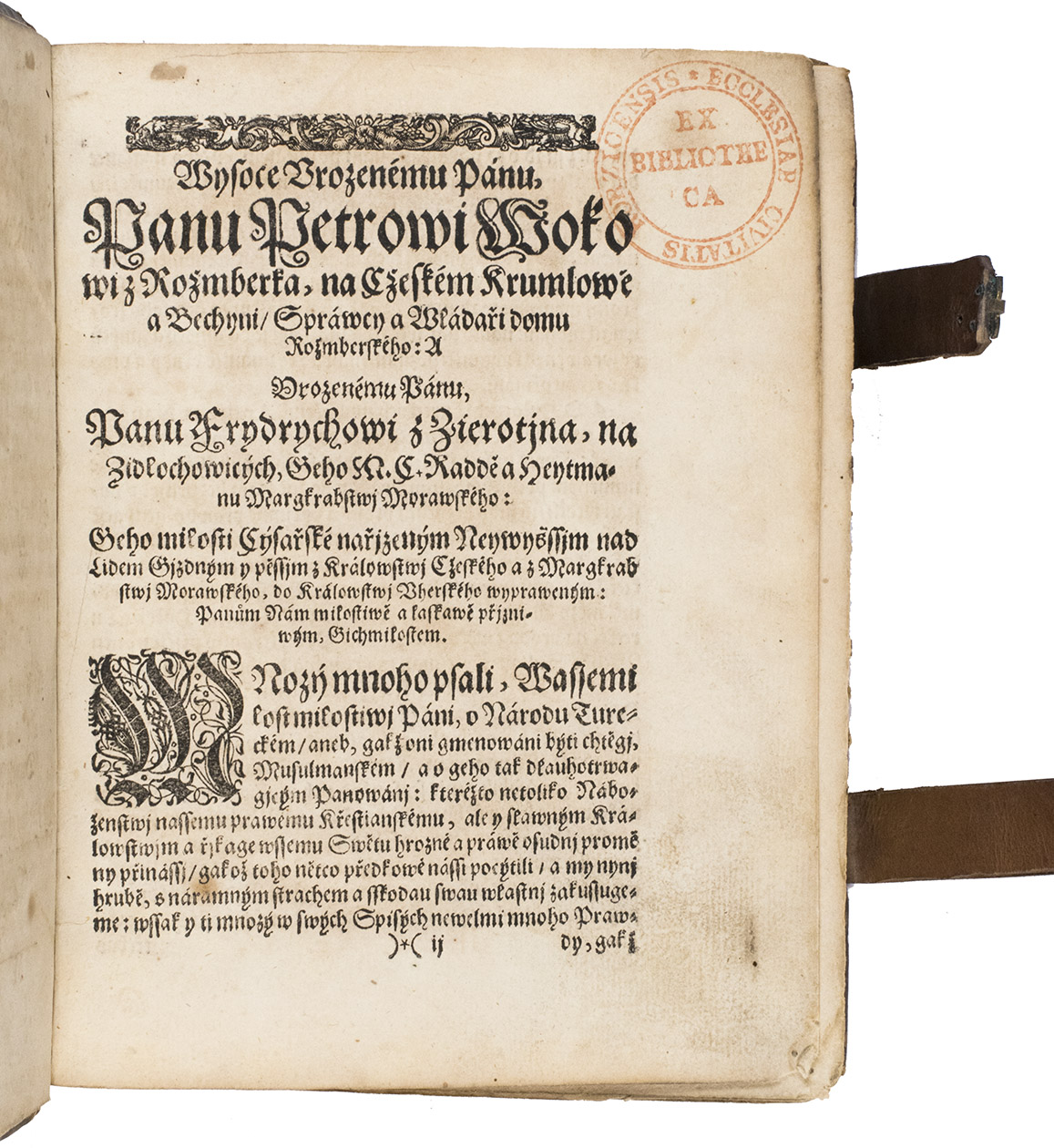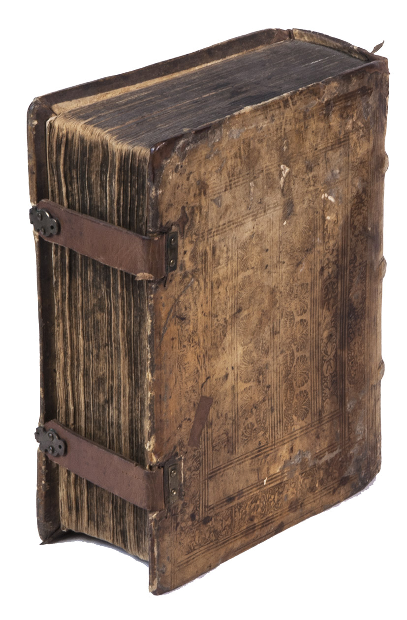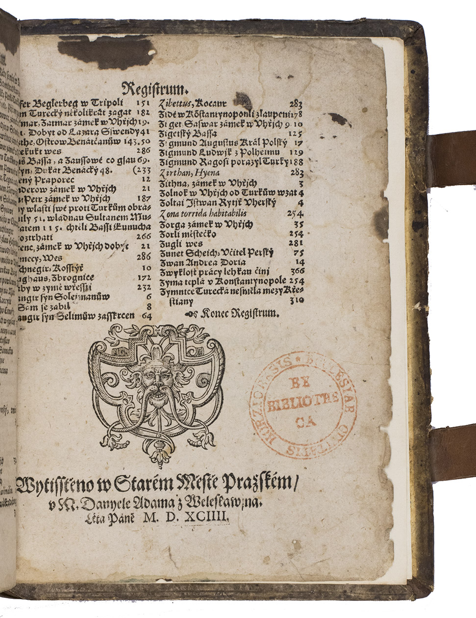 Prague, Daniel Adam, 1594. 2 volumes bound as 1. Small 4to (19.5 x 15.5 cm). With the title-page of volume 1 printed in red and black, and the colophon with large woodcut printer's device; the 2nd volume with woodcut ornament on the title-page, and the colophon with a woodcut vignette. Contemporary blind-tooled vellum, with 2 leather straps with brass clasps (later). [12], 28, [1], [3 blank]; [16], 385, [18], [1 blank] pp.