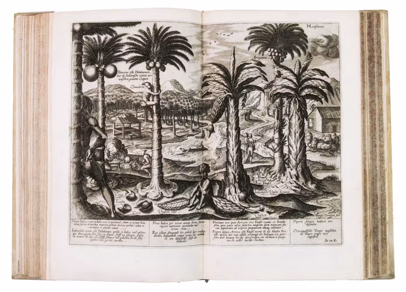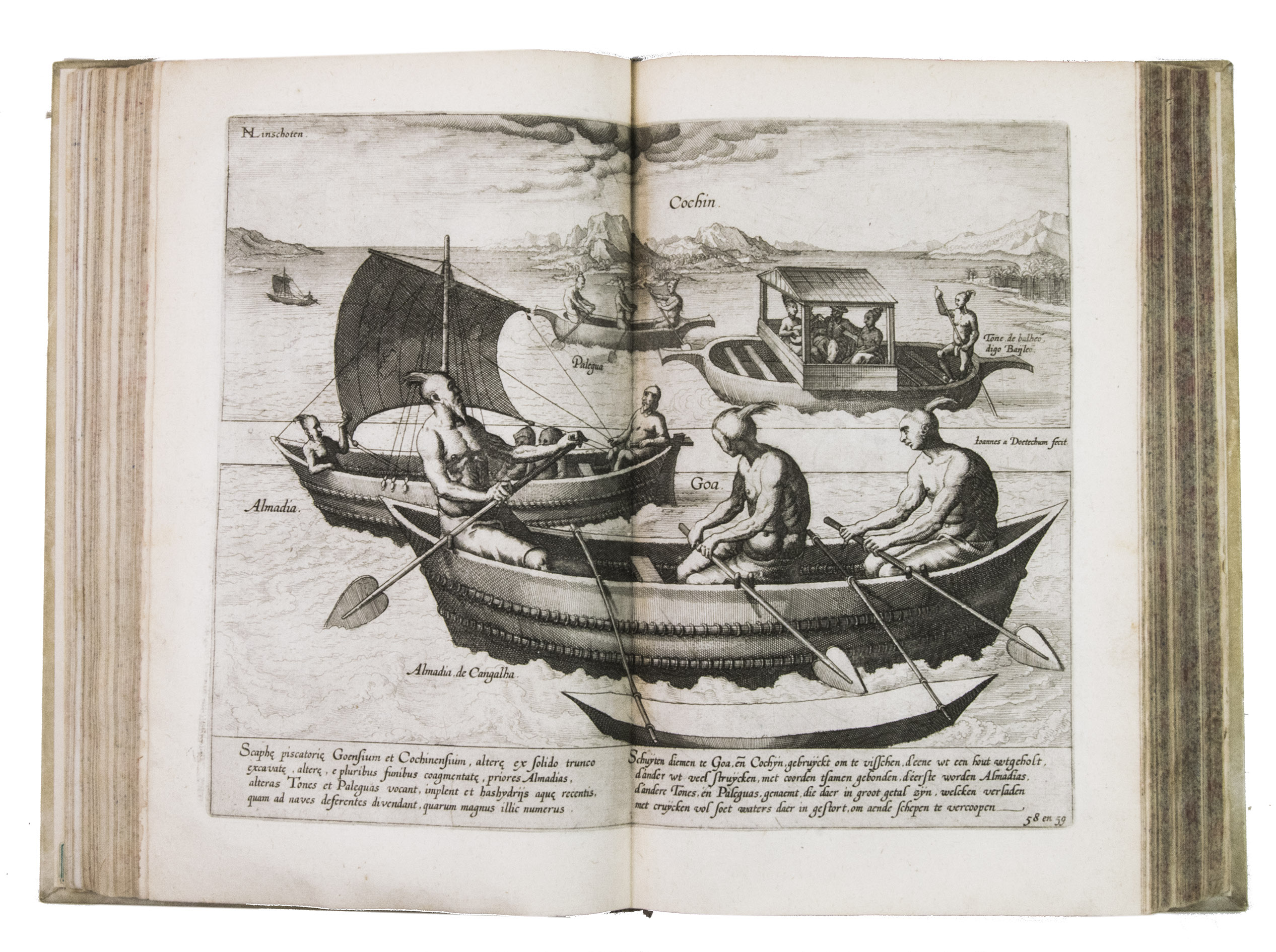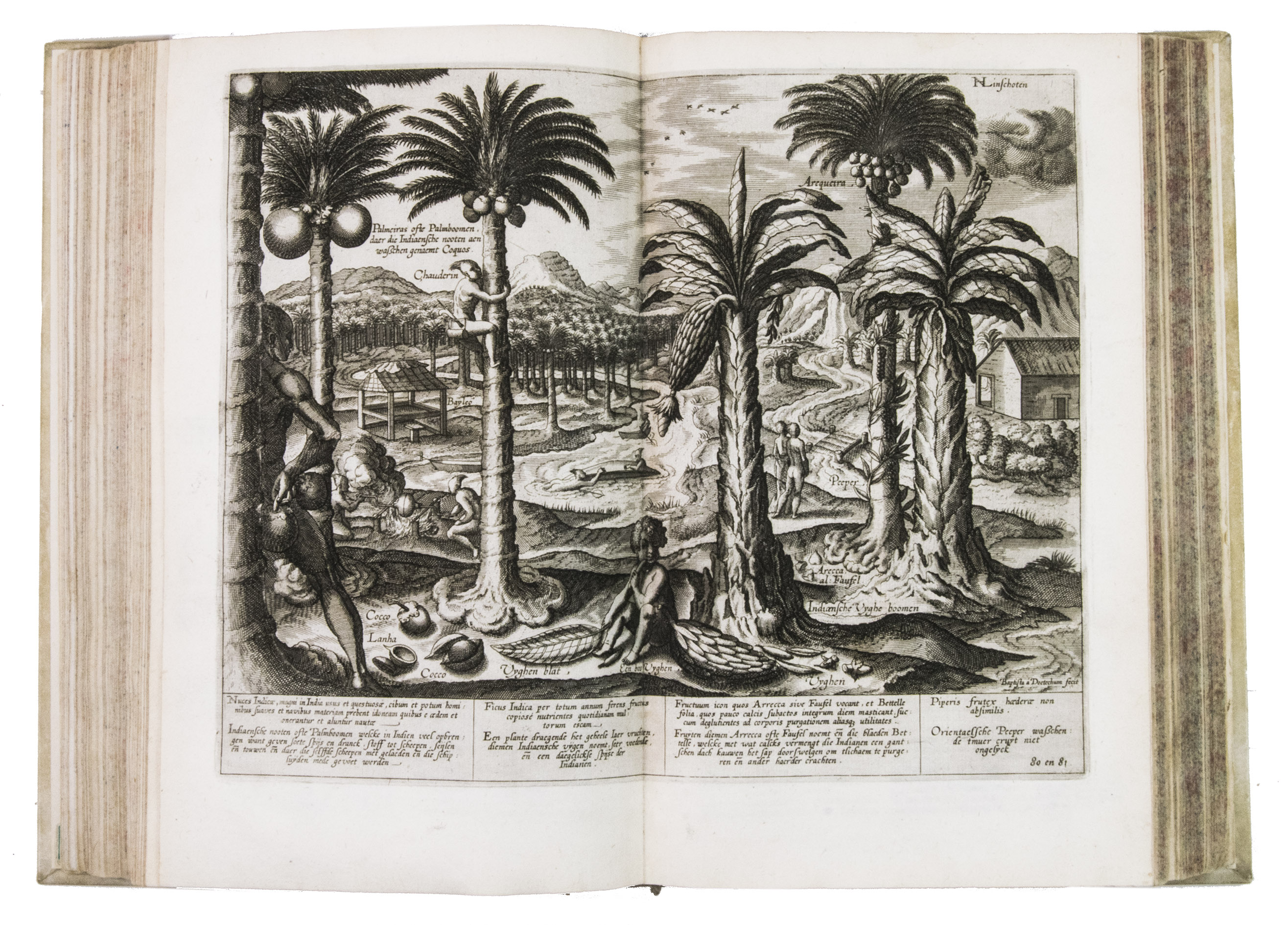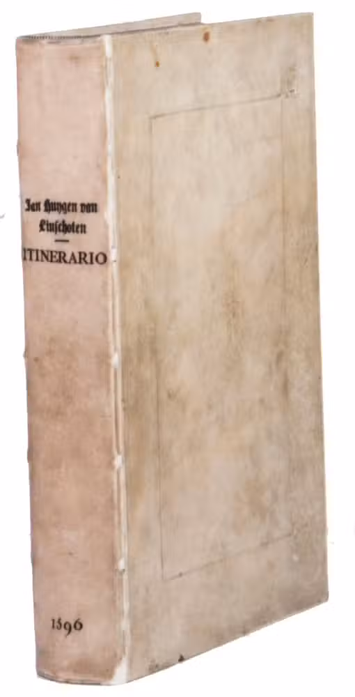 Van Linschoten sold the story of his travels to the Amsterdam bookseller and publisher Cornelis Claesz, who had specialised in shipping, geography and travels, and who published it in 1596 (this copy), containing Van Linschoten's personal experiences and travels, and, among very many other things, the commercially sensitive information to which he had had access to in Goa. The work provided the Dutch with valuable information regarding Portuguese sea routes to the East, their resupply points around Africa and their trading stations in the East, as well as important navigational data about currents, deeps and the location of islands and sandbanks, being absolutely vital for safe navigation. Thus, the greatly coveted shipping route to the East Indies and the route between the Asiatic sea ports came within reach, offering the missing link to the search into itineraries and trade routes to the Indonesian archipelago. Linschoten also gives detailed descriptions of the Portuguese territories and how they were administrated, including descriptions of spice trees and spice growing areas.The work was immediately a great success and went into many editions in Dutch over the course of the next fifty years. In 1598 a German edition appeared, and in the same year an English translation was published in London, entitled: John Huighen van Linschoten his discours of voyages into ye Easte & West Indies. French editions followed in 1610, 1619 and 1638. A Latin edition was published in 1599 without the maps.