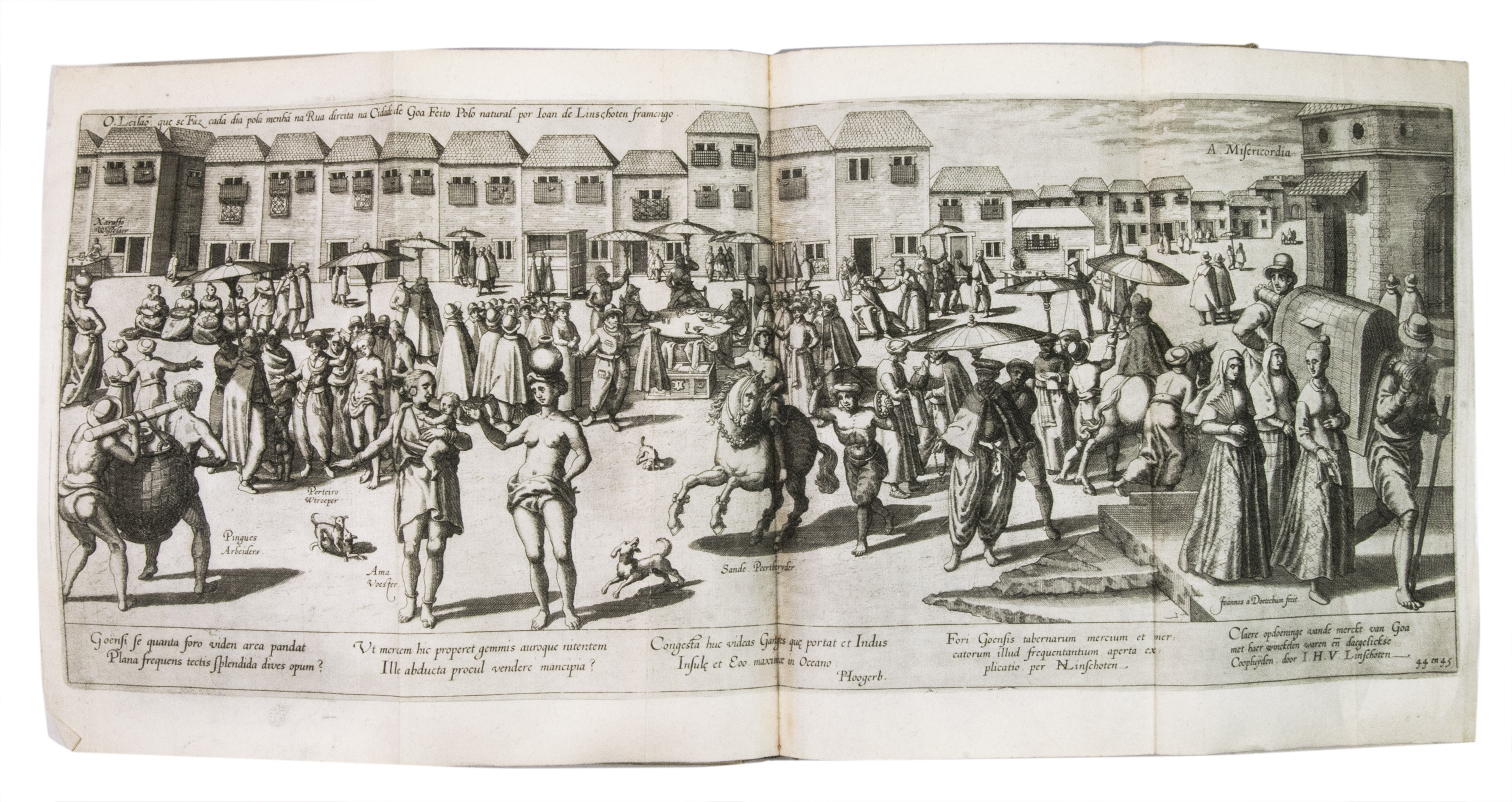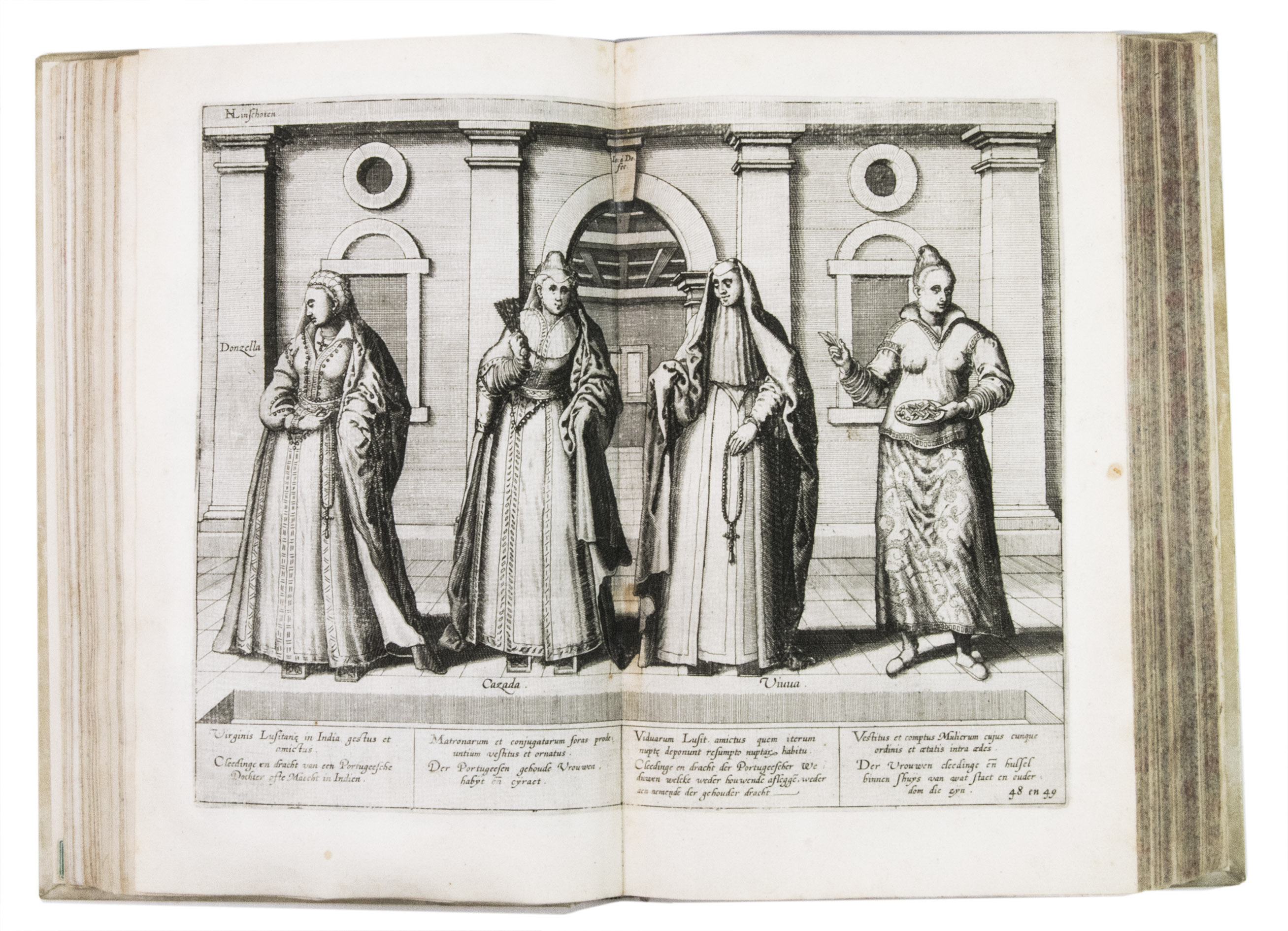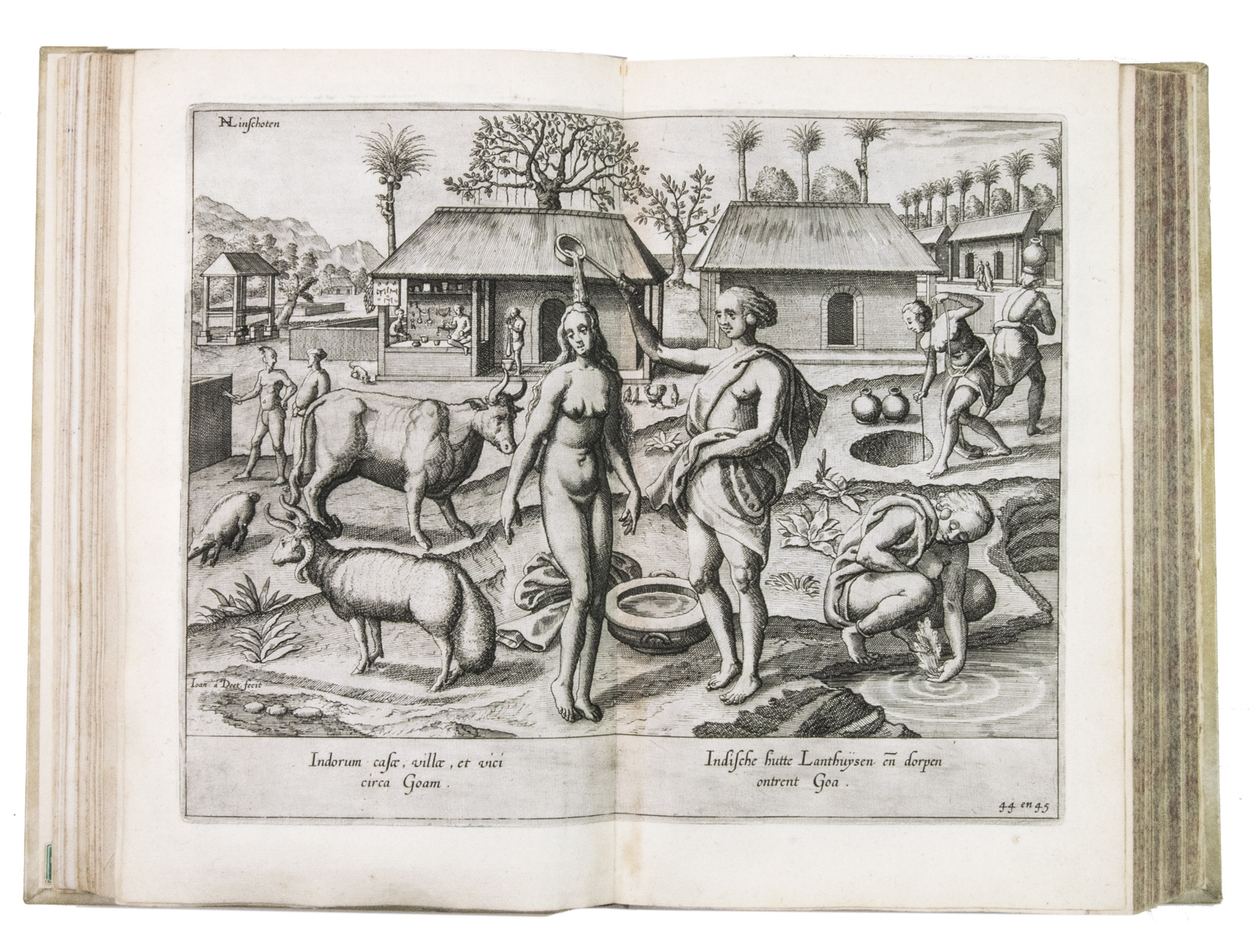 Van Linschoten sold the story of his travels to the Amsterdam bookseller and publisher Cornelis Claesz, who had specialised in shipping, geography and travels, and who published it in 1596 (this copy), containing Van Linschoten's personal experiences and travels, and, among very many other things, the commercially sensitive information to which he had had access to in Goa. The work provided the Dutch with valuable information regarding Portuguese sea routes to the East, their resupply points around Africa and their trading stations in the East, as well as important navigational data about currents, deeps and the location of islands and sandbanks, being absolutely vital for safe navigation. Thus, the greatly coveted shipping route to the East Indies and the route between the Asiatic sea ports came within reach, offering the missing link to the search into itineraries and trade routes to the Indonesian archipelago. Linschoten also gives detailed descriptions of the Portuguese territories and how they were administrated, including descriptions of spice trees and spice growing areas.The work was immediately a great success and went into many editions in Dutch over the course of the next fifty years. In 1598 a German edition appeared, and in the same year an English translation was published in London, entitled: John Huighen van Linschoten his discours of voyages into ye Easte & West Indies. French editions followed in 1610, 1619 and 1638. A Latin edition was published in 1599 without the maps.