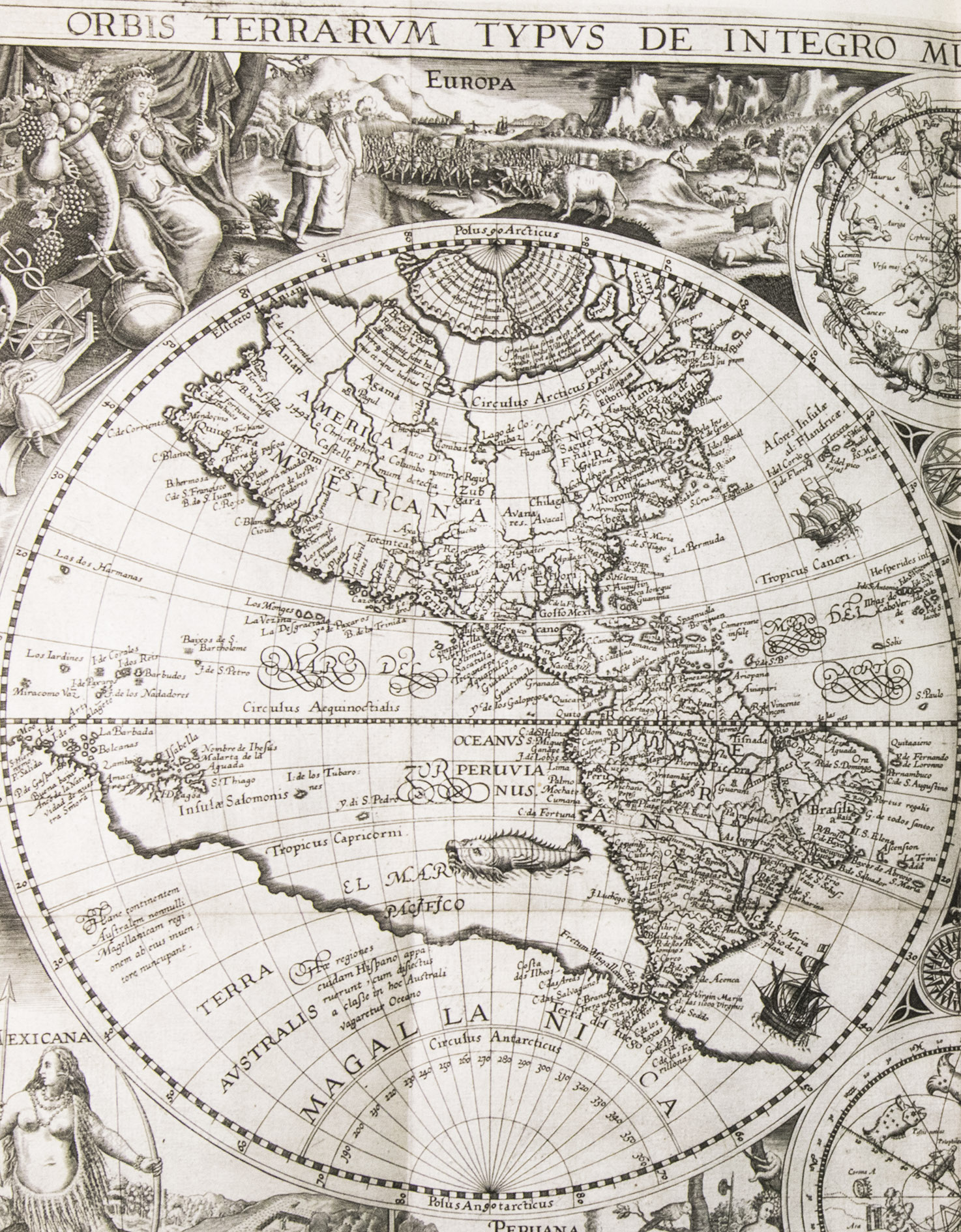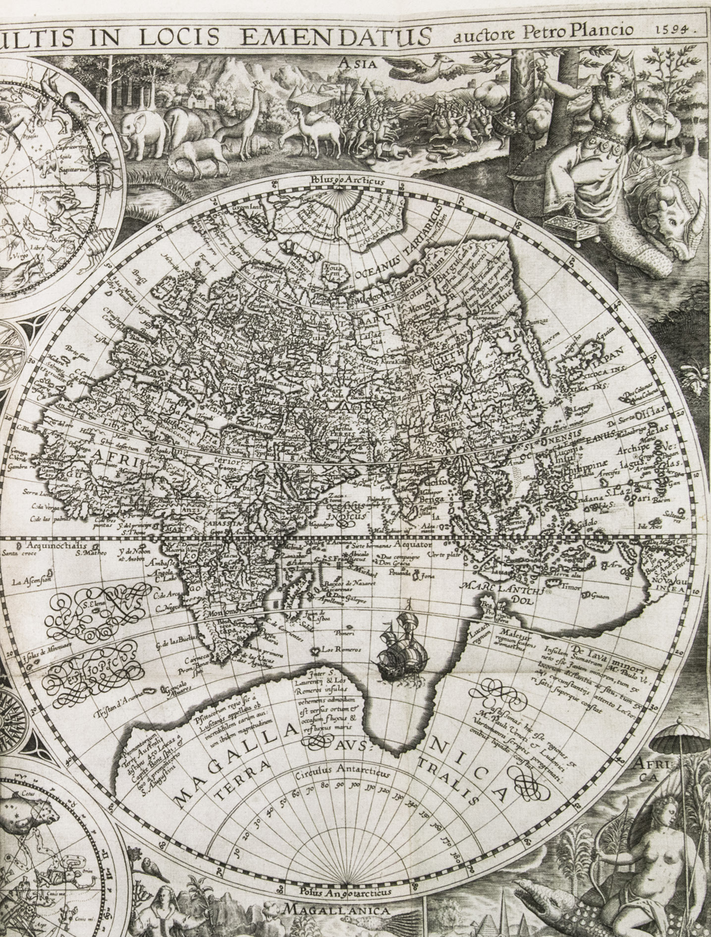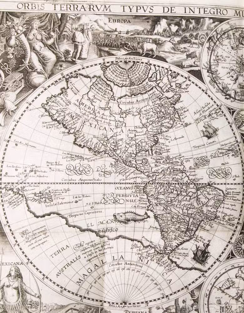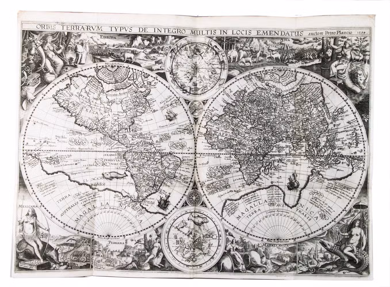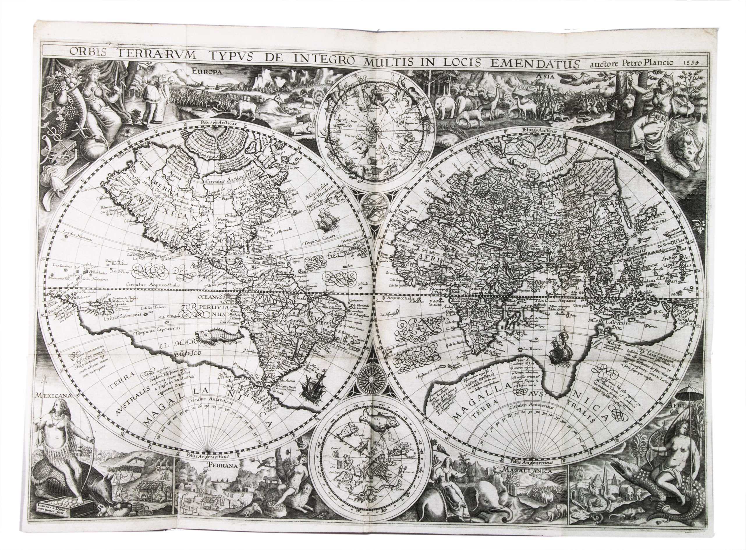 Amsterdam, Cornelis Claesz., 1596. 4 parts in 1 volume. Small folio (ca. 31 x 21 cm). With 6 folding maps, 36 folding or double-page plates, a full-page author's portrait, and a large illustration on each of the 4 divisional title pages, all engraved. Contemporary blind-tooled vellum over modern boards (?), with the manuscript author, title, and year of publication on the spine, red and blue sprinkled edges. [8], 160; 134, [4], 135-147; [82], [2 blank], [8] pp.