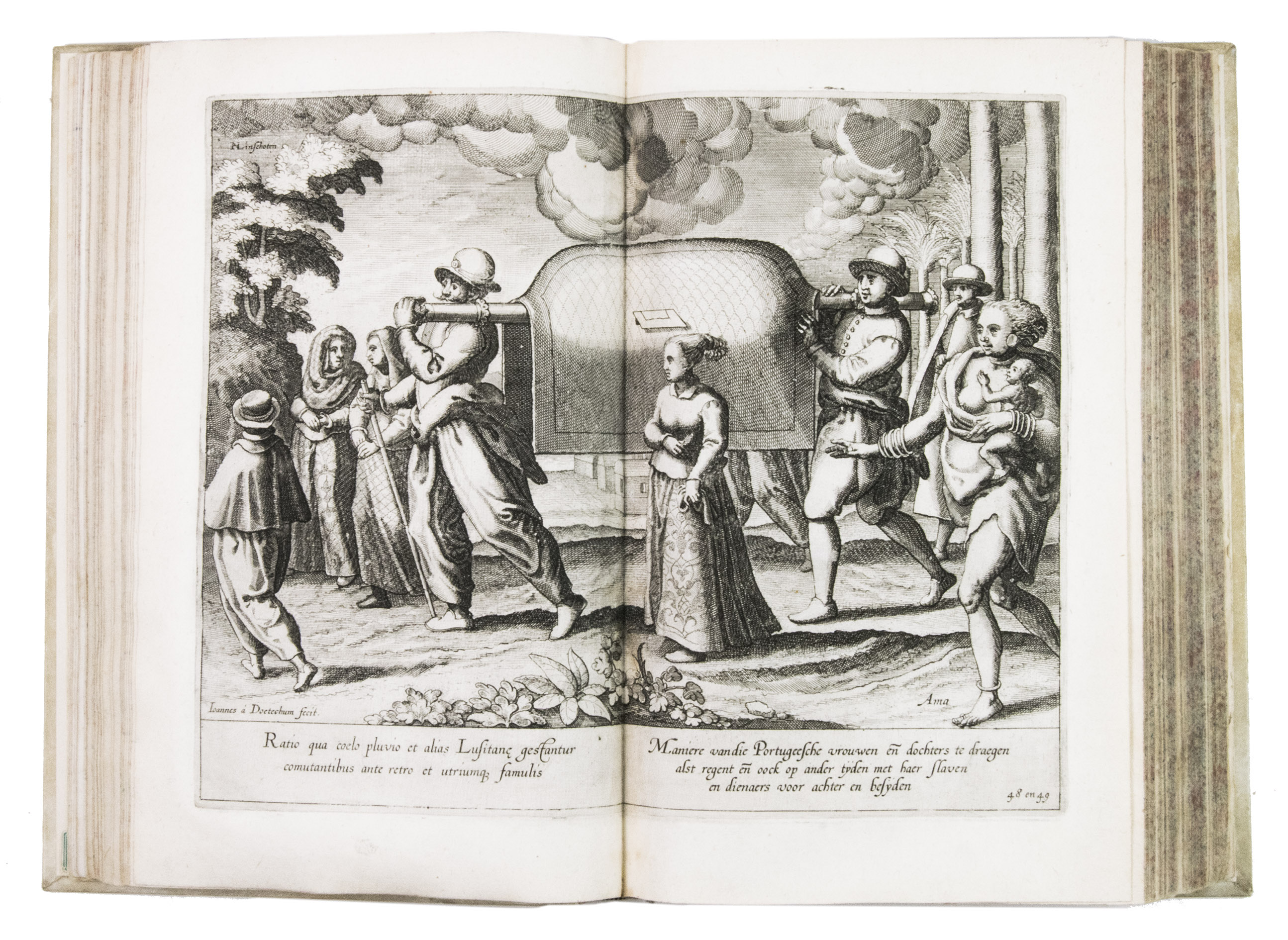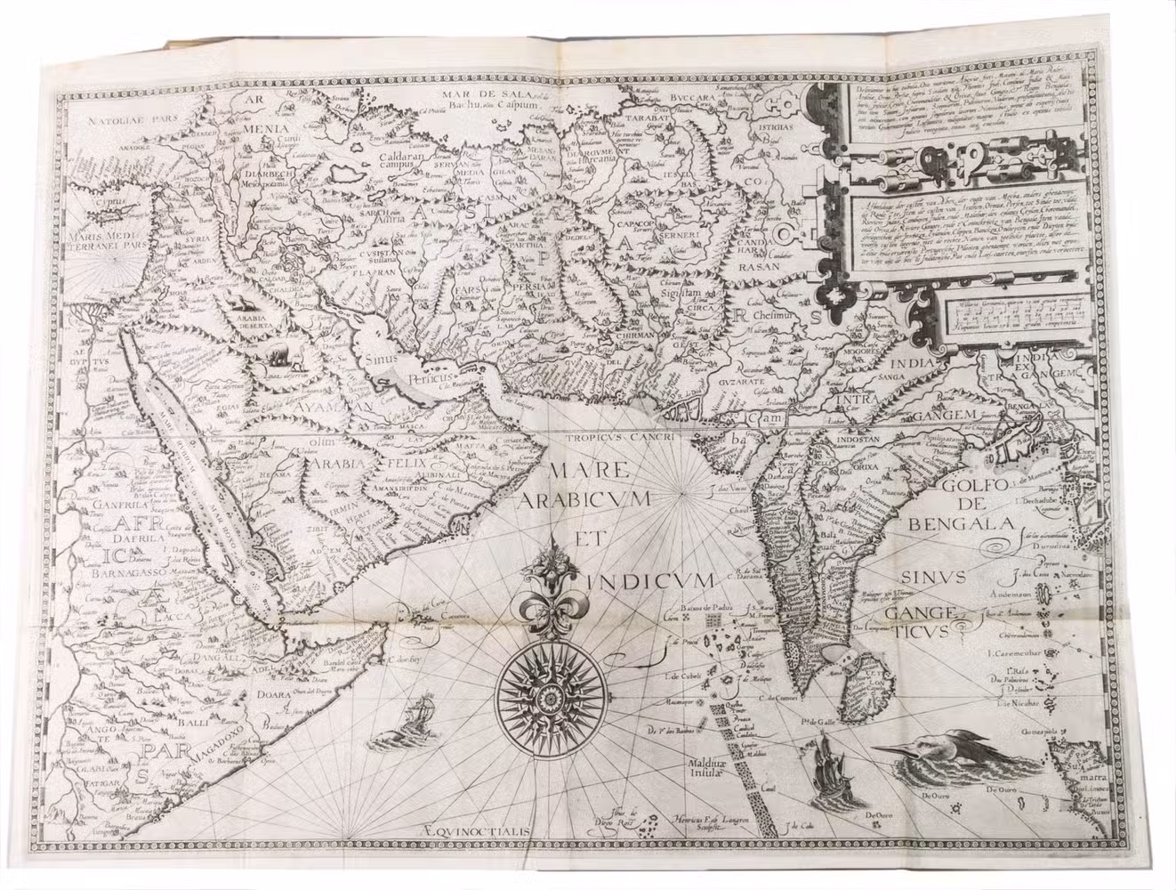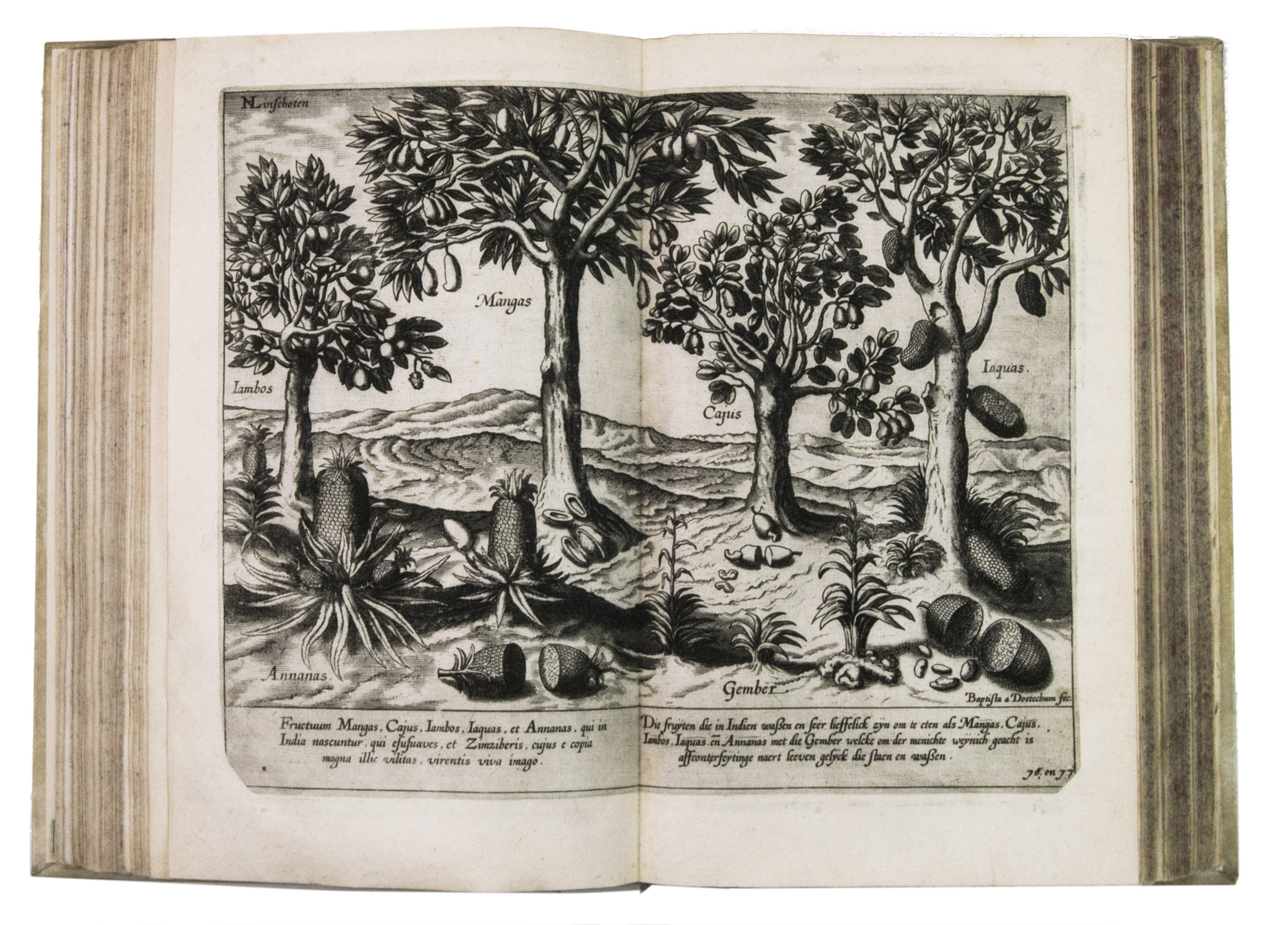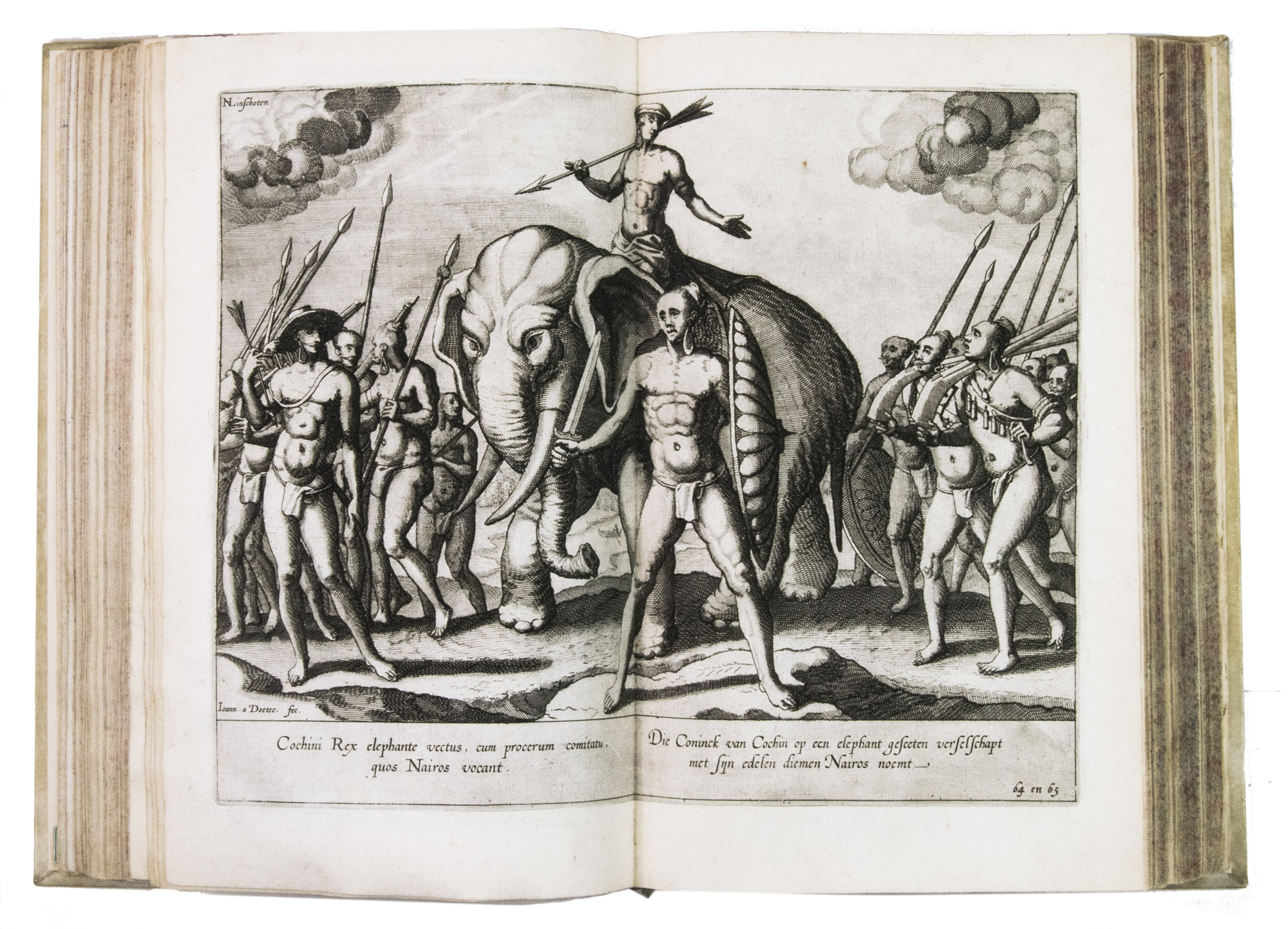 With the bookseller's label of R. W. P. de Vries in Amsterdam mounted at the foot of the front pastedown, and the rare "Waerschouwinge voor de boekbinders" loosely inserted in the back. The work has been recased with new endpapers and supports, small restorations on the head and foot of the spine. The work is slightly browned throughout, part 3 (ads 2a and 2b) has been bound before part 2 (ad 3), small restorations at the bottom outer corner of some of the leaves, small tears in the folds of some of the maps, mostly in the margins, contemporary annotations in the margins of some of the leaves and on the verso of some of the plates, the chapter titles on page 12-20 and 31-34 in ad 1 have been corrected with a small strip of paper glued on top, the leaves of ad 3 have been numbered by hand. Otherwise in good condition. Alden & Landis 596/63; Borba de Moraes, pp. 486-487; Church 252; Howgego, L131-132; Parker, Books to build an empire, pp. 159-161; Sabin 41356; STCN 853189978 (9 copies); cf. Hill 1025 (English ed.); Nave, Philologia Arabica 22 (1623 ed.); for the map of Arabia, Persia and India: Tibbets 46 & pp. 23.