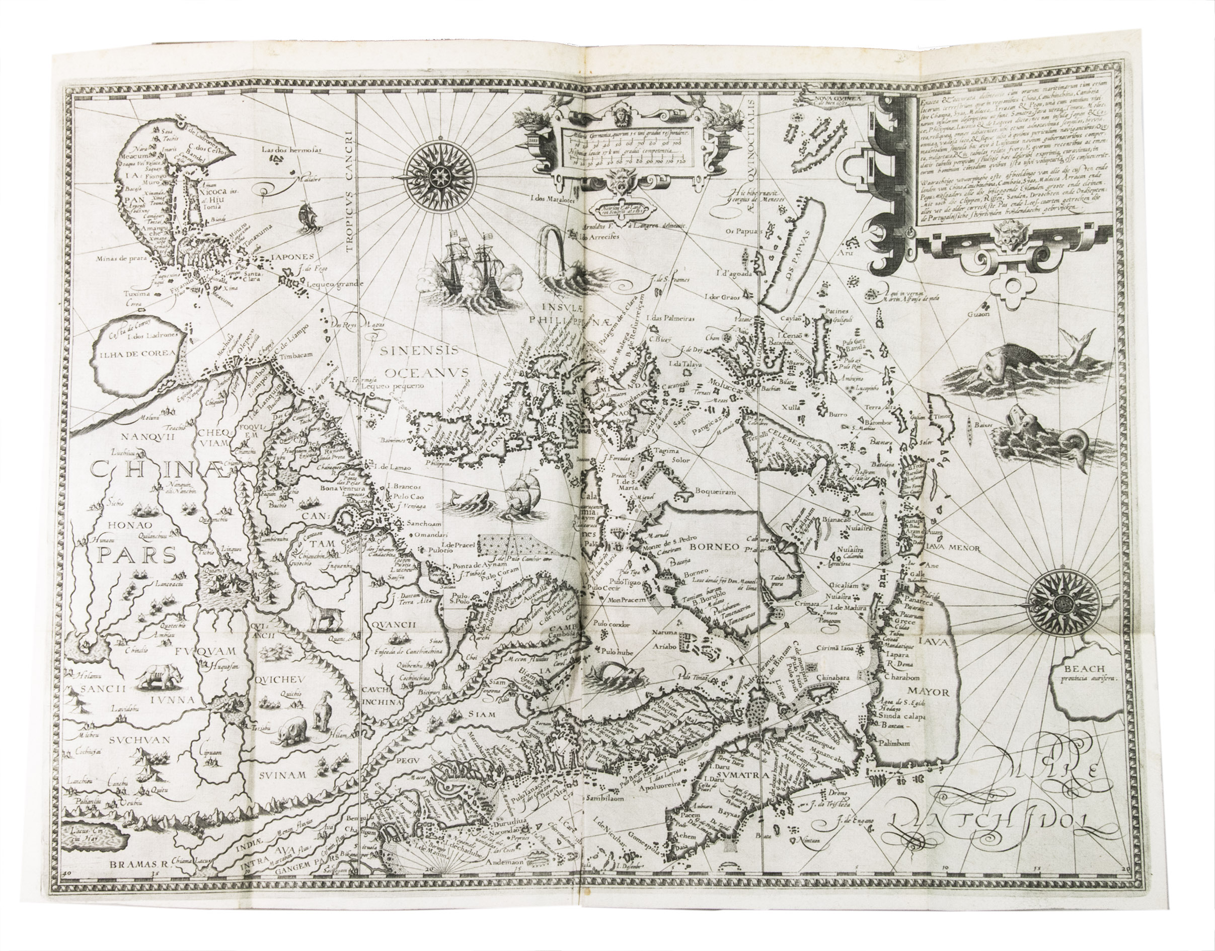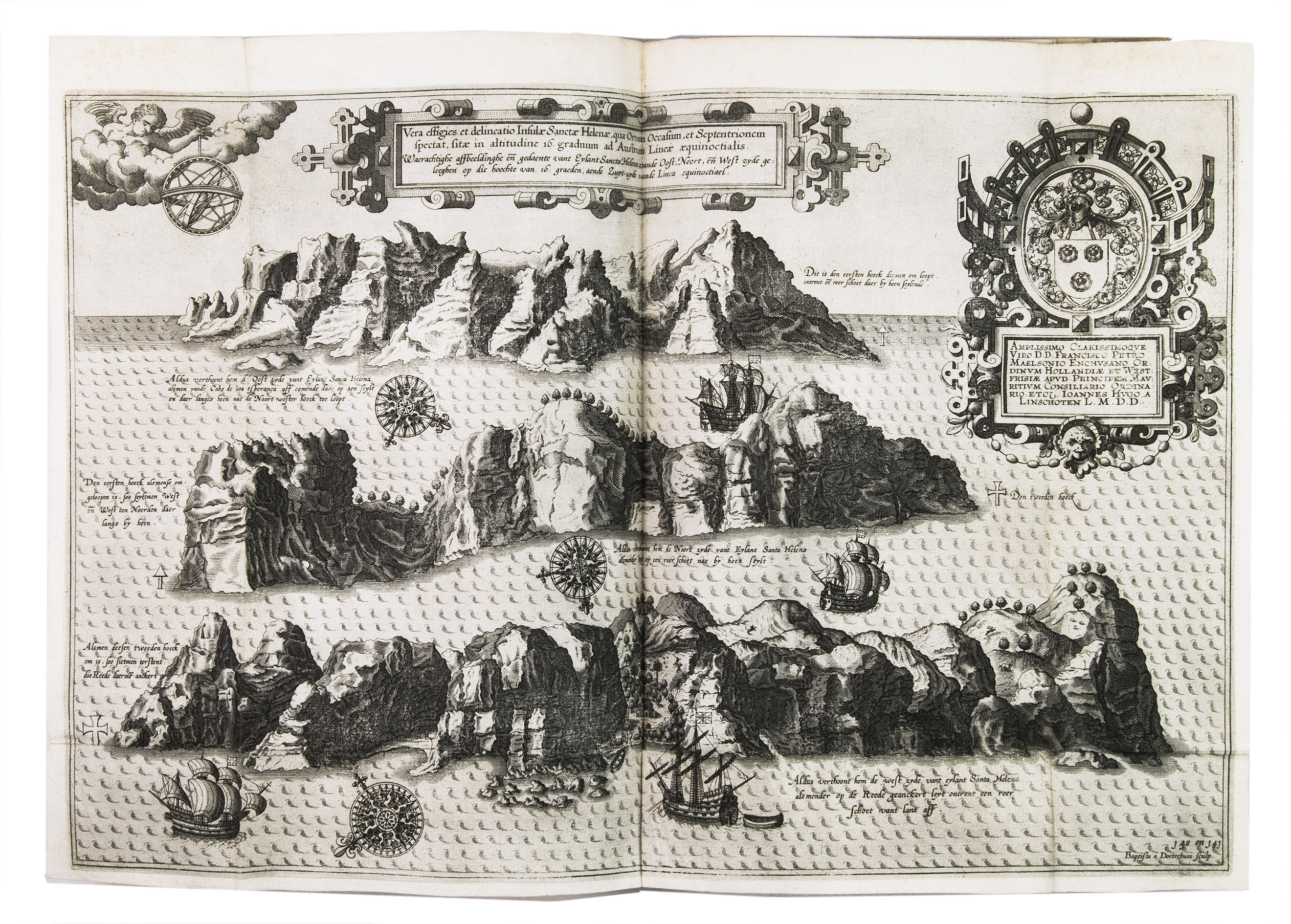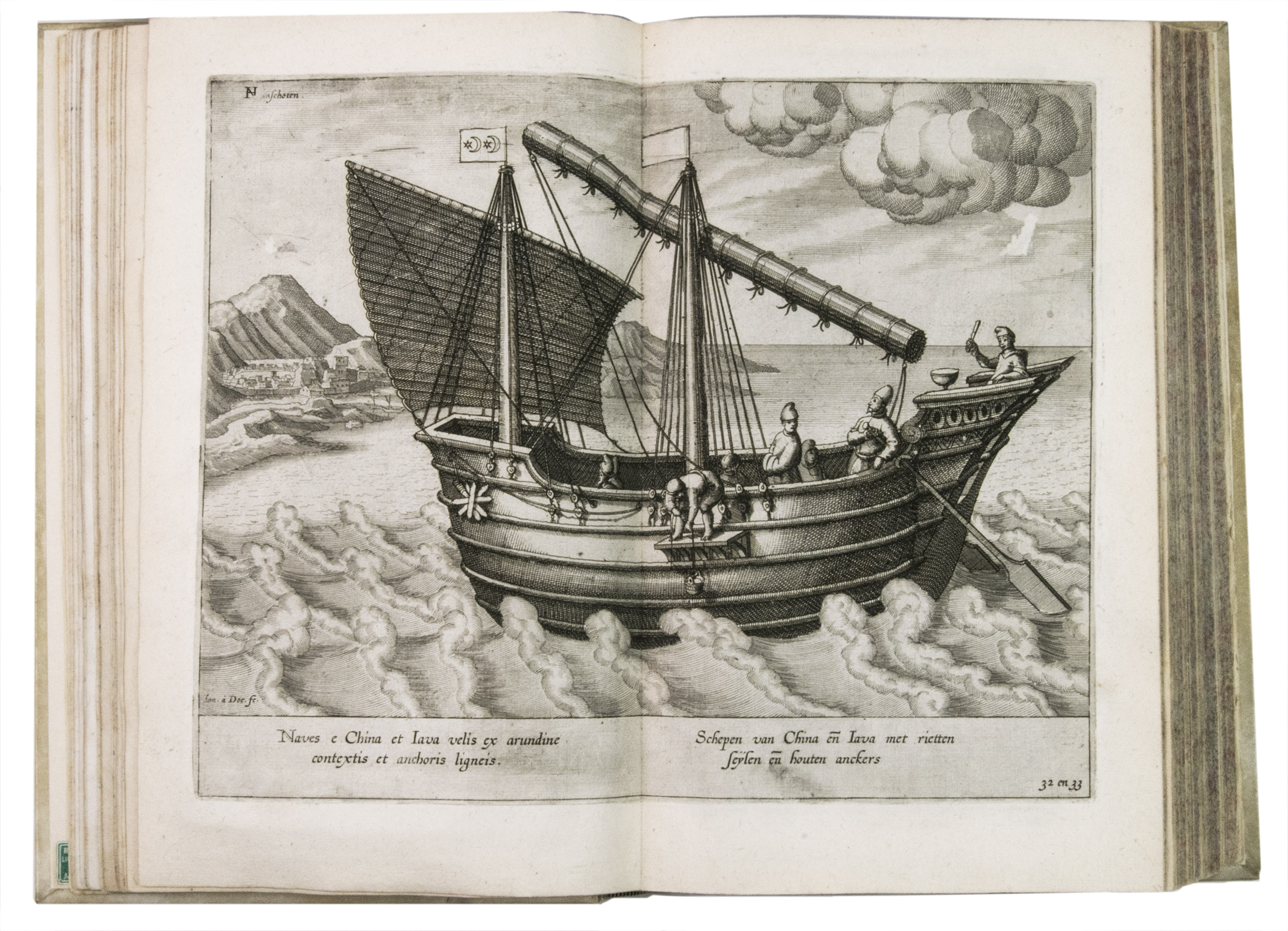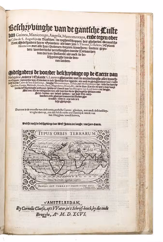 First edition in the original Dutch of one of the most important travel books ever produced. Also known as "The key to the East", it was the first printed work to include precise sailing instructions for the East Indies. This opened the way for both the Dutch East India Company (VOC) and the British East India Company (EIC), ending the Portuguese monopoly on the East Indian trade. "... this important work contains all the knowledge and learning related to the East and West Indies and navigation to those parts that was available at the end of the sixteenth century. It was held in such high esteem that for nearly a century a copy was given to each ship sailing to India as a guide to the sailing directions. The fact that most copies were in continual use is no doubt the reason that fine copies, especially with all correct plates and maps, are so very rare" (Hill). The present copy is complete with all maps and plates, and even includes the often missing instructions for the bookbinder.