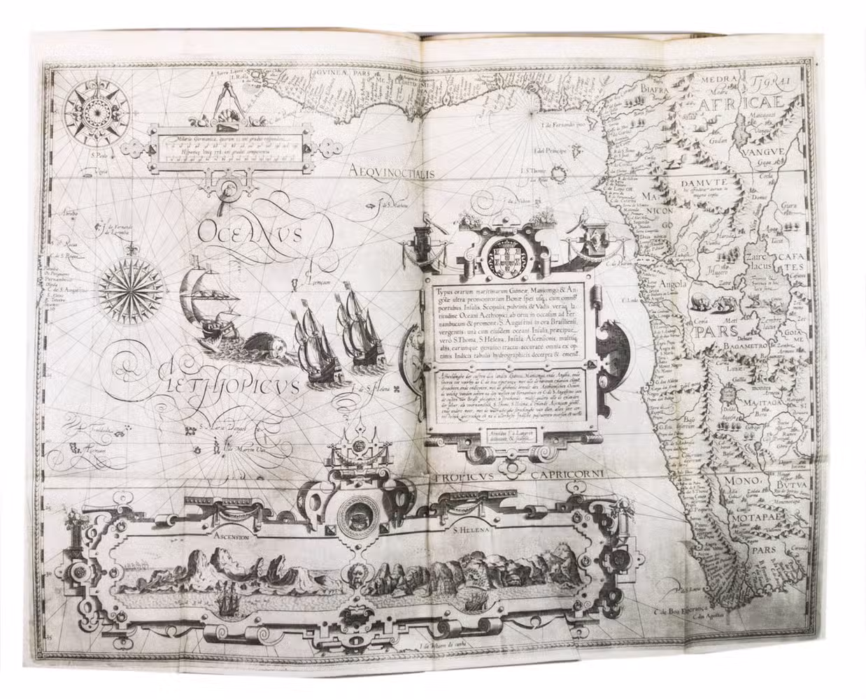 The work is divided into three parts, of which the second is further divided in two parts. The first part treats the East Indies, including eastern Africa and Arabia, and extending to regions as far east as Japan. The second, based on the discoveries of the Portuguese Royal pilot Diego Affonso, contains sailing directions from Portugal to India, and instructions for sailing in the East Indies, from island to island. Similar instructions are given for the New World, particularly Brazil and Spanish America. Part three contains detailed information on the taxes and other income that the King of Spain extracted from his territories, both at home and overseas. The final part, here present in its second issue, describes the navigation of the coasts of West Africa around the Cape of Good Hope to Arabia, together with the coasts of the New World.