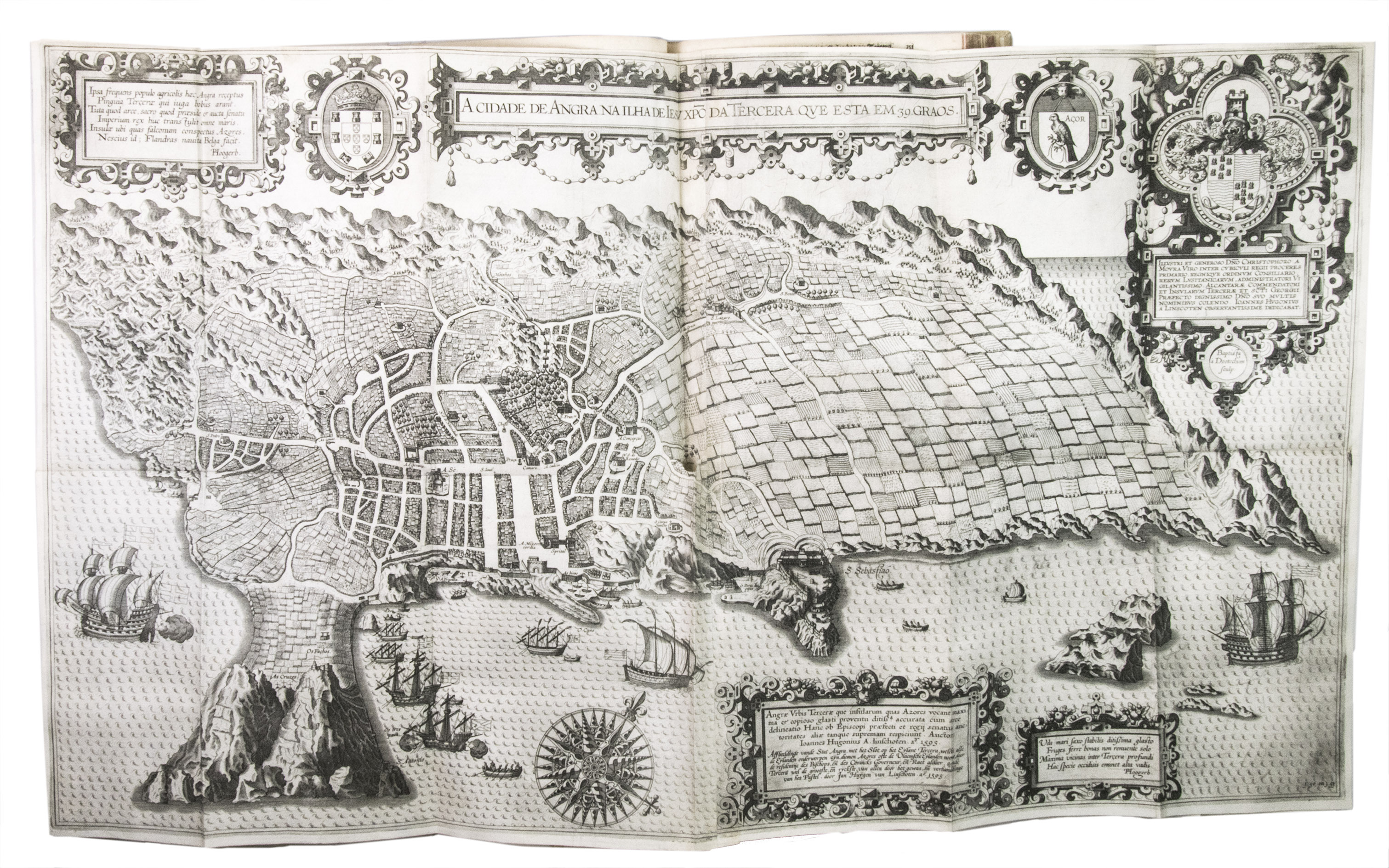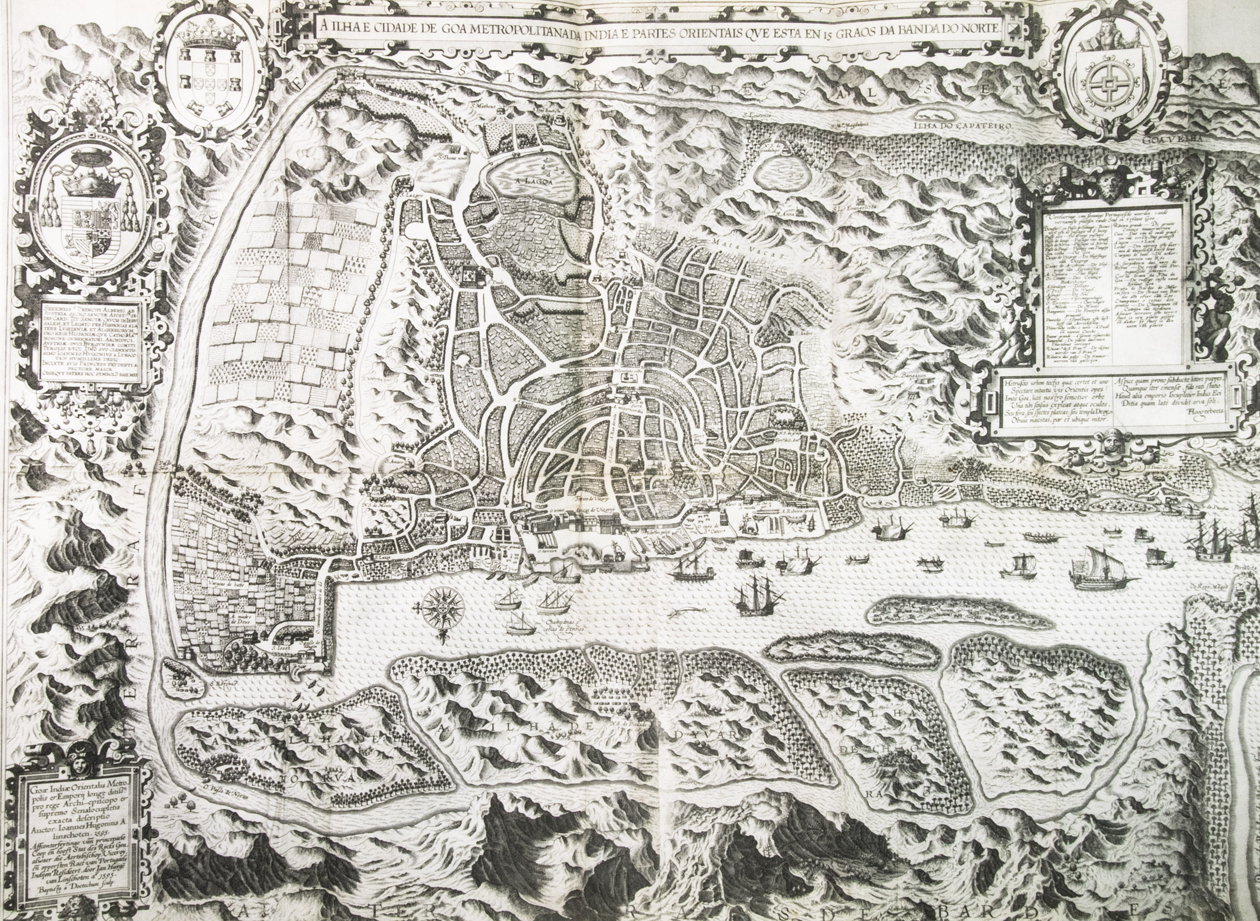Jan Huygen van Linschoten (1563-1611), merchant, adventurer and explorer, left his birthplace Enkhuizen in December 1576 to join his brothers in Seville. He spent six years on the Iberian peninsula, eventually taking employment with a merchant in Lisbon. There he came into the service of the newly appointed Archbishop of Goa, the capital of Portuguese India, Vincente de Fonesca. He set sail with the Archbishop for Goa in April 1583. Linschoten was in Goa for more than five years as secretary to De Fonesca, in which capacity he not only had easily access to many Portuguese portolans as well as other sensitive commercial information, much of which he copied, but he also travelled throughout the Malabar and Coromandel coastal regions. He left Goa for Lisbon in January 1589. His voyage, however, was not smooth: his ship was pursued by the English fleet and lost its cargo in a storm. After the loss of the cargo Linschoten was persuaded to stay and help to try to recover it and spent two years on Terceira, in the Azores, working and exploring. Linschoten eventually arrived in Lisbon early in 1592 and after having settled his affairs there, he set sail for the Netherlands.