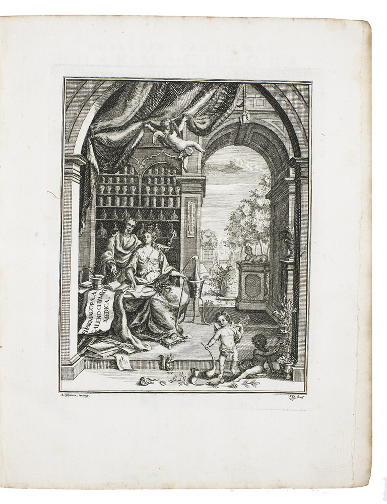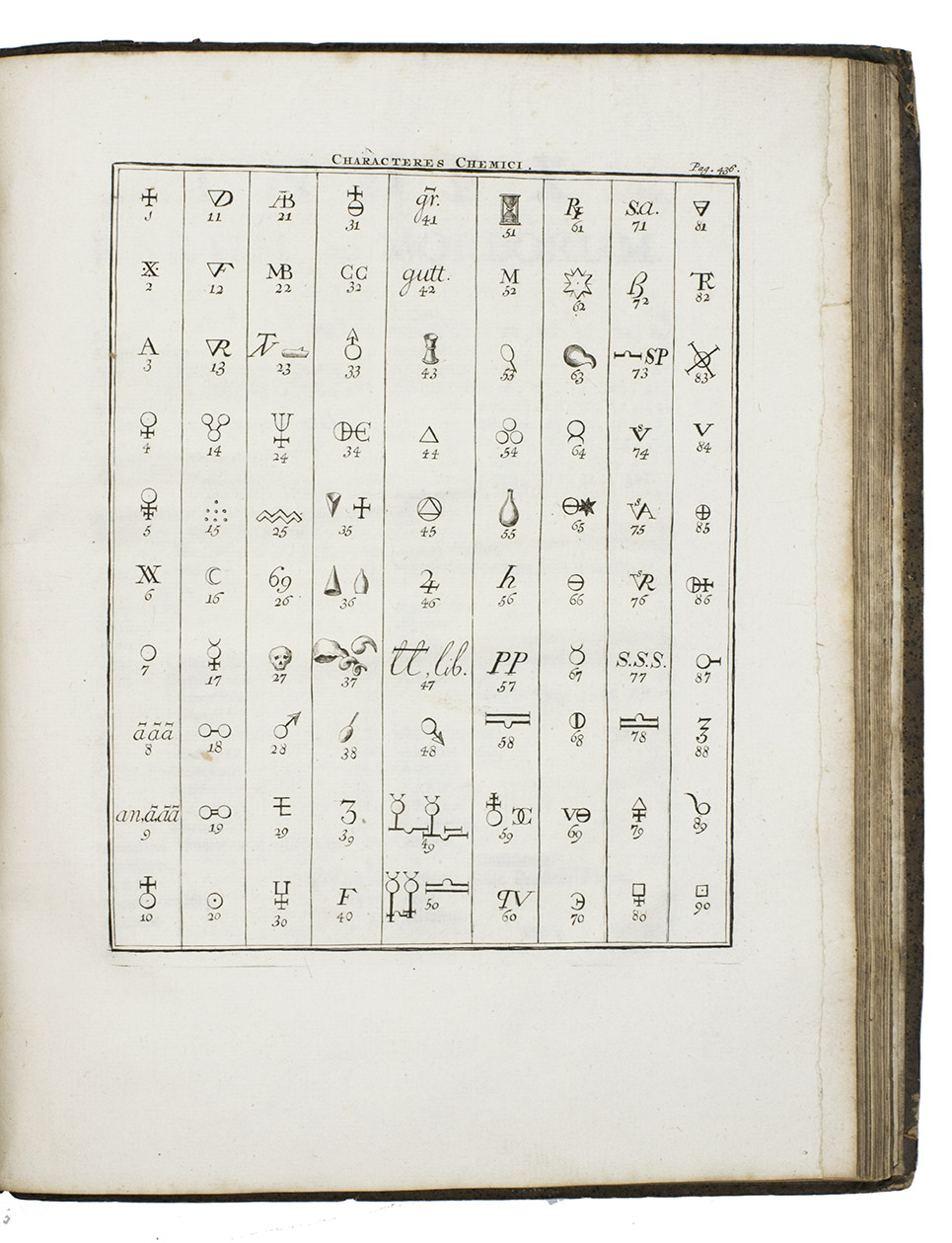 Amsterdam, Jan Morterre, 1764. 4to. With engraved frontispiece by V.D. after A. Hordyk, title-page in red and black, with vignette in a roundel: the sun surrounded by the motto "Herbarum subiecta potential nobis", one full-page plate with the chemical symbols, printed in two columns. Half calf , gold-tooled spine, spine label lettered in gold. [34)], 436, [60] pp.