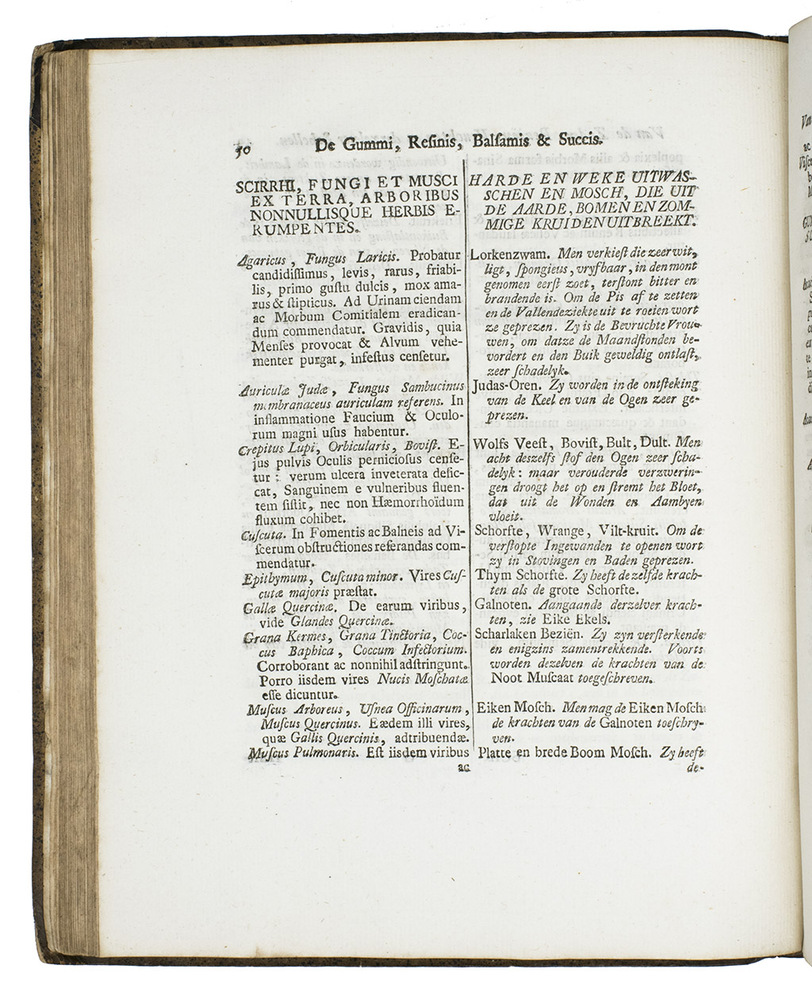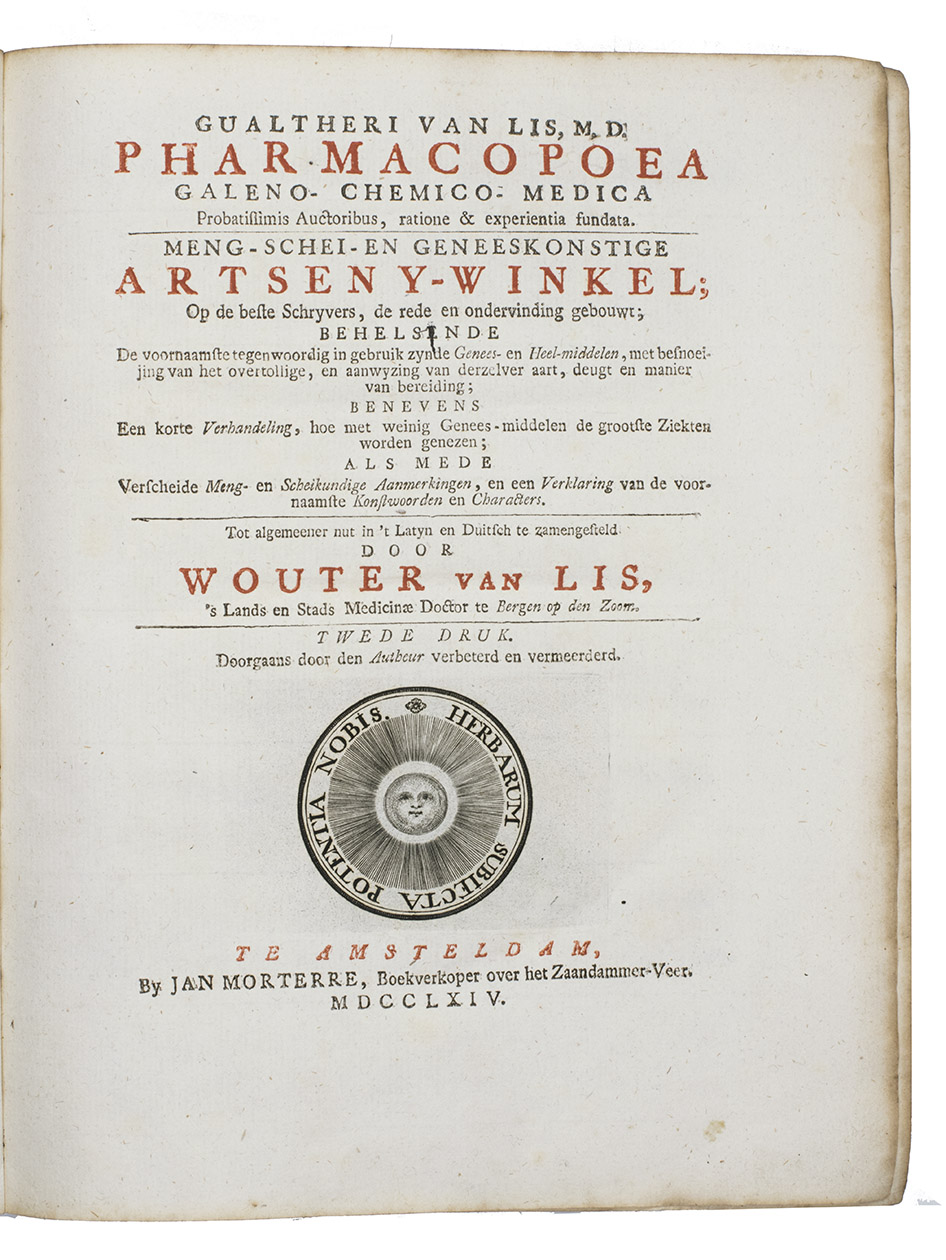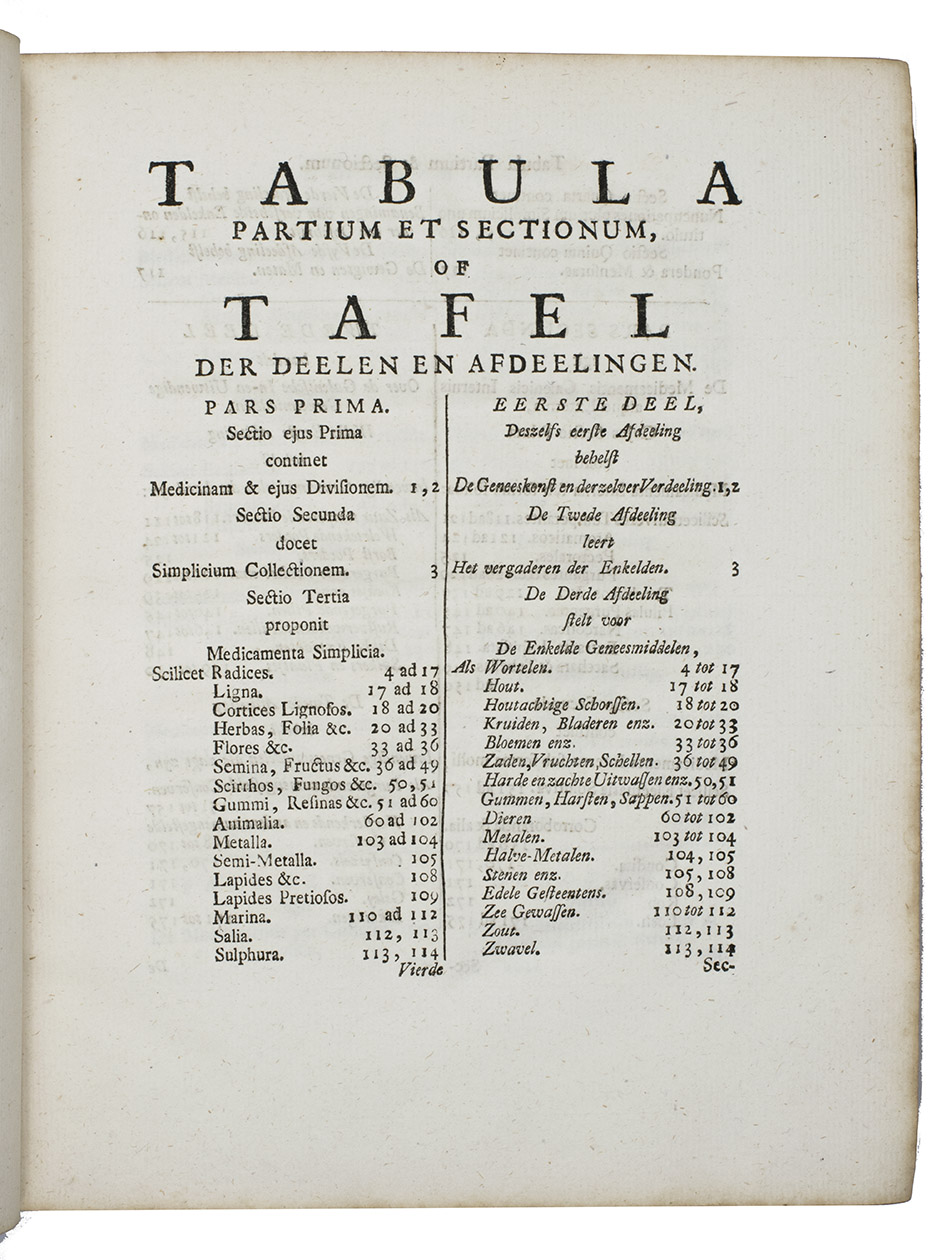 Second edition of an interesting pharmacological guide and recipe book in Dutch and Latin, the two languages printed in two columns facing each other. The first edition had been published in Rotterdam by Philip & Jakobus Losel in 1747. Though never formally designated as a standard by a government or medical institution, the defining trait of a pharmacopoeia, it nevertheless served as one in practice, not only in the Netherlands but also in Japanese translation, making it important for the introduction of European pharmacological knowledge into Japan. The book is divided into six parts: (1) simple drugs; (2) Gallenica, the medicines treated by Galenus; (3) Chymnica; (4) diseases; (5) practical information; (6) a glossary and chemical symbols. The manual gives a unique survey of 18th-century pharmacology and medicine in the Netherlands. Blake, p. 273; STCN (3 copies); Wittop Koning, Compendium ..., p. 80; cf. BMN I, p. 381 (1st ed.); not in Wellcome.