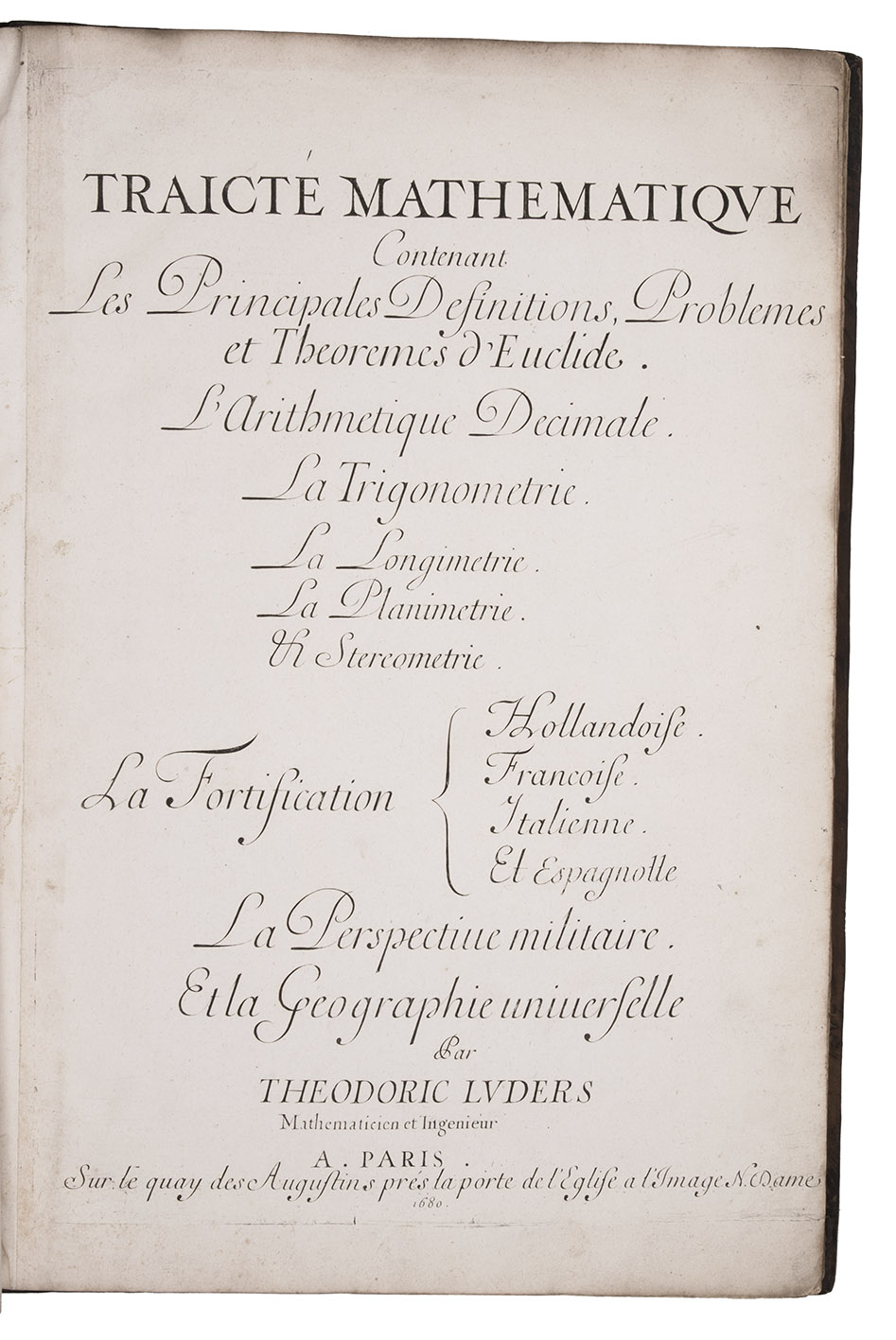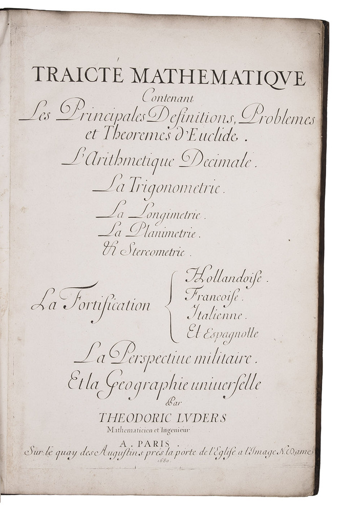 Traicté mathematique contenant les principales definitions, problemes et theoremes d'Euclide. l'Arithmetique decimale. . . . La fortification Hollandoise. Francoise. Italienne. Et Espagnolle.