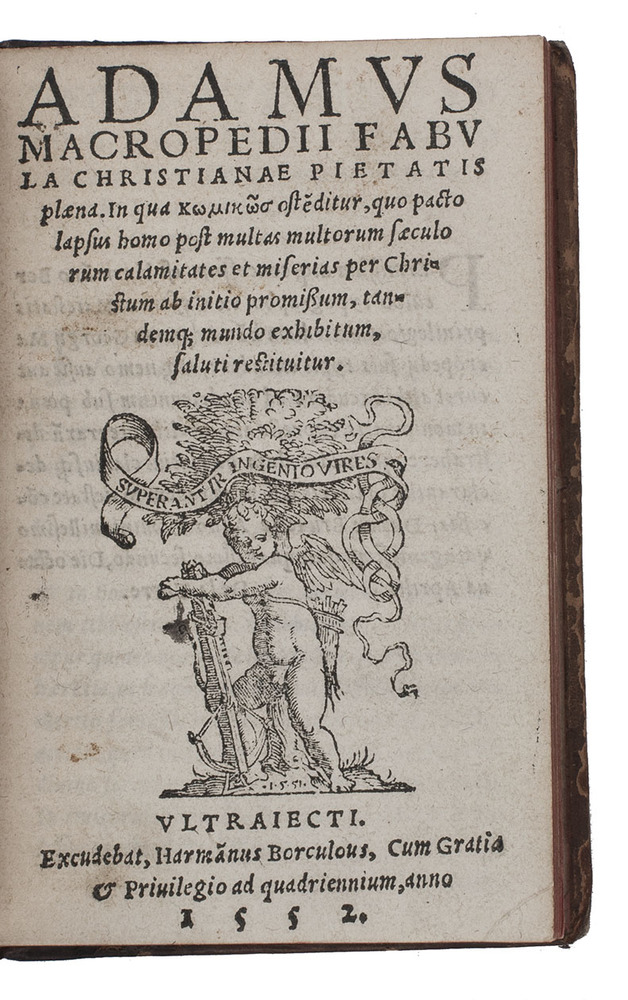 Ad 1: Very rare first edition of Macropedius's Adamus, a popular school drama on the history of mankind since the fall of man until the birth of Jesus. Macropedius's comedies and tragedies, inspired by the plays of Plautus and Terence, are outstanding specimens of Renaissance Latin school drama. These school dramas had an instructive function in humanistic education as well as the added advantage of familiarizing the pupils with Latin metrics and language through their participation in the performance.