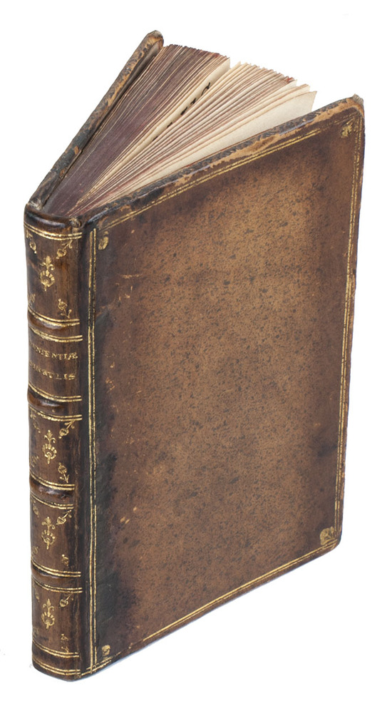 18th-century gold-tooled calf, with the title lettered in gold on the spine, a double fillet border on both boards with small gold-tooled ornaments at the four corners, red edges. [68]; [12]; [12] ll.