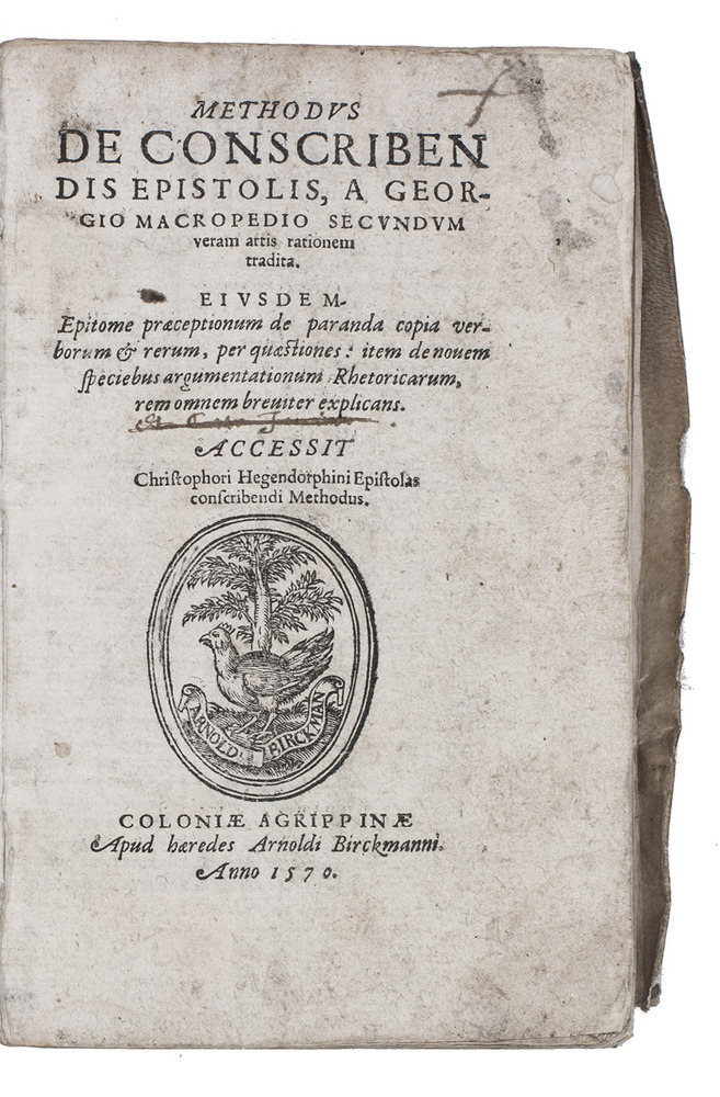 The second Cologne edition of two of the most important sixteenth-century textbooks on the art of letter writing, by Macropedius (along with two smaller works) and Hegendorf, often published together. Georgius Macropedius or Joris van Lancvelt (1487-1558) devoted a lifetime of hard work to teaching in the schools of the Brethren of the Common Life. By 1510 he had begun teaching at Bois-le-Duc and his Asotus, the first of the Latin School plays for which he is best known today, was composed there. Macropedius was ordained as a priest and went on to teach at Liege (ca. 1525-1529) and Utrecht (ca. 1529-1556). In addition to the twelve plays, he published Latin School songs and textbooks on grammar, dialectic and prosody (two of these smaller works are included in this edition).