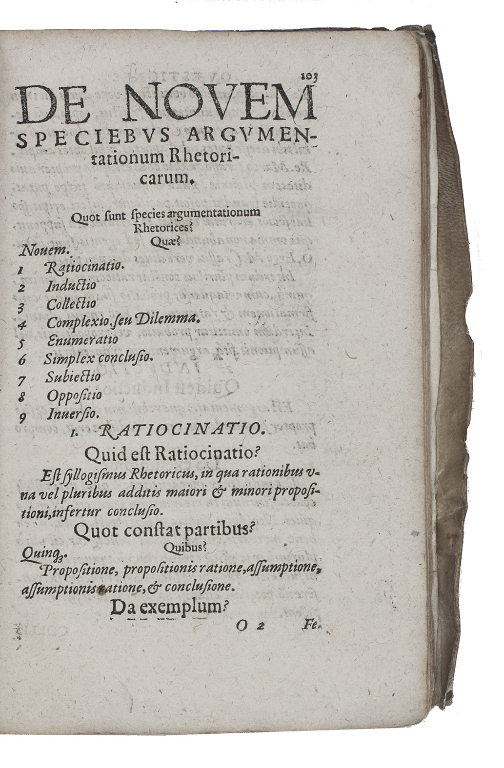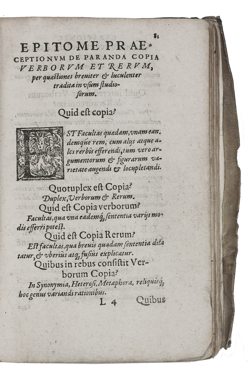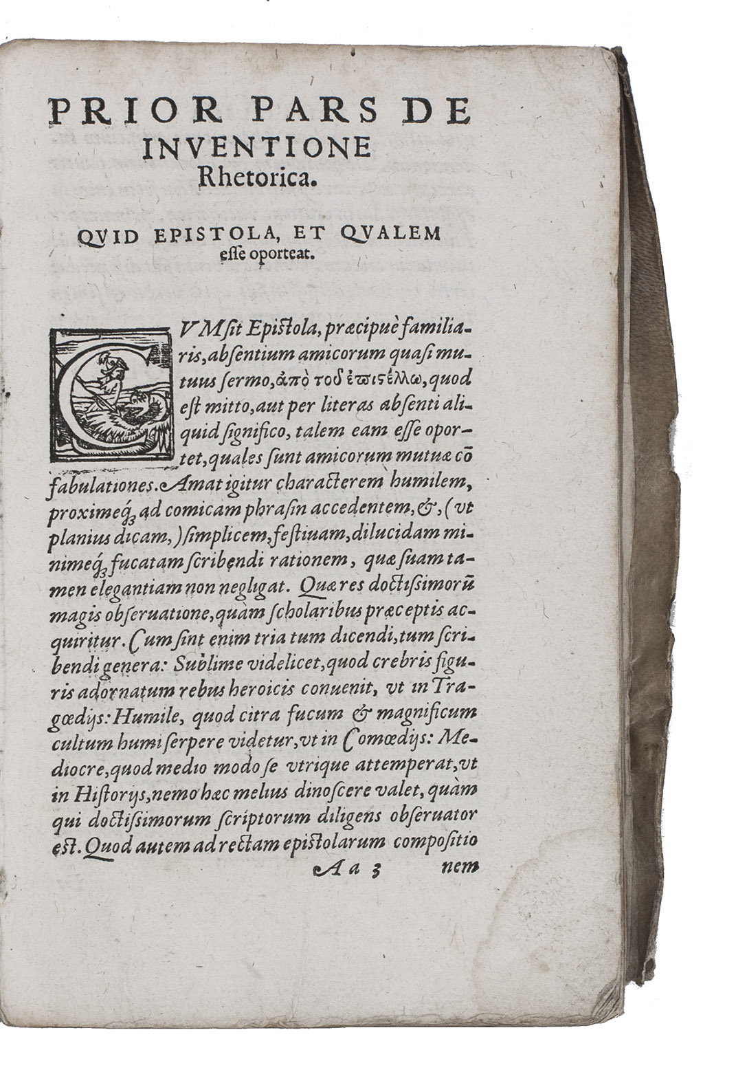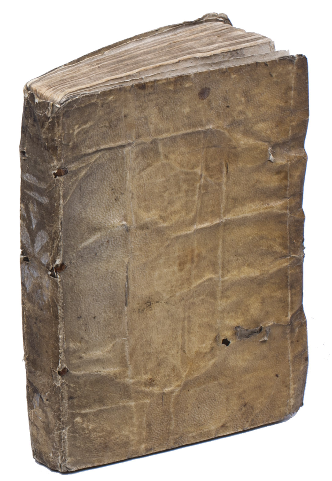 With an early owner's name struck through on the title-page, a couple marginal annotations and a few brief passages underlined. Ten lines of a sample letter concerning theology on P1v have been marked for cancellation and a blank slip pasted over them, but the text can still be read through the slip. With a tear along the fold of the title-page and a few small and mostly marginal worm holes, very slightly affecting the text in 2 quires, but otherwise in good condition, with the title-page slightly dirty and the corner of one leaf torn off, not affecting the text. It is nearly untrimmed, with an occasional deckle preserved. The binding is wrinkled, with a few small tears and lacking most of the ties. Adams M76; Bibl. Belg. M89; CLC M65; Jacoby, Georg Macropedius (1886) 11b; USTC 675855; VD16 L404.