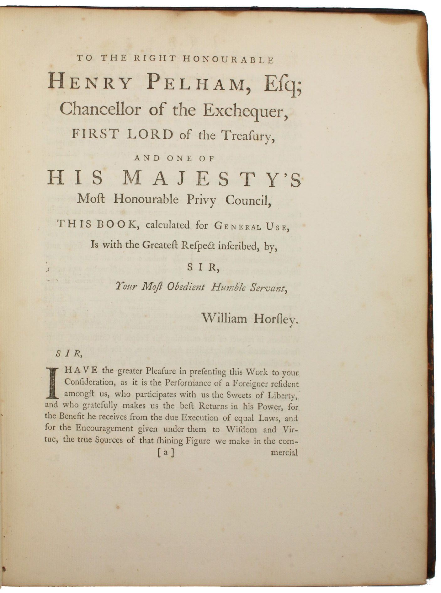 First edition of one of the earliest books to define modern banking in English, used as an important reference work by Adam Smith during the research for and writing of The Wealth of Nations, especially regarding the estimates of the precious metals imported into Europe; Smith cites its author as "Mr Meggens." Nicolas Magens (1697-1764) was a prominent 18th-century merchant, banker, and shipowner, and a pioneering figure in international trade. A native of the Duchy of Holstein, Magens moved to London in the 1730s, where he married a British wife and was naturalised in 1737 by a Private Act. Magens became particularly involved in the trade between Britain and the colonies in North America, and indeed was a leading proponent of the establishment of a free trade agreement between Britain and the American colonies.