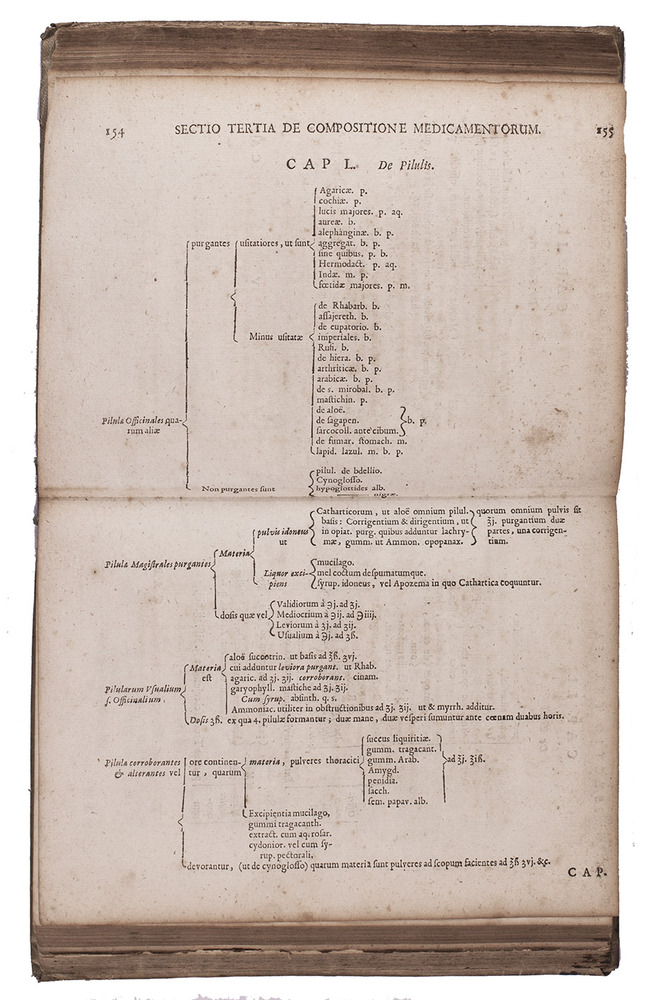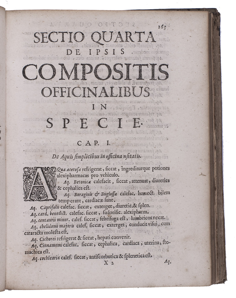 Second and best edition (2nd issue) of a detailed Latin handbook of pharmacology, written by the Leiden physician and lecturer in medicine and chemistry Christiaan Marggraf (1626-1687), first published in 1674 but greatly expanded by the author for the present second edition. The book contains hundreds of medicinal recipes, using ingredients derived from animals, plants and minerals (including metals), and is especially interesting for its attempt to classify medicines in hierarchical tables, just when John Ray in England was pioneering the hierarchical classification of plants that anticipated the Linnaean classification used today. The text is divided into four sections and is based on the physiological chemistry of Sylvius, which was beginning to displace the Paracelsian iatrochemical school, represented by Van Helmont, which had dominated medical chemistry for more than a century. The first section gives a general introduction and discusses the theory of both simple and compound medicines. The second discusses the preparation of ingredients. The third (with the hierarchical tables) and fourth (with most of the recipes) discuss compound medicines. There is also a 3-page table of contents and a 22-page index.