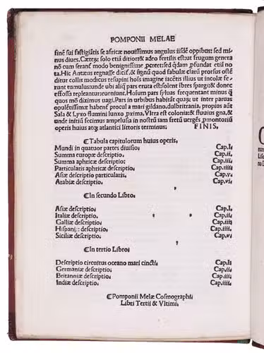 Rare 1502 edition, the third in the best and most important early recension of Pomponius Mela's description of the world, written ca. AD 43, the earliest surviving geographical work in Latin and one of Pliny's most important sources, perhaps the most important for geography. Pomponius describes Europe, Africa and Asia, the three together surrounded by the ocean. He was at born in southern Spain (we don't know where he wrote) and shows a more detailed and more accurate knowledge of Spain, France and the British Isles than earlier writers (giving us our first known reference to the Orkney Islands) and even knows of the existence of Scandinavia. But he also devotes book I, chapter VI to "Arabia", which includes not only the Arabian peninsula but also "Syria" (which includes what is now Iraq) and other parts of the Middle East, and his description of India in book III, chapter IV, gives further information about what seem to be the Arabian and Iranian coasts of the Gulf, Egypt, Iraq, the island of Masirah and the cities of Aden and Harran.