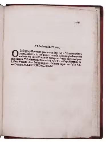 [Venice], (colophon: printed by Albertino da Vercelli, 14 May 1502). Small 4to (20.5 x 15.5 cm). With printed guide letters left for manuscript initials (not filled in). Gold-tooled red half sheepskin (ca. 1820?). XXIIII ll.
