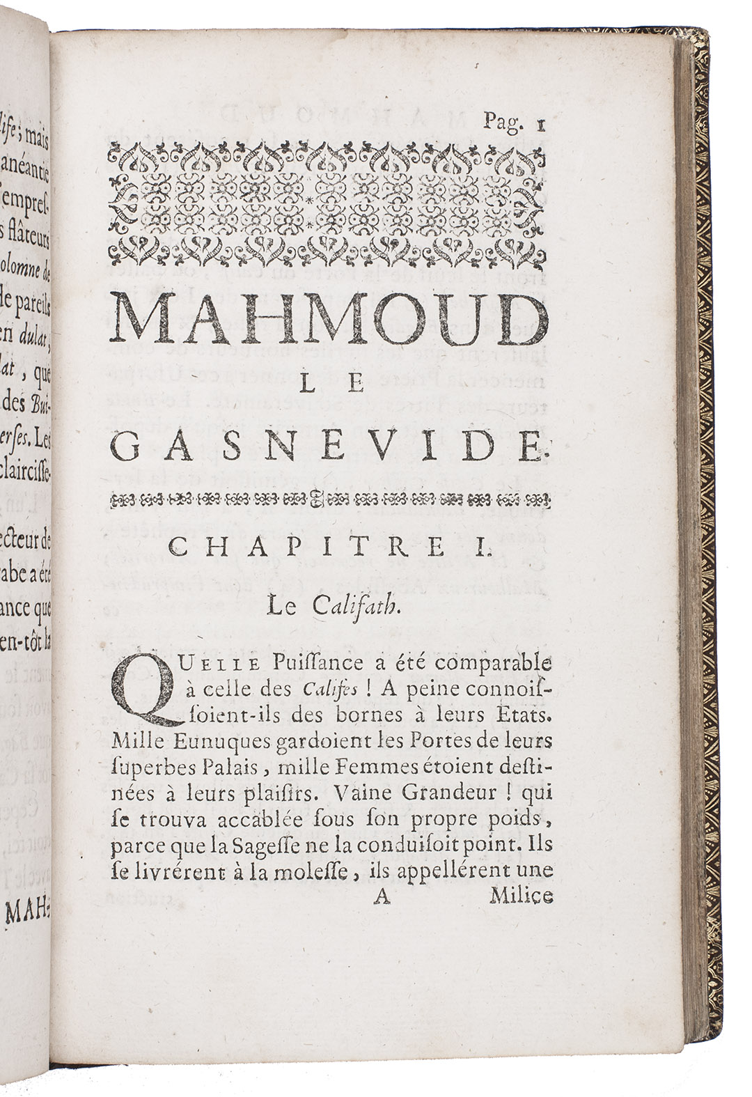 Second edition, in the original French, of an allegorical novel satirizing the establishment of the Régence, the period just after King Louis XIV's death, when Louis XV was still a minor and France was ruled by the regent Phillipe d'Orléans. The novel incorporates the most important figures during the Régence, but they have been given oriental names. The author, Jean-François Melon (1675-1738), states he translated it from an original Arabic text, but actually wrote the novel himself.With the coat of arms of Louis-Marie Alexandre, Duc d'Aumont (1736-1814) in gold on both boards. With some marginal water stains. Overall in good condition. Cioranescu 44265; Olivier 364/1.