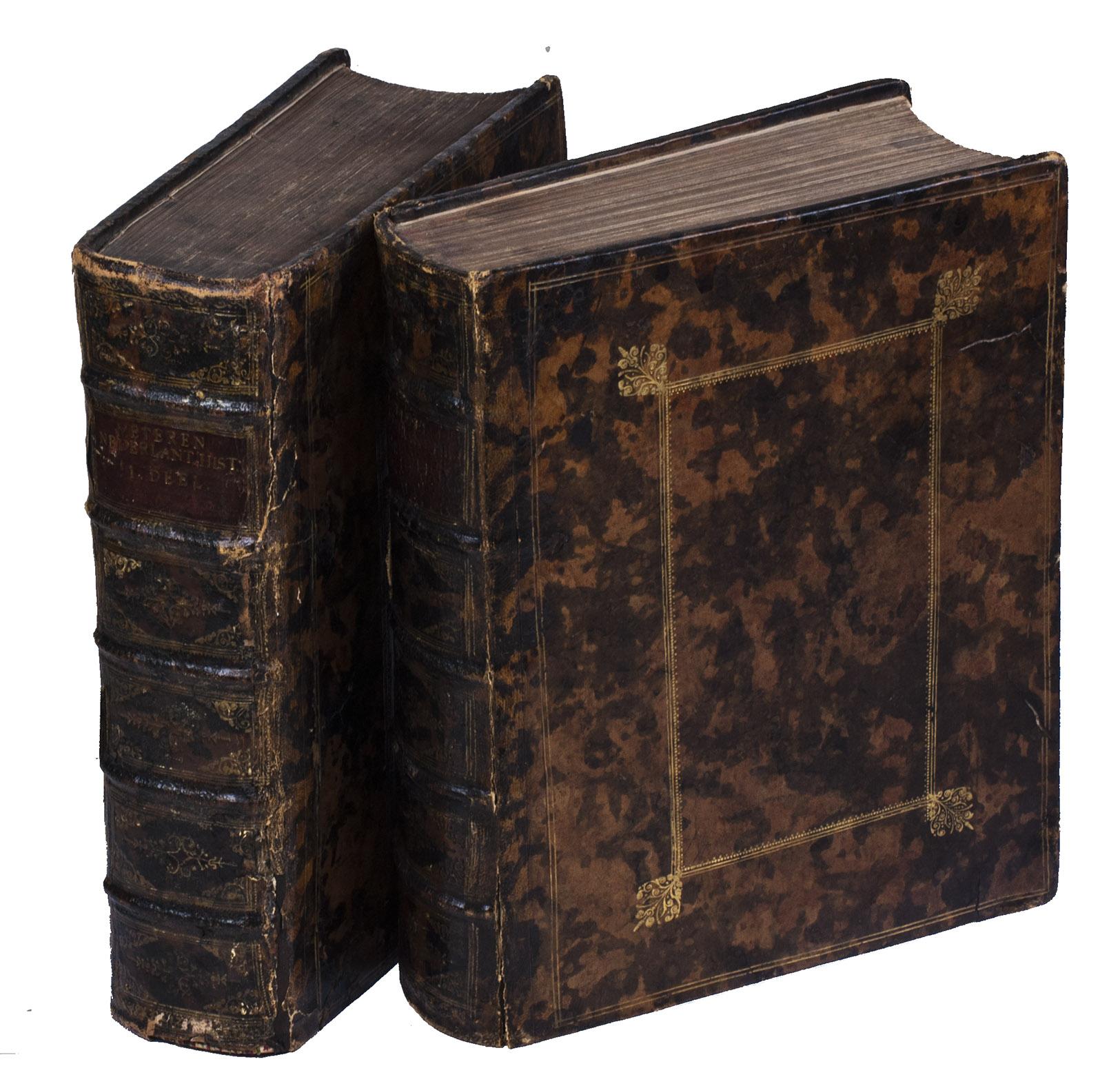 The two title-pages have been interchanged, probably when the binding was revised and repaired. With some browning, a few tears (minor except vol. 2, part 2, 3O2), the running heads of about 4 leaves very slightly shaved and a few minor marginal water stains, but still generally in good condition. The bindings were repaired and revised at an early date, but have since developed some cracks in the hinges, and the mottling of the calf has caused some cracks and flaking, but they are otherwise in good condition. Very rare last issue, with additions and revisions of the first complete 4to edition of a great historical chronicle of the Netherlands at the dawn of it golden age.