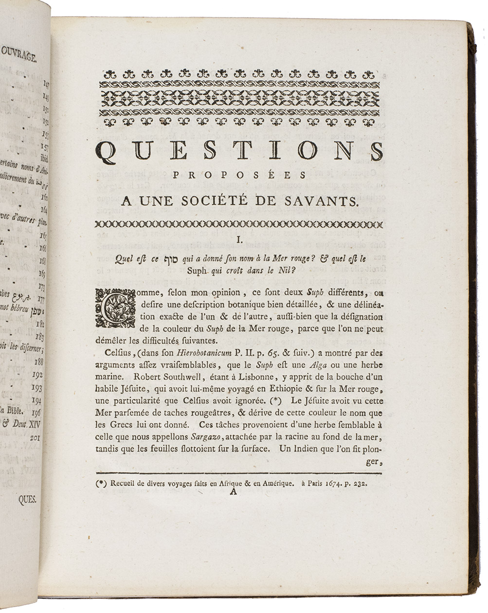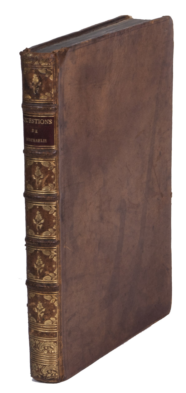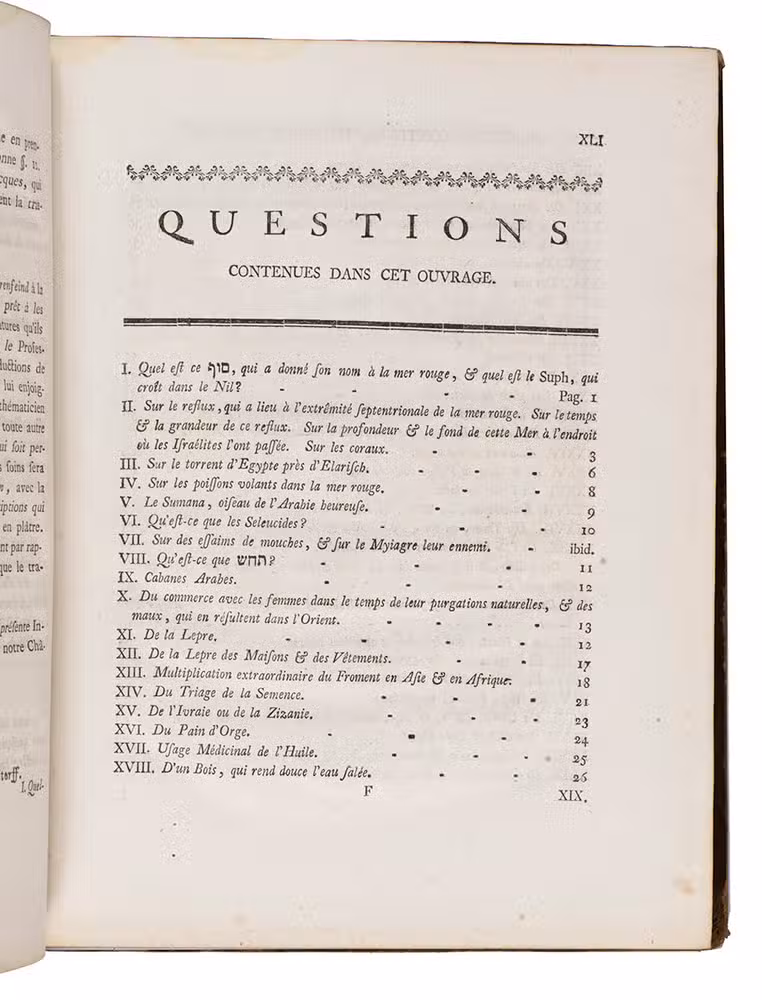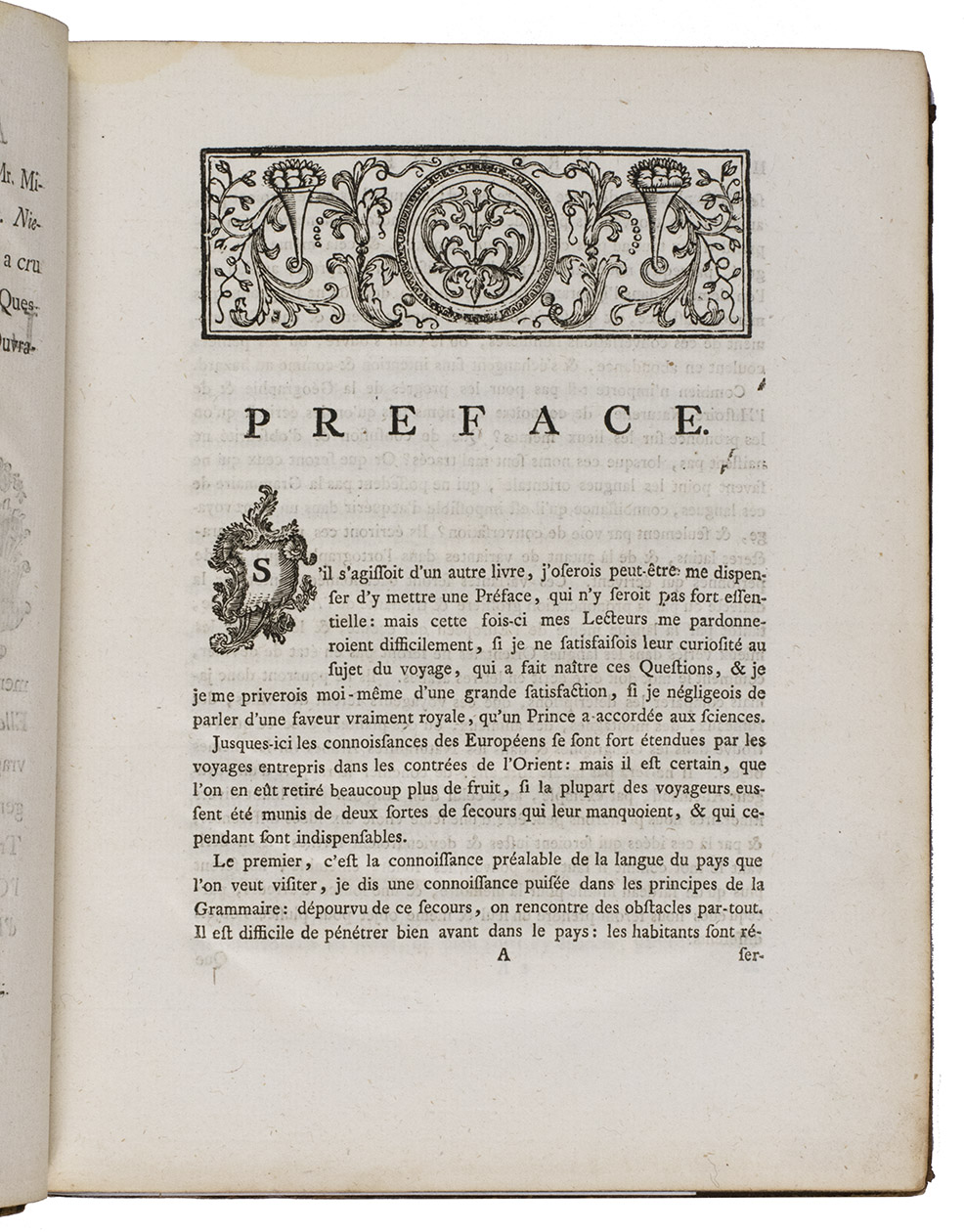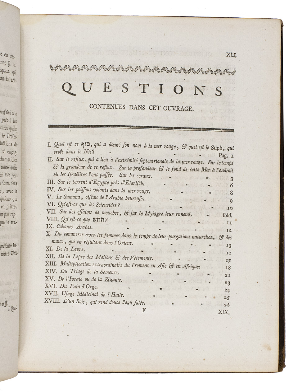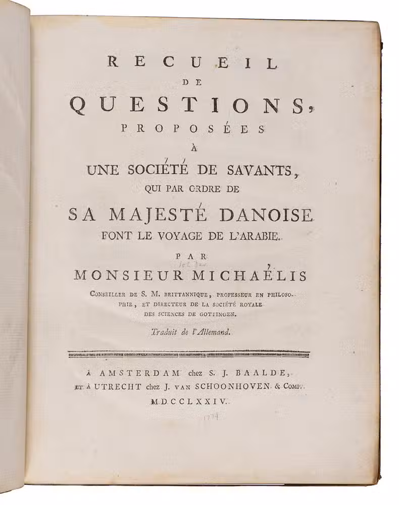 Hans Bernhard Merian's French translation of Michaelis's Fragen an eine Gesellschaft gelehrter Männer (1762), prepared during the early stages of Carsten Niebuhr's Danish expedition to the Middle East. It is the first edition in any language to be printed in the Netherlands. Johann David Michaelis, a famed German Orientalist and theologian, was one of the scholars who prompted the important Danish expedition to Egypt, Arabia and Syria (1761-1767), led by Carsten Niebuhr. Michaelis hoped to investigate the relationship of the southern Arabic dialects to Hebrew, and to verify obscure botanical and zoological information in the Bible. For this purpose he composed the present 100 "questions". It includes the instructions for the expedition by Frederick V of Denmark, a 35-page account of Yemen and an extract of Carsten Niebuhr's account of Arabia (not included in the first French edition of 1763).