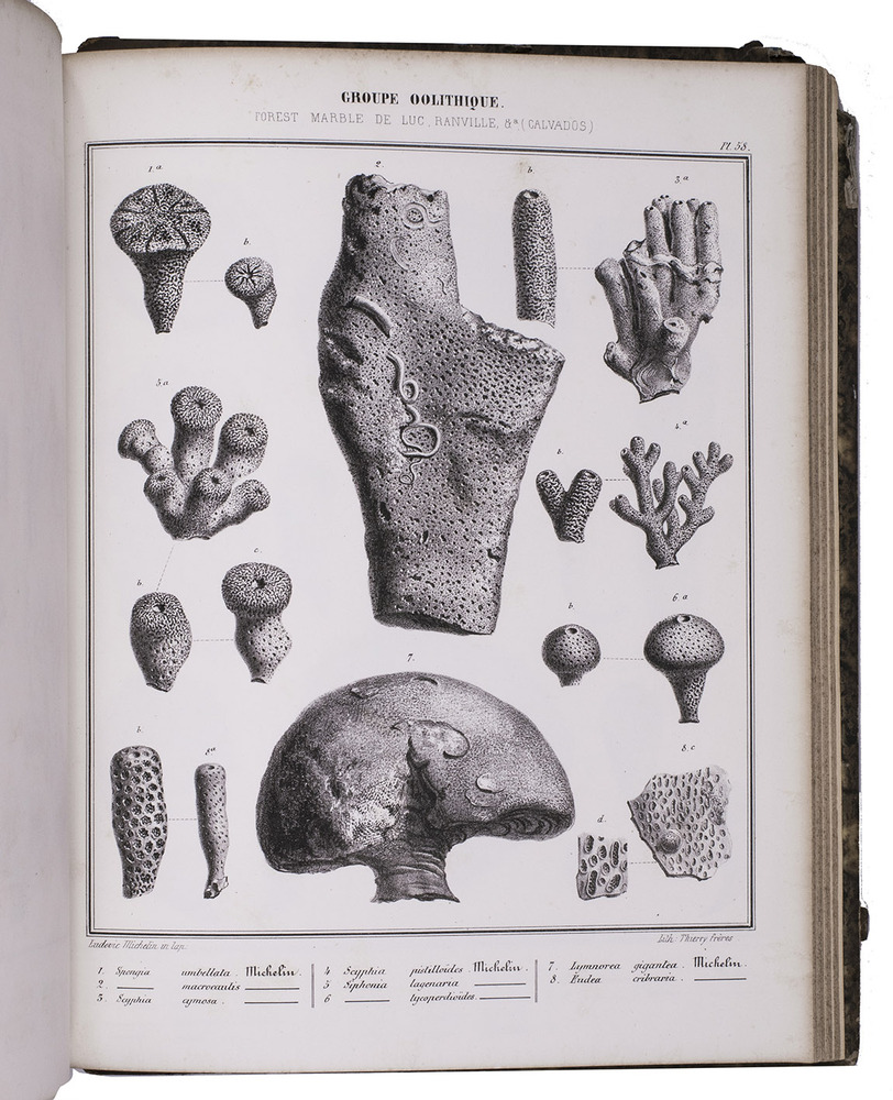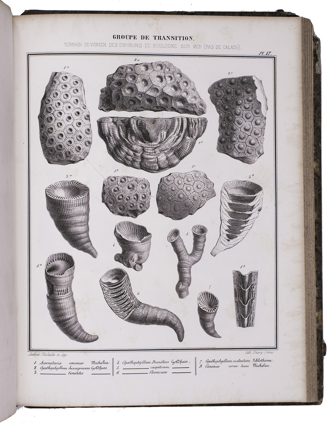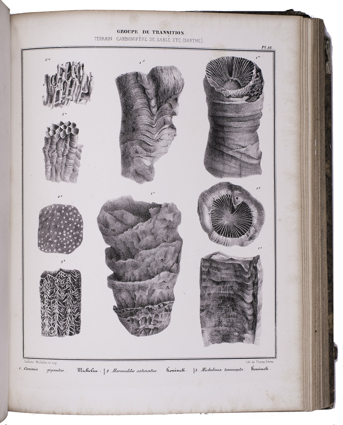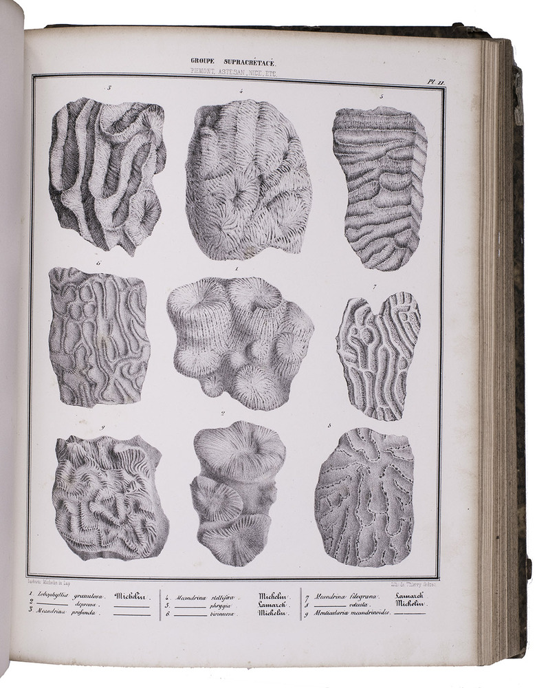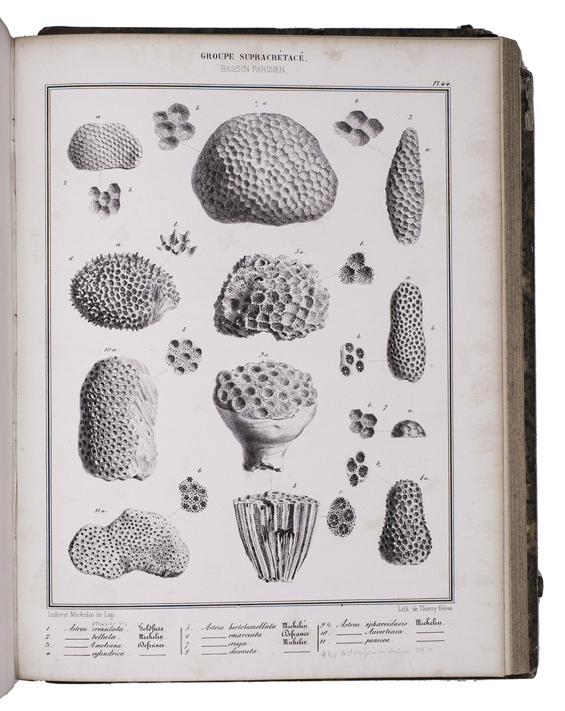 Rare first and only edition of a monograph on fossils of coral polyps in France. Coral is made by millions of tiny invertebrate carnivorous animals called polyps. After their death hey leave behind a limestone deposit, which forms the foundation for a next polyp. Fossil reefs are preserved as limestone prominences of many different ages.