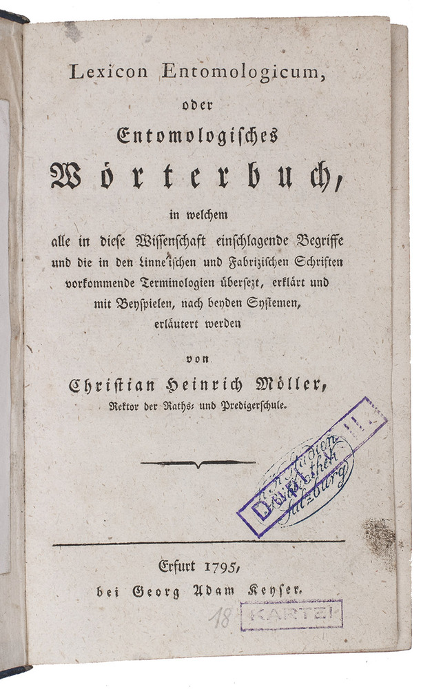 First edition of an entomological dictionary, compiled by Christian Heinrich Möller. It lists the Latin nomenclature of numerous words commonly used when describing insects, followed by their German translations. The book opens with an introduction and closes with a register.
