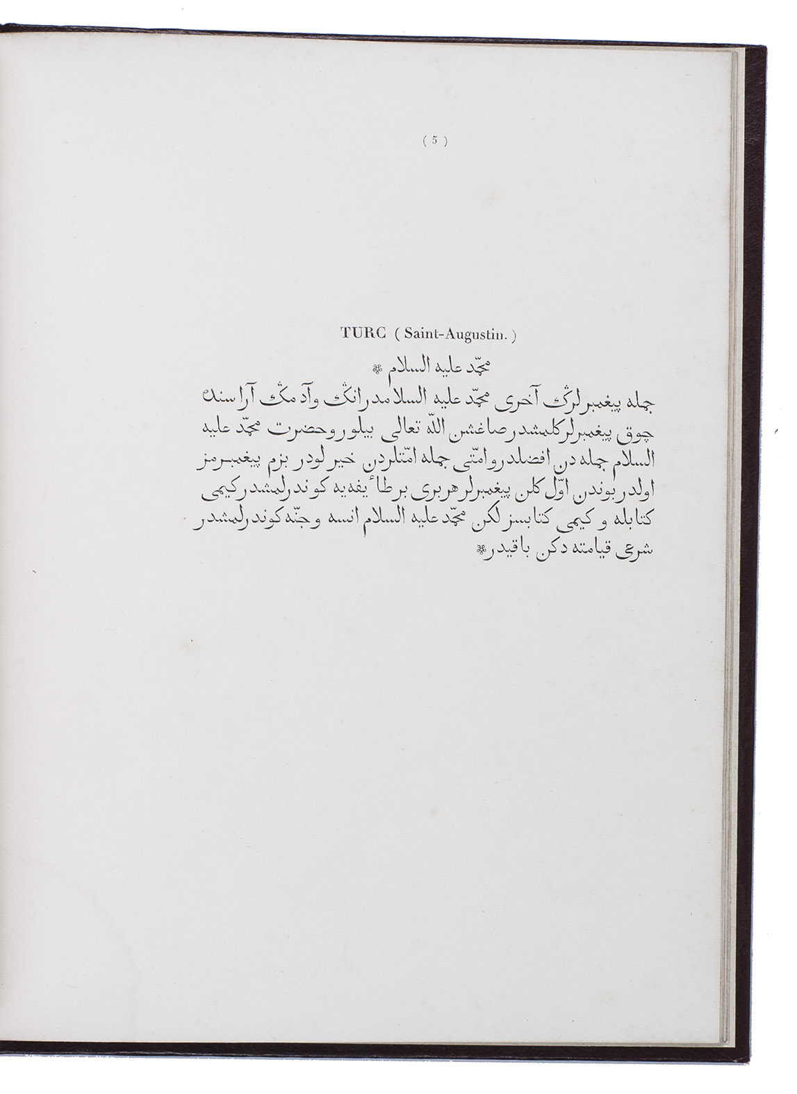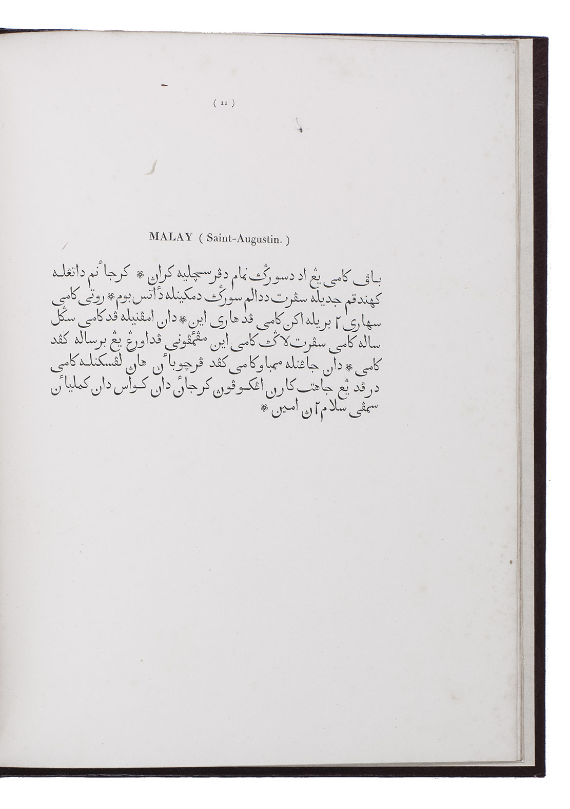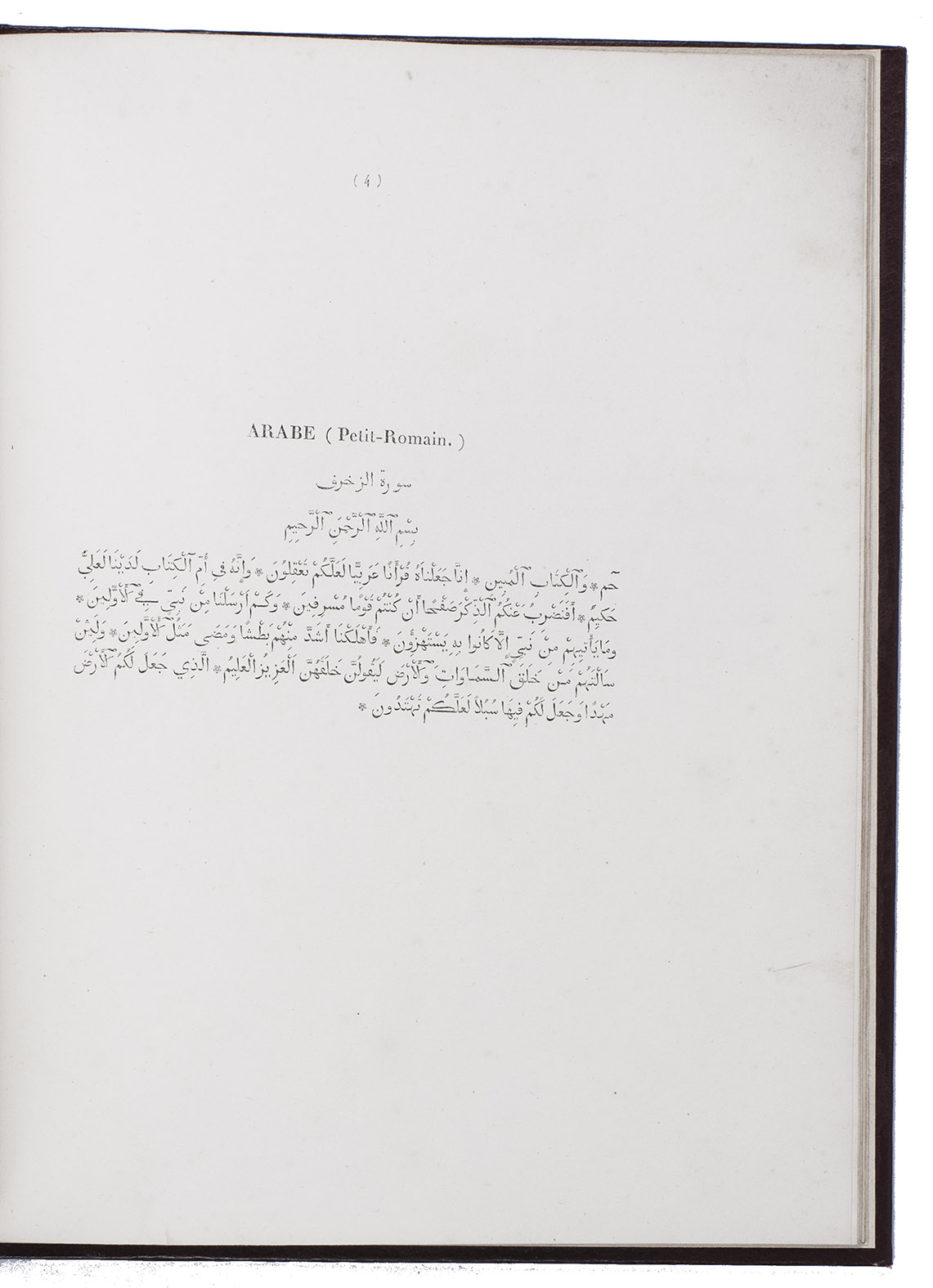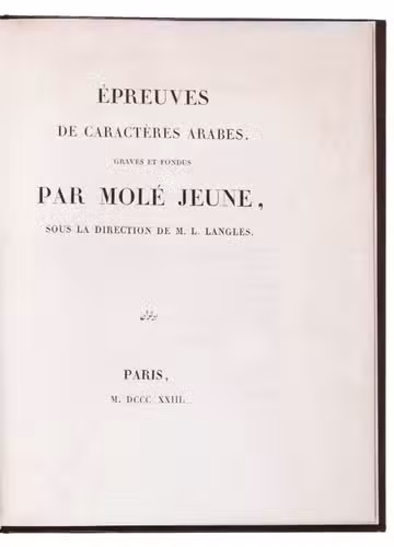 Type specimen of 2 Arabic types cut by the leading Paris punchcurtter Joseph Molé (1775-1841?), known as Molé jeune. Molé cut 2 sizes of Arabic (Saint-Augustin and Petit-Romain), including sorts for Turkish, Persian, Hindustani, Malay, Pashto (Afghani), also included in the present specimen. The work consists of a title-page, a brief foreword and 12 leaves of specimens to show passages in all six languages for each of the two types. The types were cast on the named bodies (about 14 and 10 point) , but were set with separate vowel points, the type with vowel points measuring about 161 mm/20 lines or about 24 point (Grand Parangon) and about 118 mm/20 lines or about 17 point (Gros Romain). Molé cut them under the guidance of the orientalist Louis-Mathieu Langlès (1763-1824) and they first appeared in the present work.